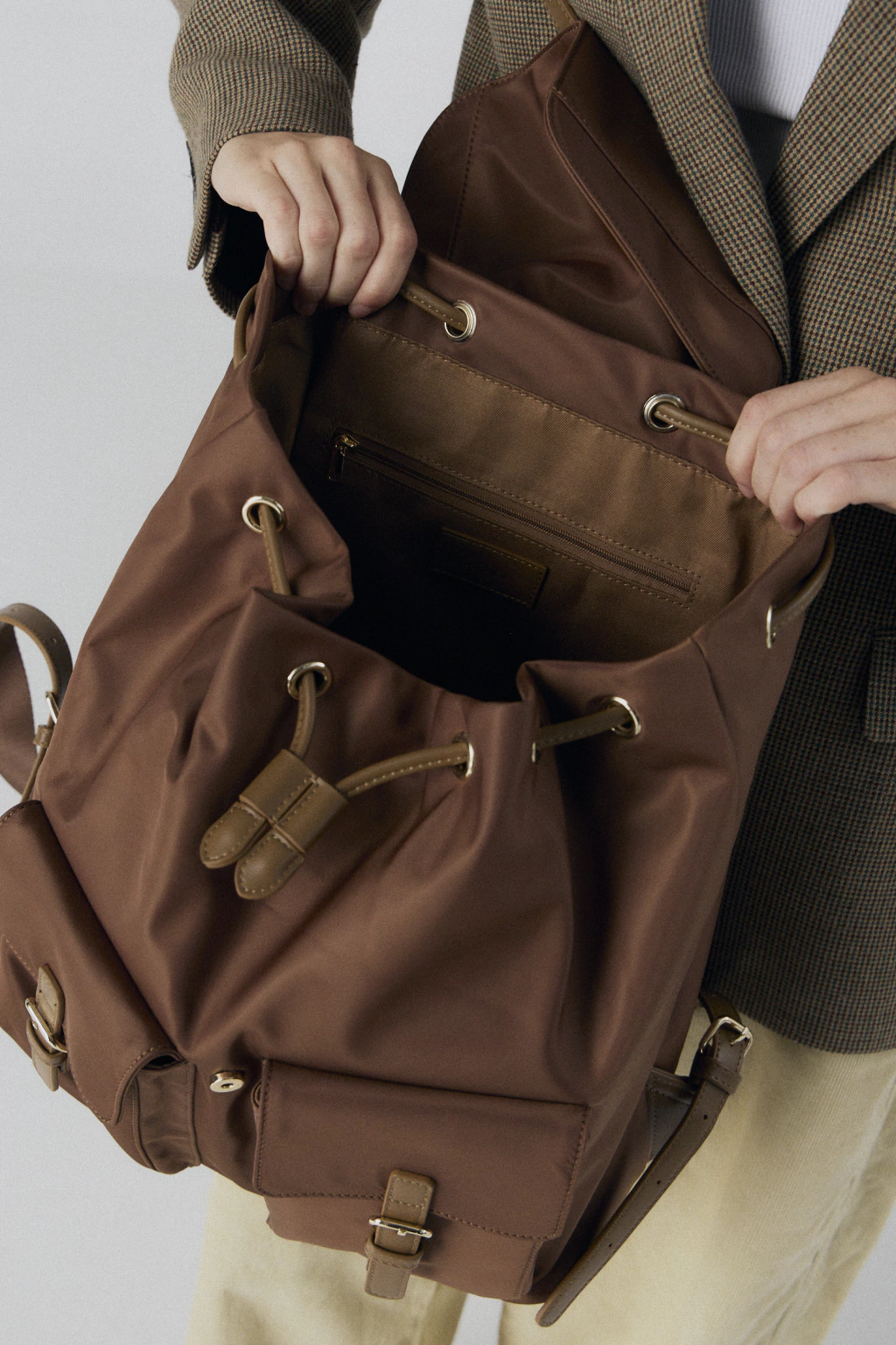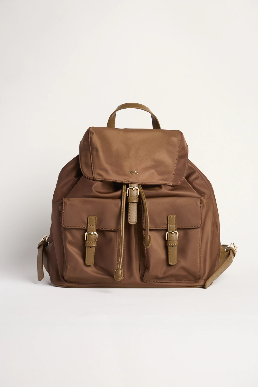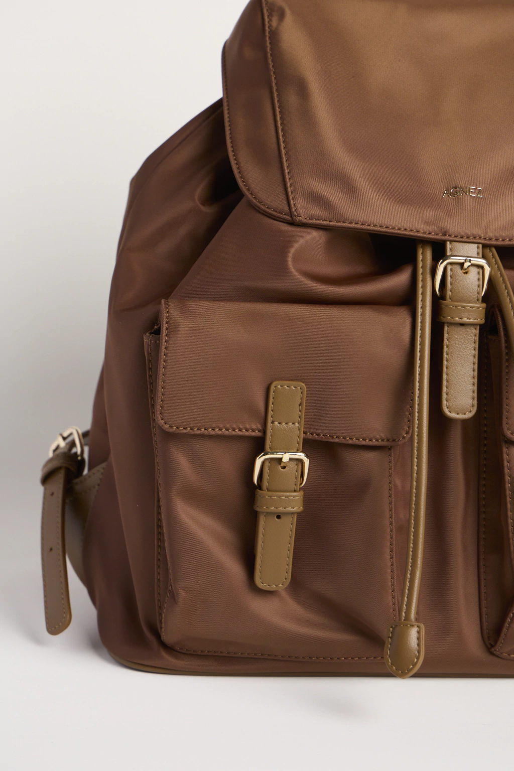 Confeccionada en nylon de acabado satinado con detalles en cuero ecológico, cuenta con un amplio compartimento principal con cierre de cordón y tapa imantada, bolsillos frontales con hebillas que aportan carácter y seguridad para mantener tus esenciales siempre organizados.