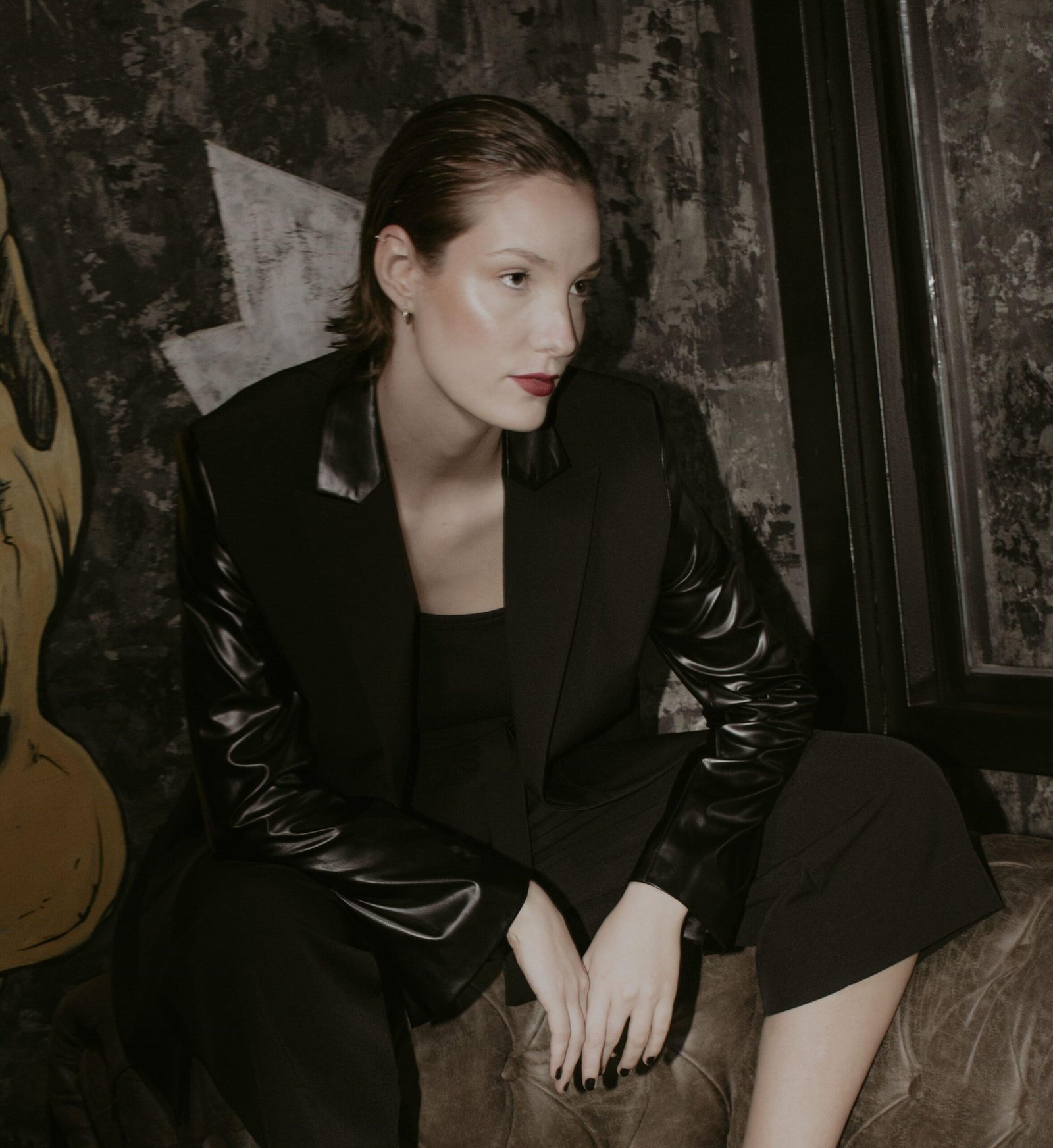 Blazer crepe sastrero corte over, mangas eco cuero, solapa combinada con eco cuero y bolsillos laterales