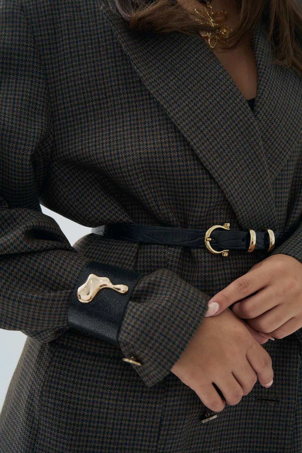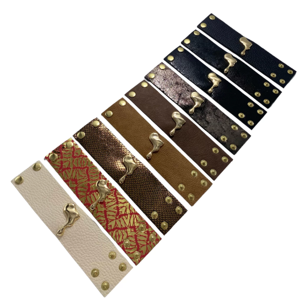 Brazalete de cuero 100% con aplique central color dorado y cierre mediante doble tacha. 5 cms de ancho