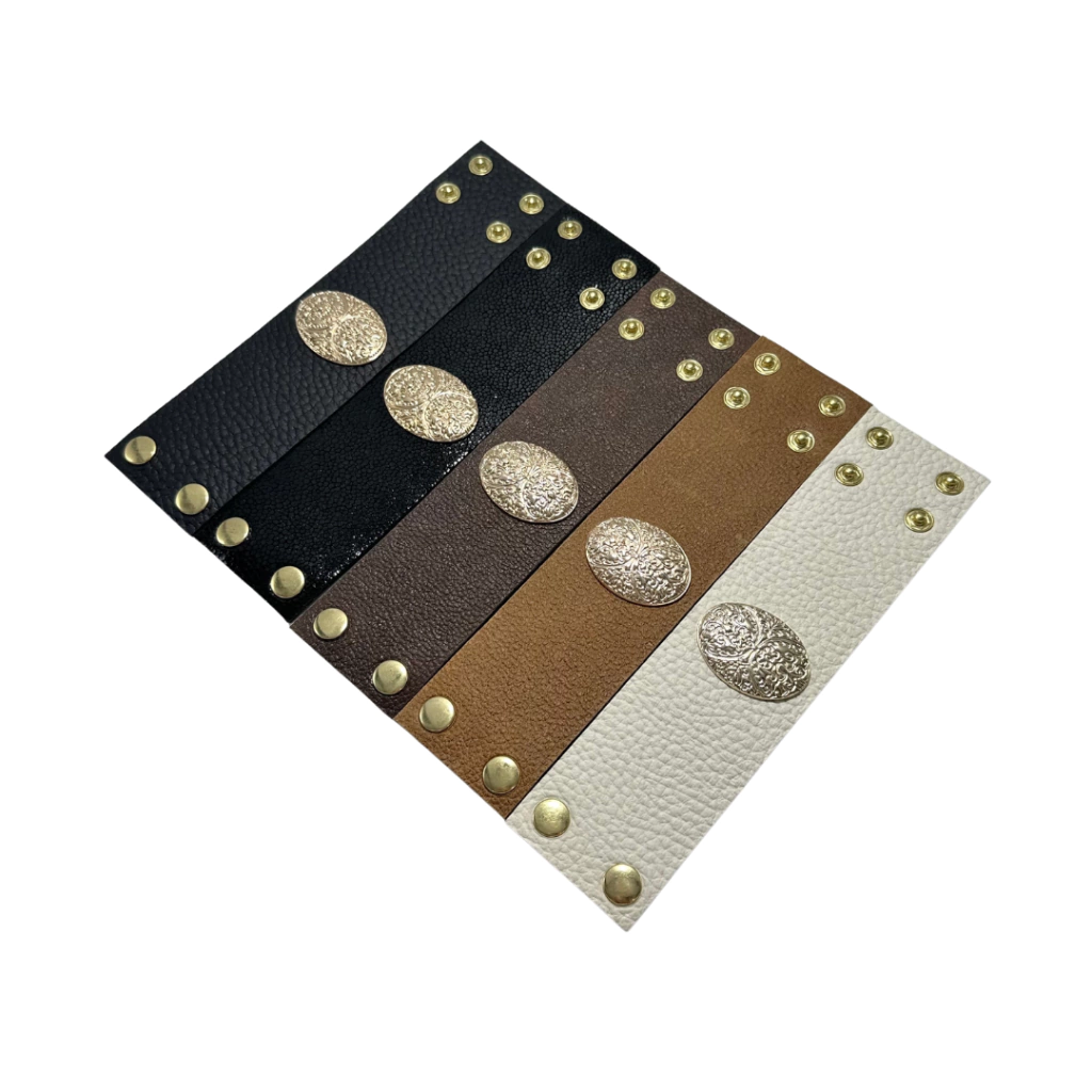 Brazalete de cuero 100% con aplique central ovalado labrado color dorado, con broches regulables en dos posiciones. 5 cms de ancho