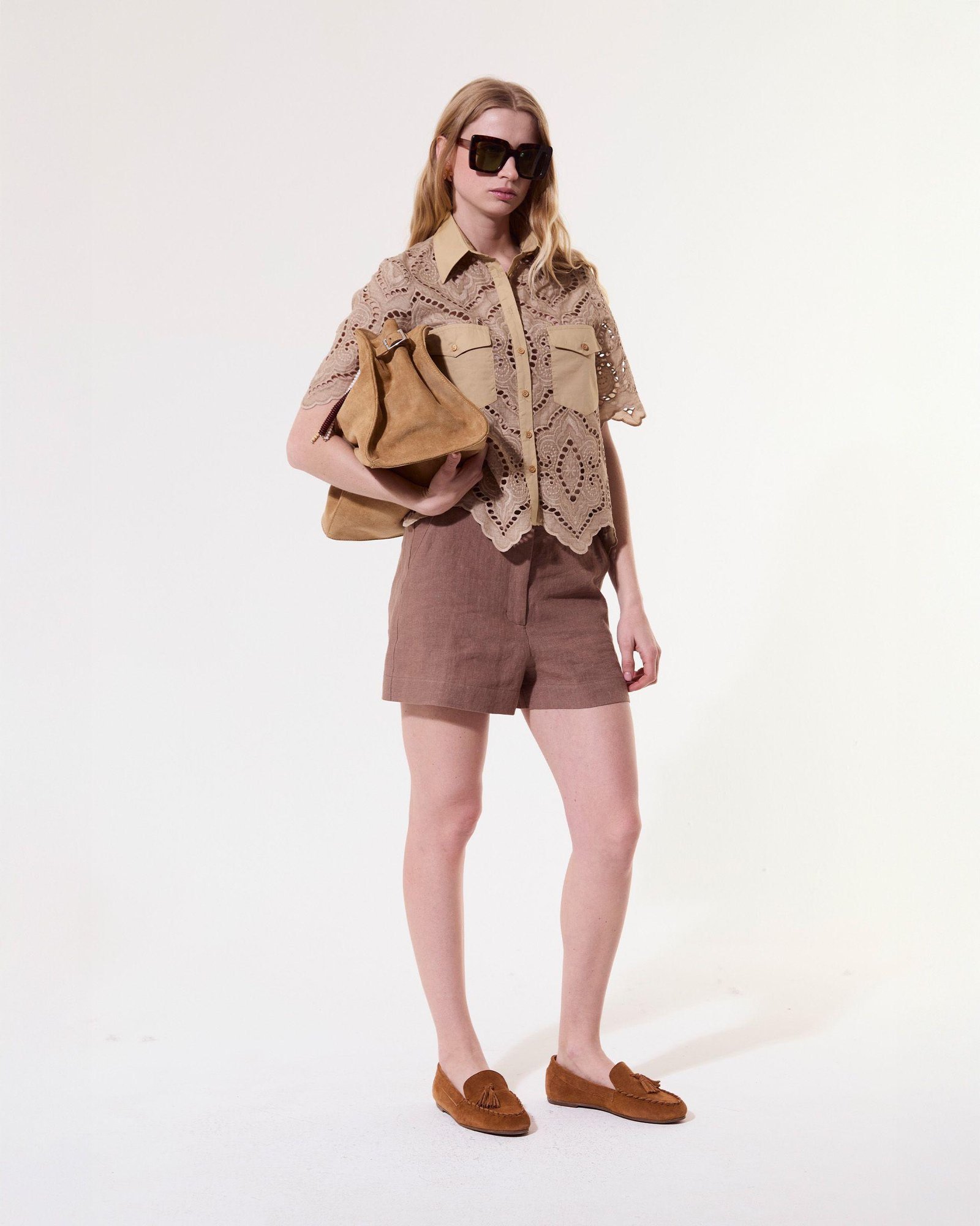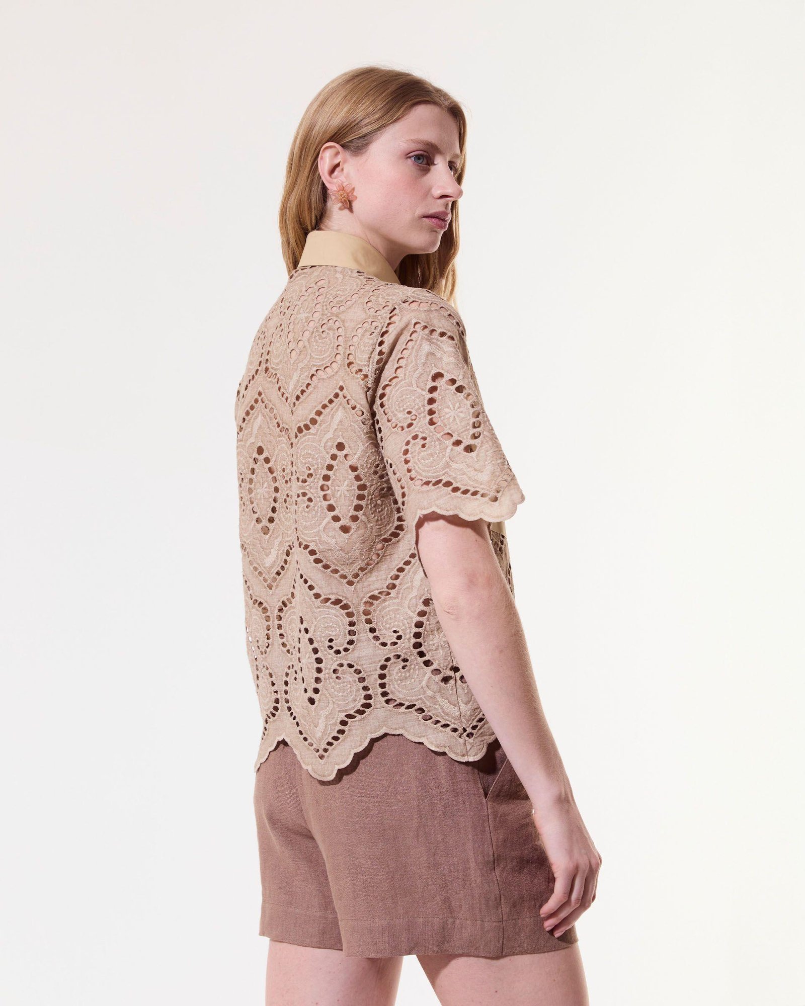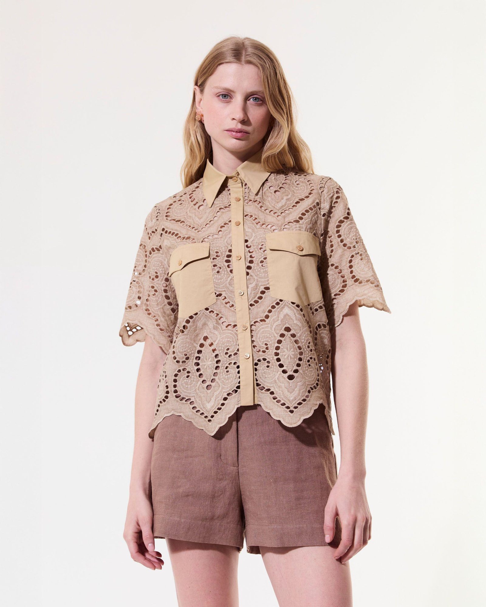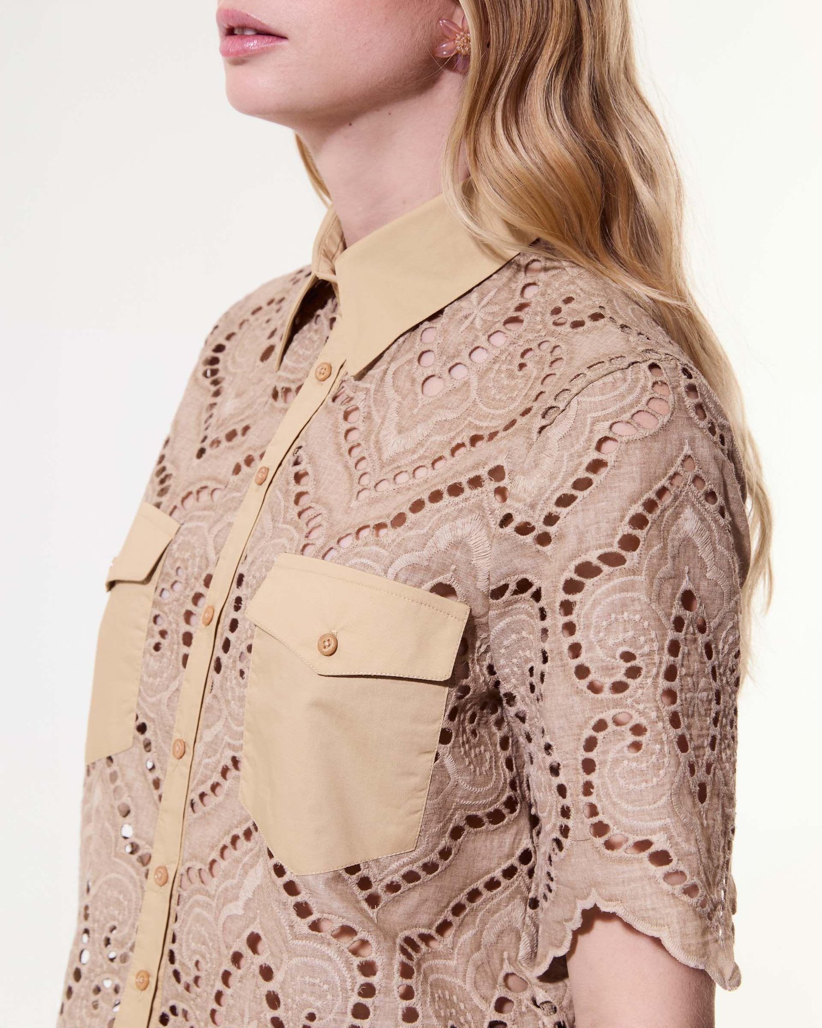 Camisa manga corta confeccionada en broderie de voile 100% algodón. Tiene cuello, cartera y dos bolsillos plaqué con solapa en el delantero confeccionados en tela plana lisa combinada al tono.