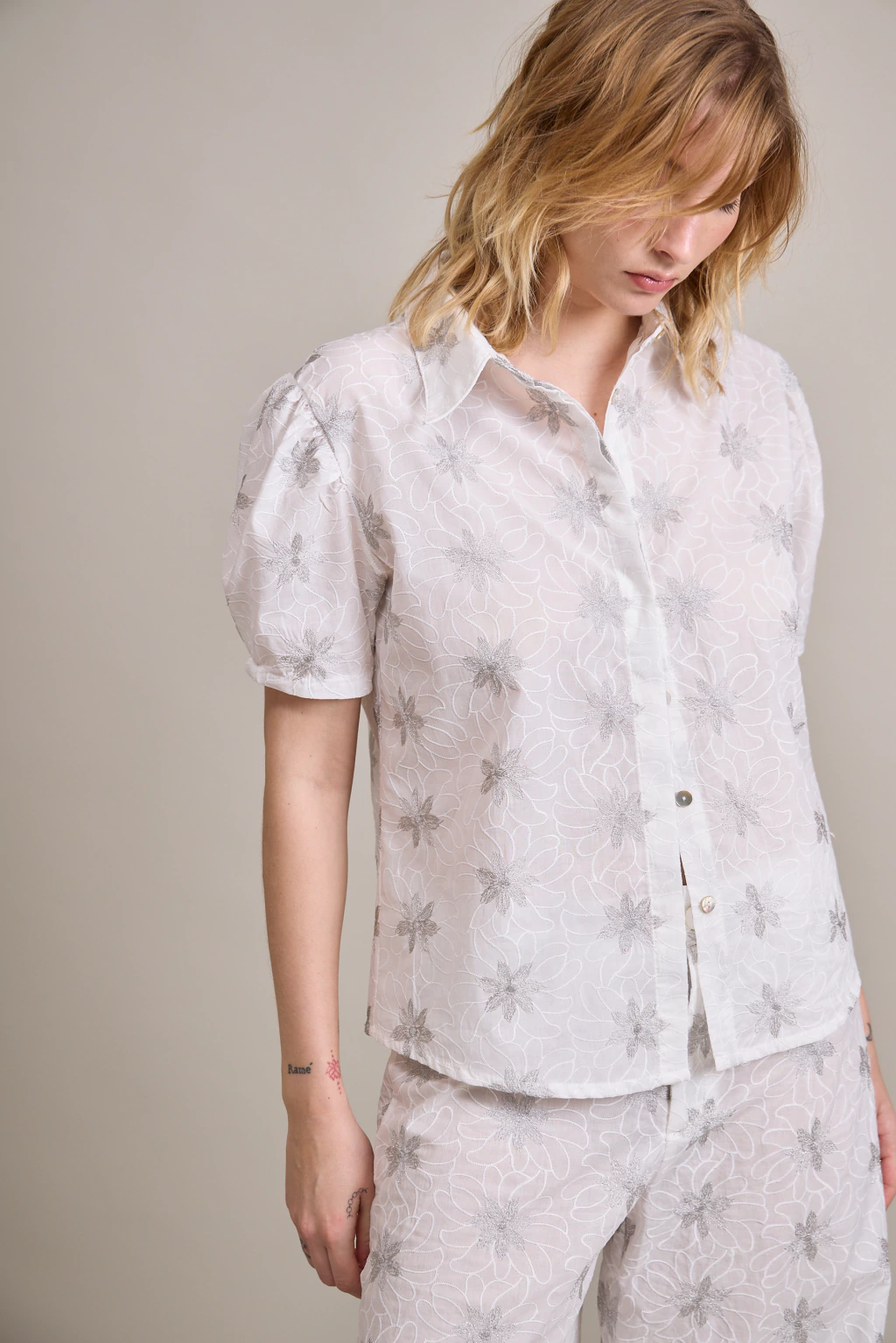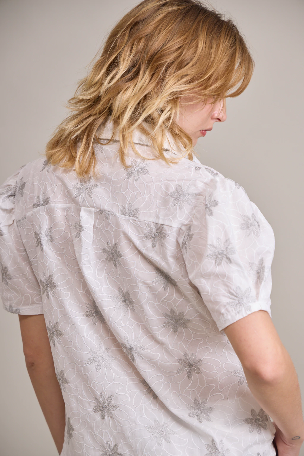 Camisa de corte básico con mangas cortas tipo bombee. Confeccionada en broderie de algodón con bordado en hilos de lurex plata.