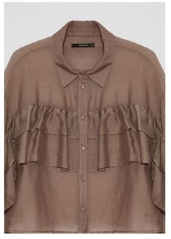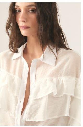 Camisa símil voile de algodón satinado con volados en frente y mangas, botones de pasta al tono y largo a la cintura