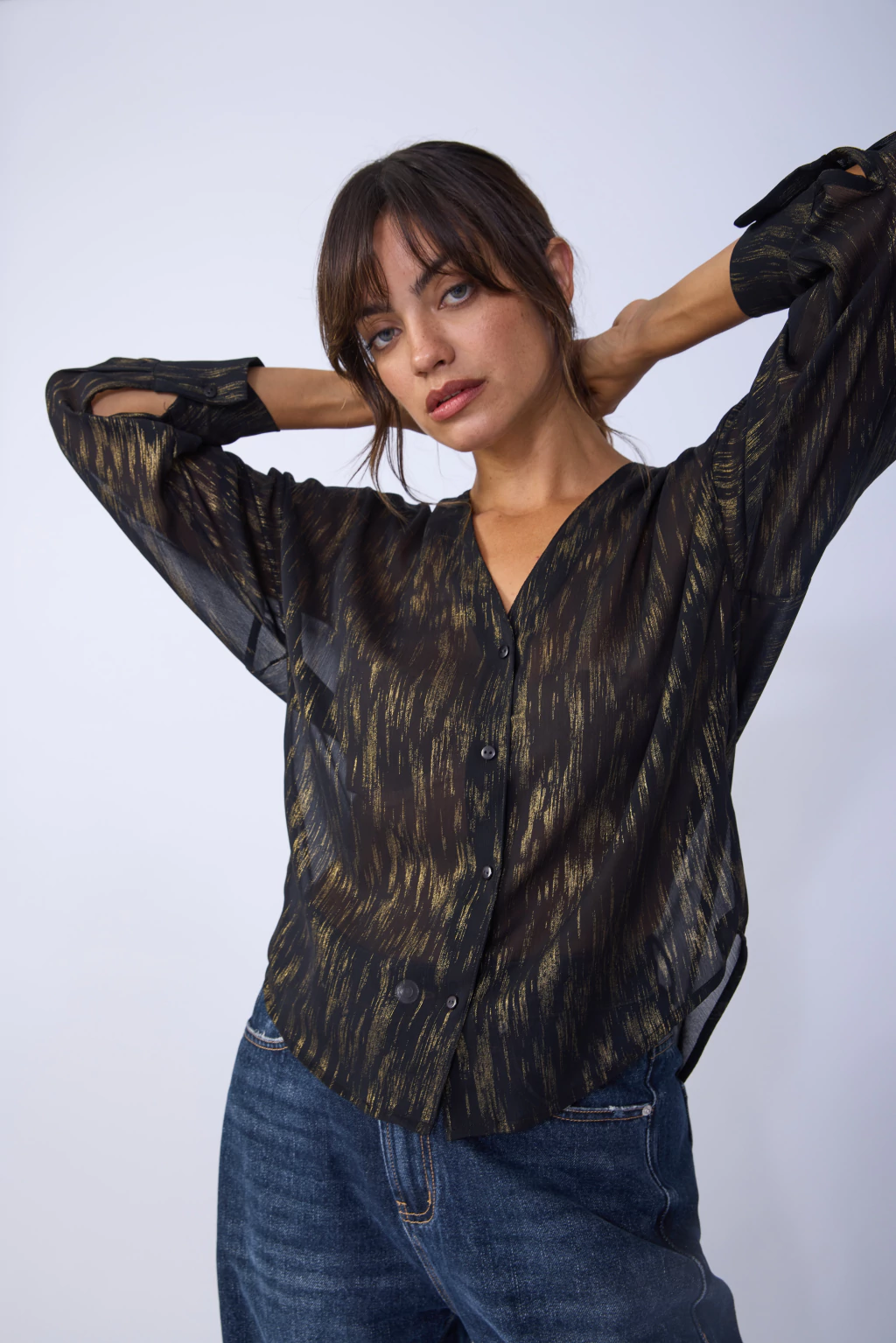 Camisa escote en V de gasa traslucida con detalles de foil color dorado, acceso mediante cartera con botones de pasta al tono. Larga hasta la primera cadera y más larga atrás