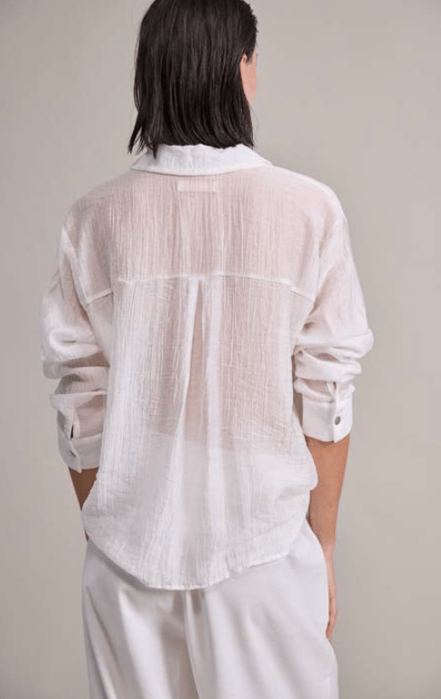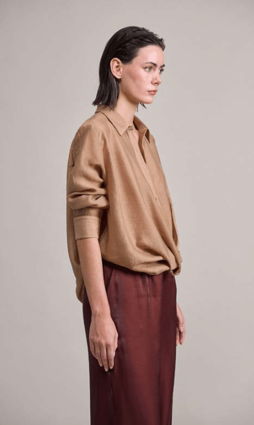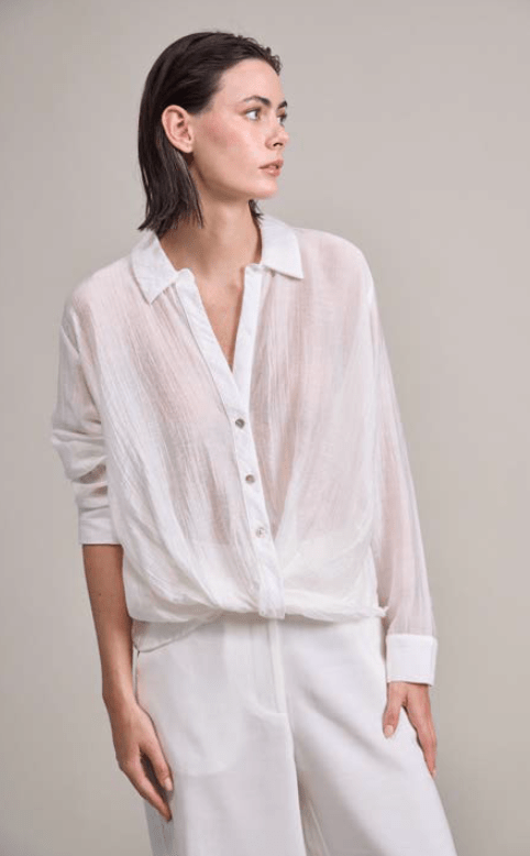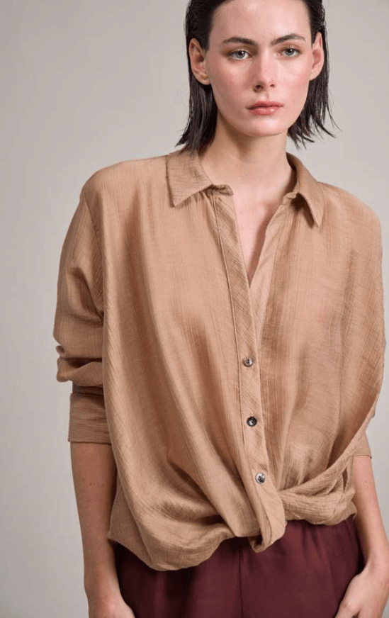 Camisa confeccionada en gasa con textura tipo arrugada con detalle simulando un nudo en delantero