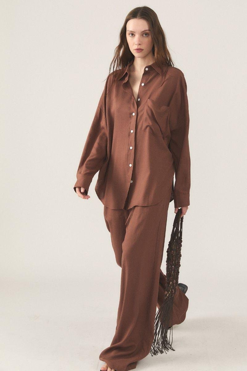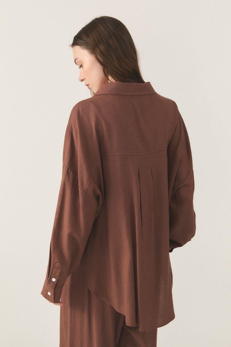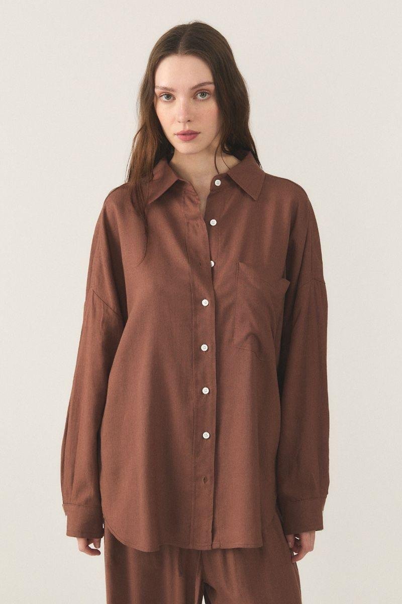 Camisa manga larga de lino camisero liviano. Calce super holgado con pespuntes a tono. En delantero tiene bolsillo plaqué y cartera de botones en contraste en color blanco