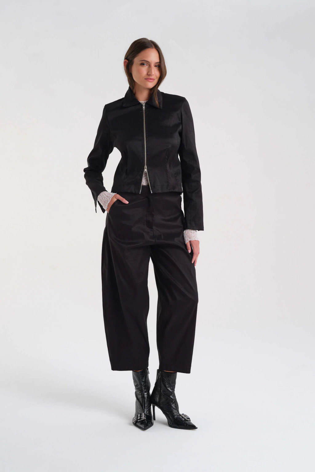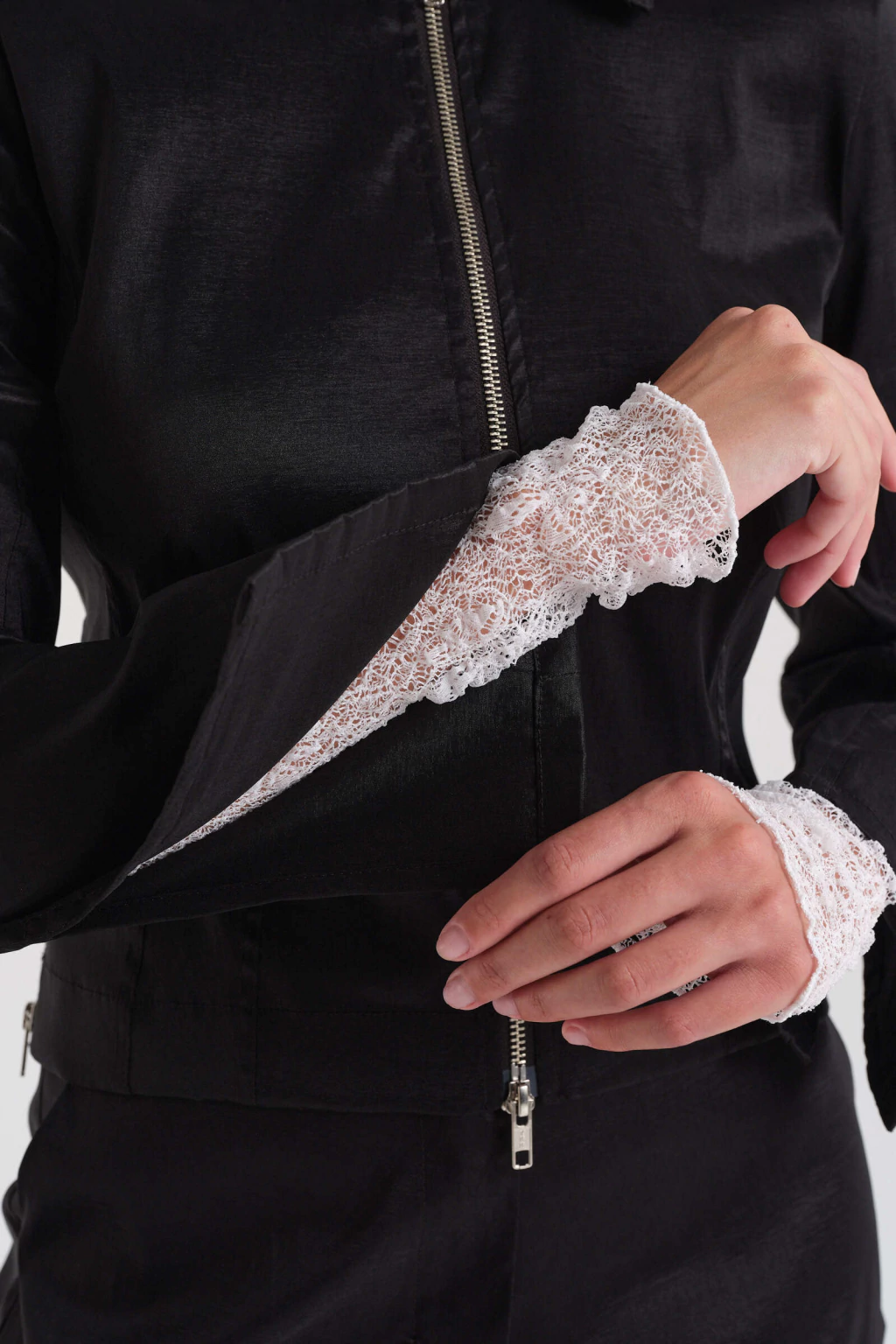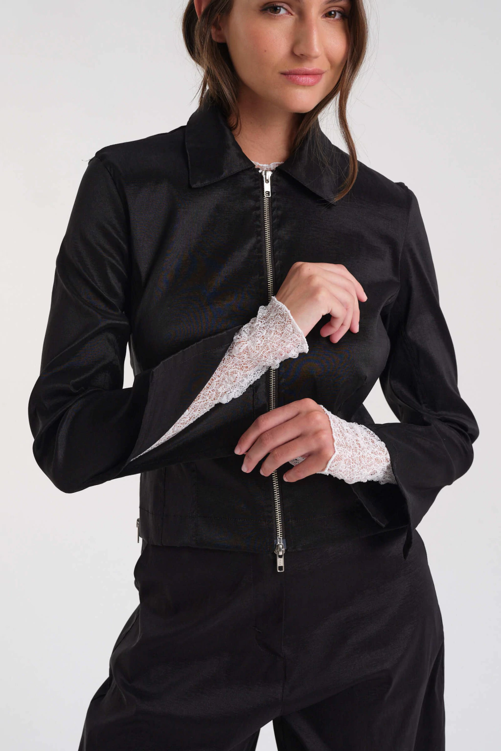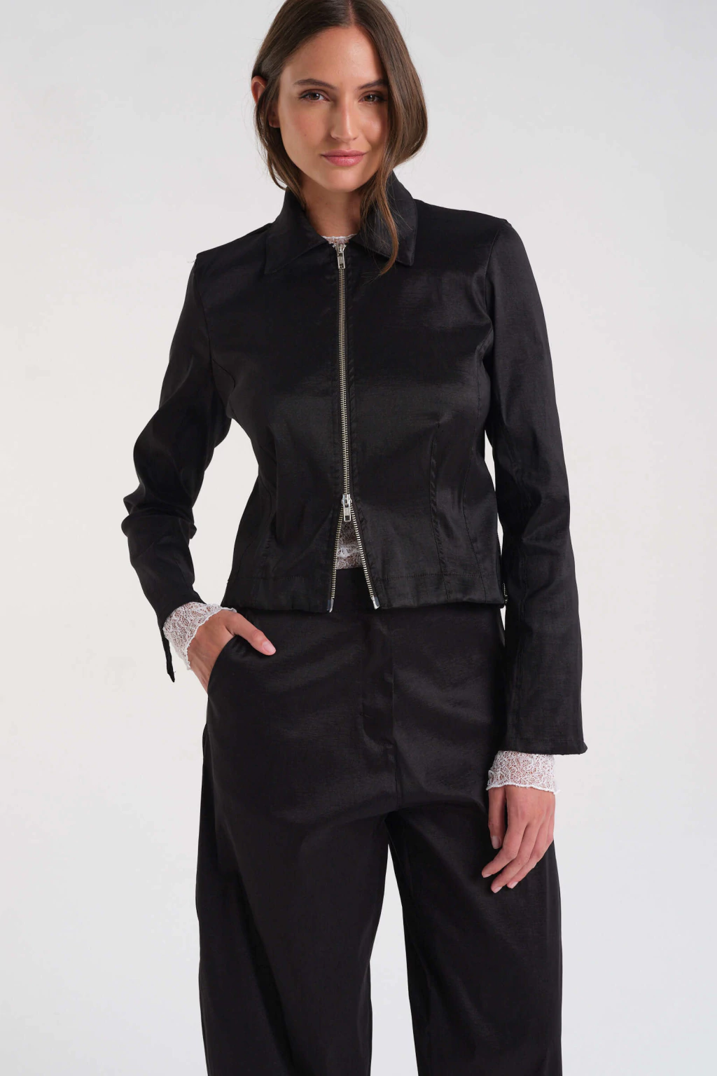 Campera de tafeta elastizada con detalles de cierre en los laterales del cuerpo, tajos en los puños de la manga y cierre de doble camino.