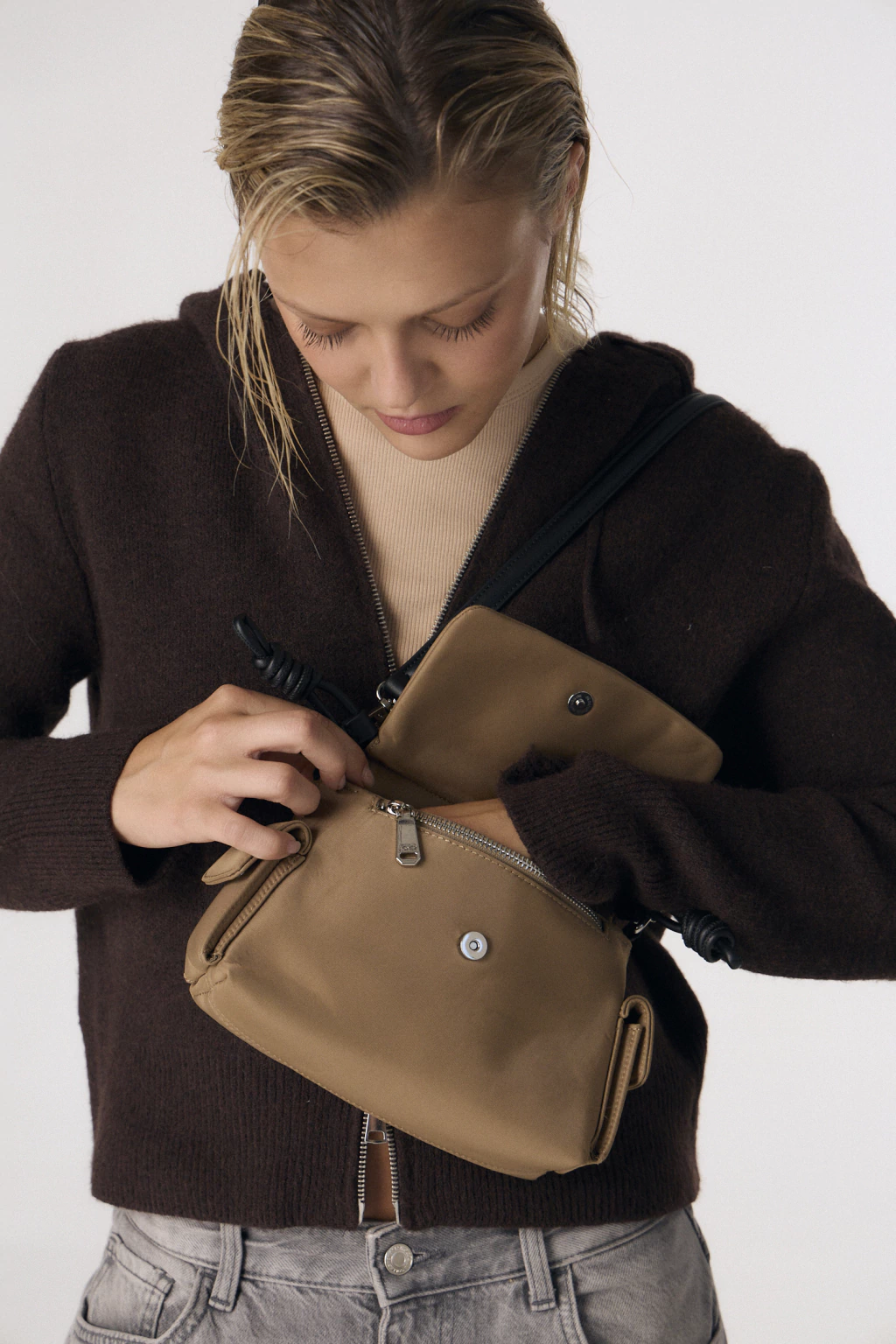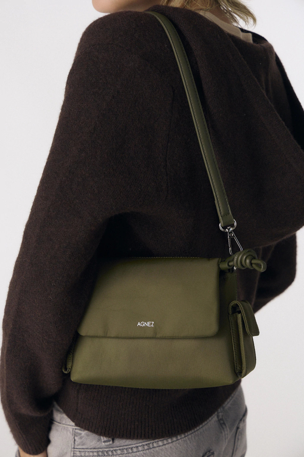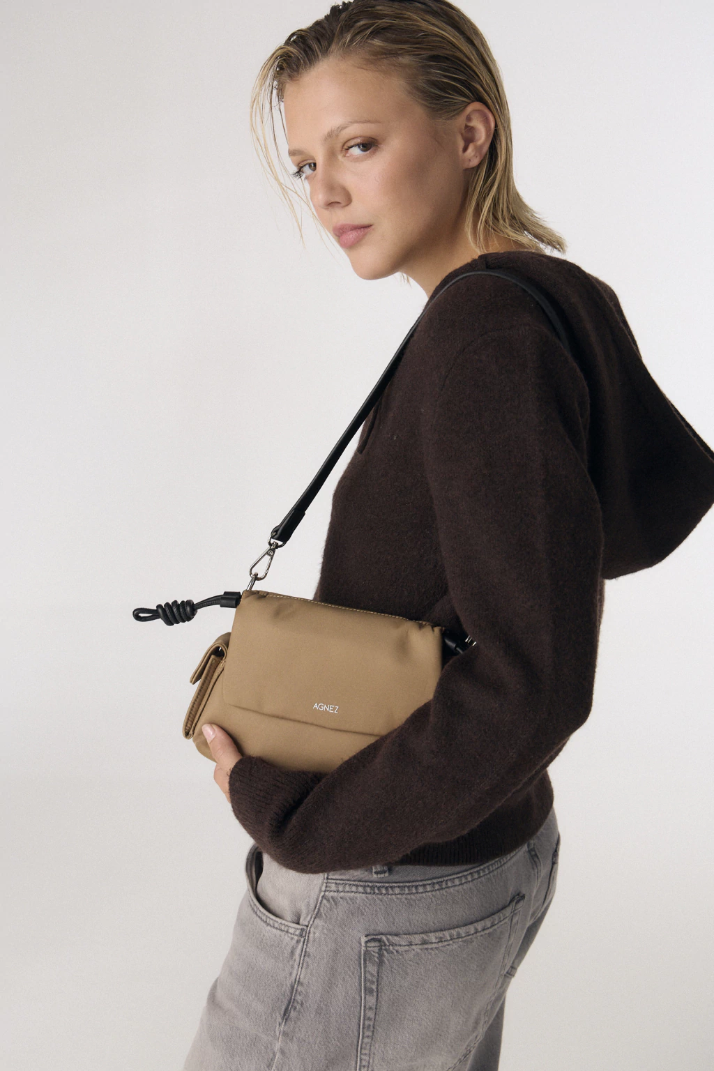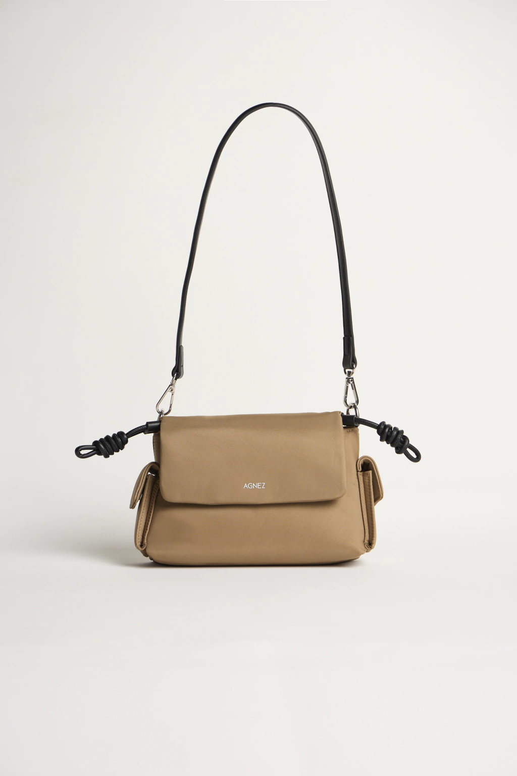 El modelo Vera combina una silueta estructurada con un acabado suave que aporta movimiento y versatilidad. Su diseño se destaca por las manijas desmontables con detalle de nudos laterales, generando un contraste moderno y distintivo.