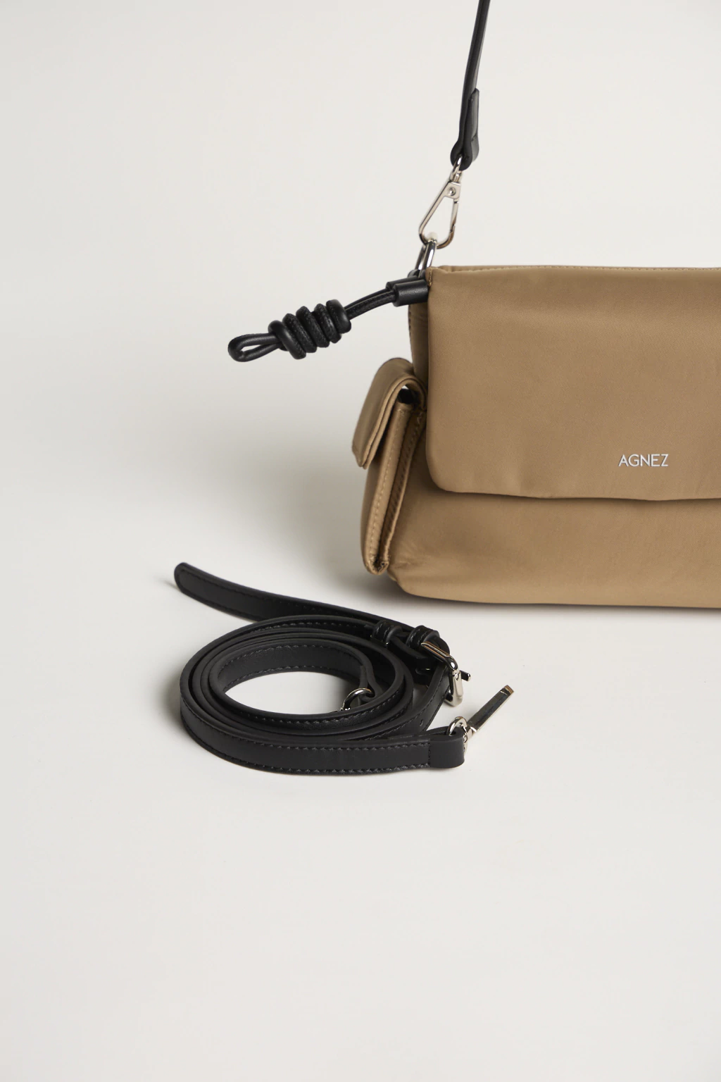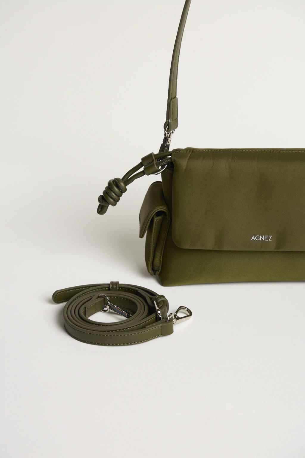 Cuenta con tapa con broche imán y un bolsillo interno con cierre que permite organizar los esenciales con practicidad. Incluye correa larga regulable y extraíble para llevarla al hombro o cruzada, adaptándose a distintos momentos del día. El logo frontal grabado y sus herrajes metálicos completan el diseño. Confeccionada en nylon de acabado satinado y textura lisa.