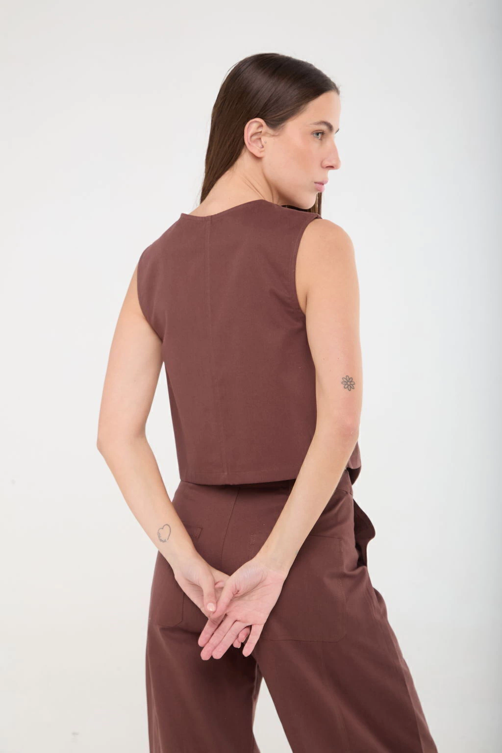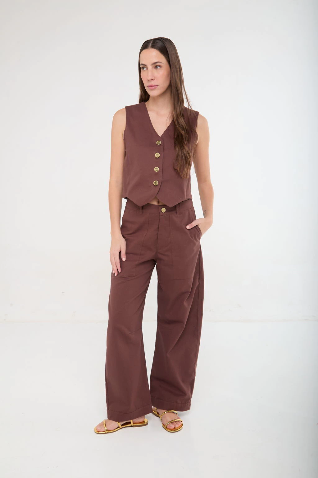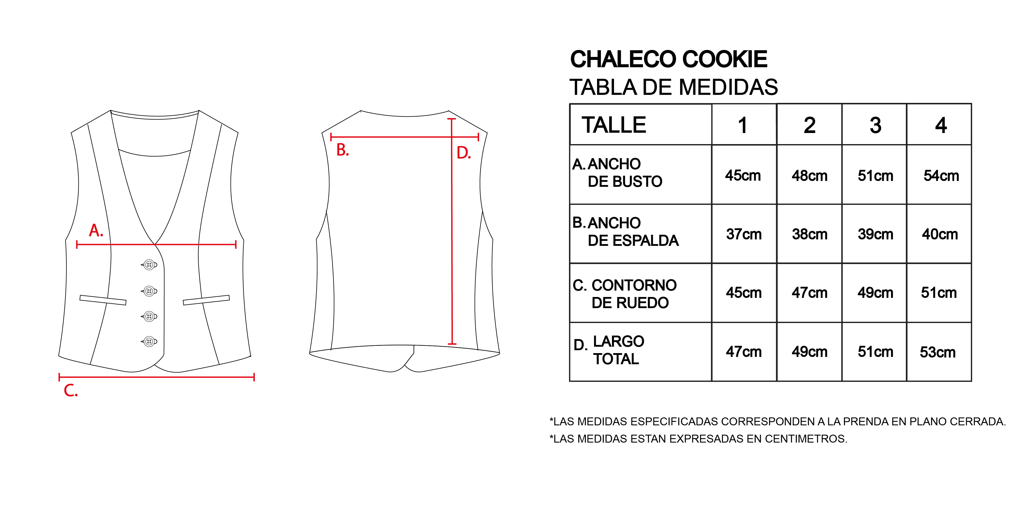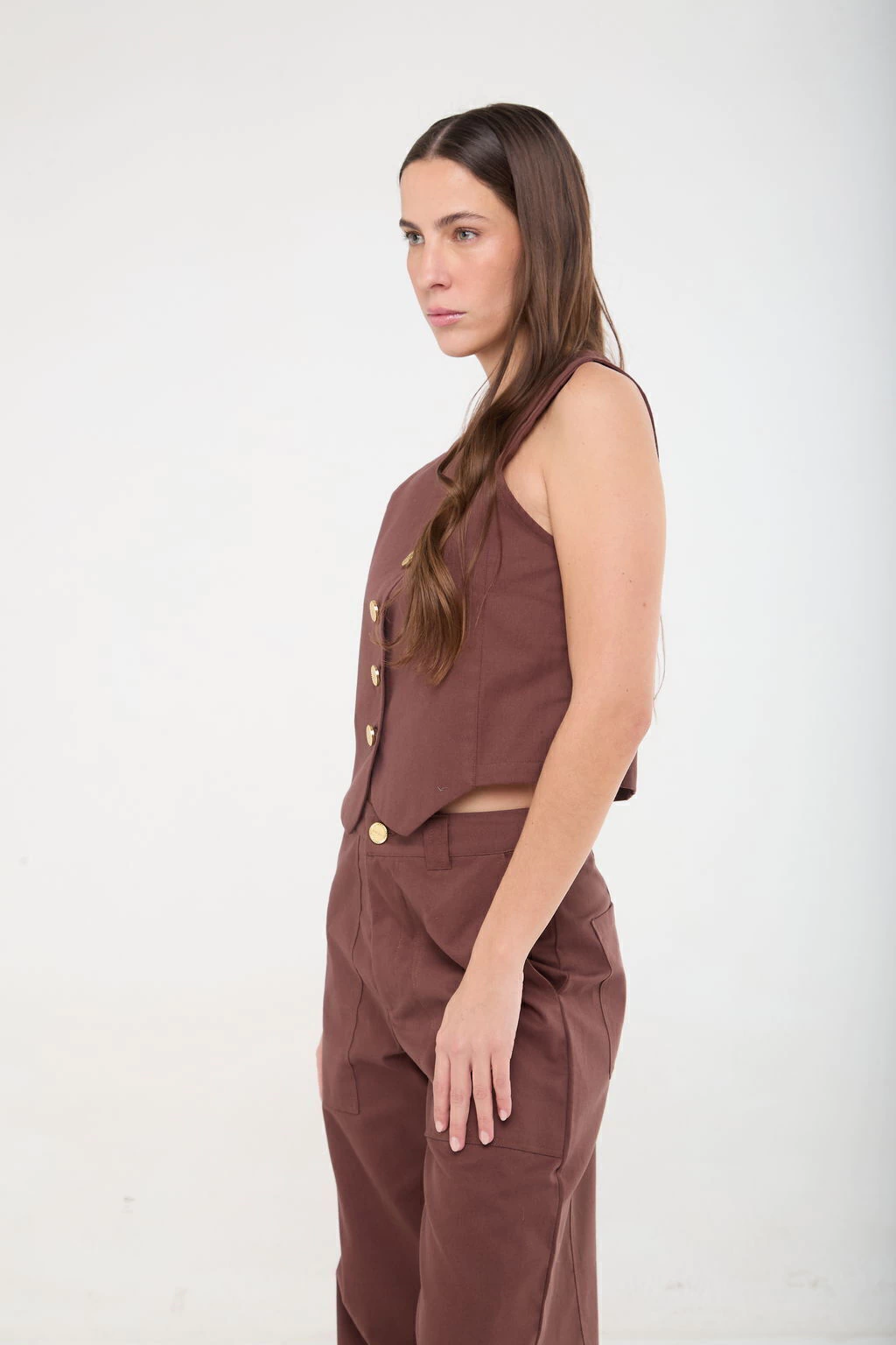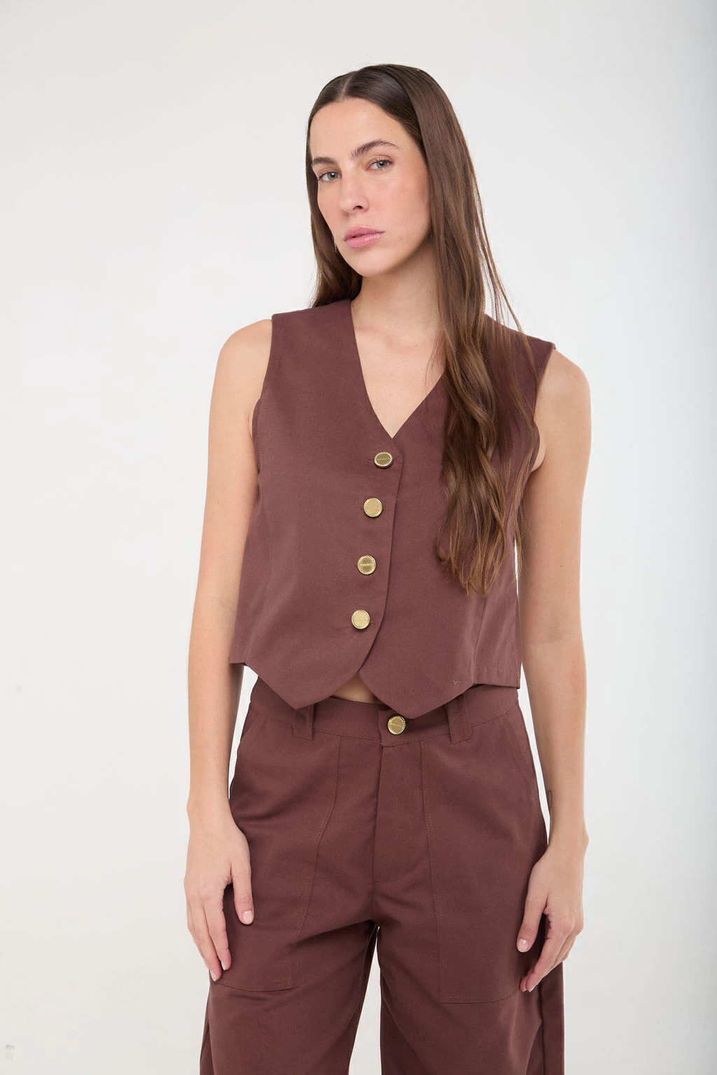 Chaleco en gabardina, con delantero forrado. Posee pinzas de entalle, y su acceso es mediante un cruce simple a cuatro botones jeaneros personalizados. El largo modular de la prenda se extiende hasta la primera cadera.