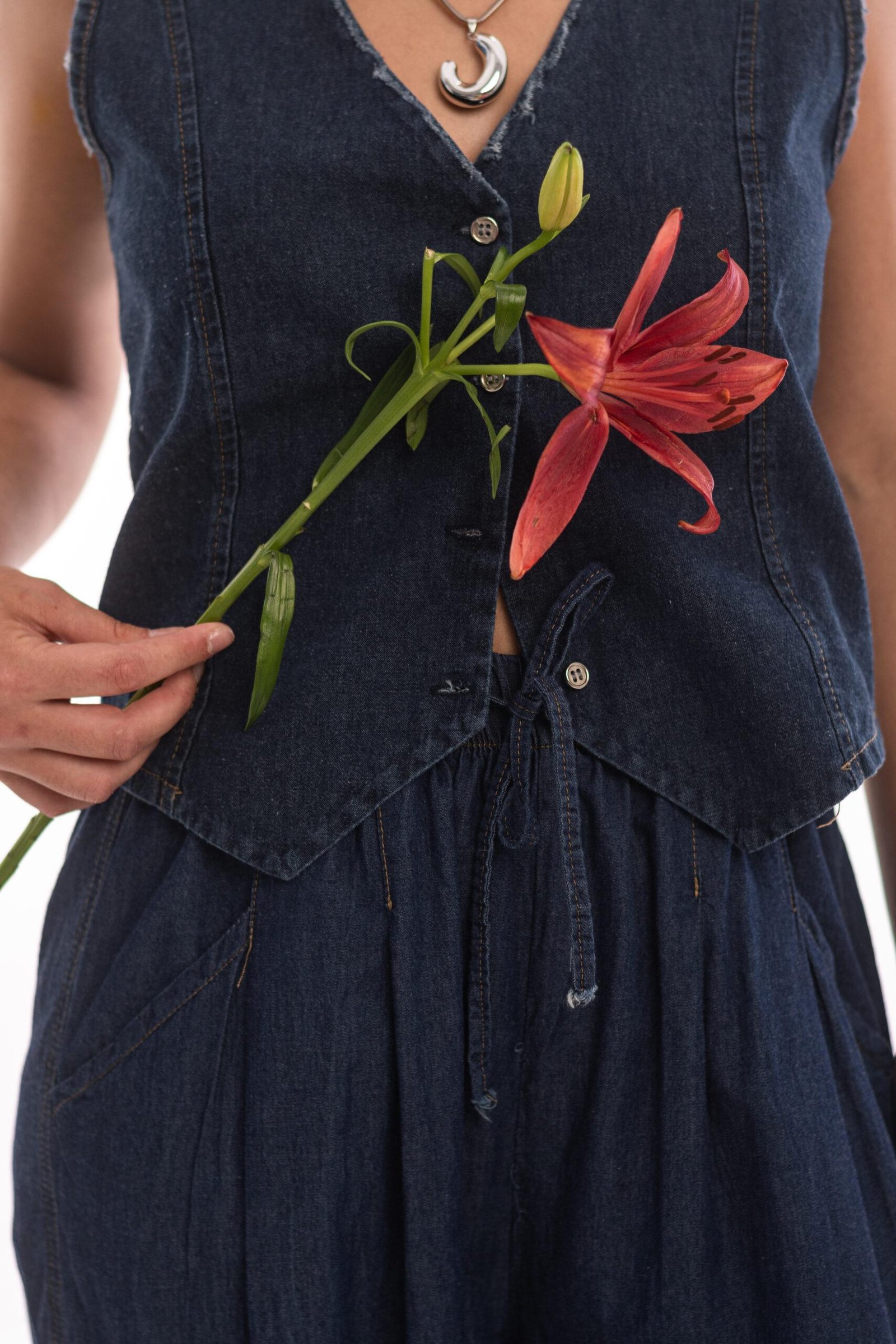 Chaleco denim con recorte de entalle y botones metálicos.