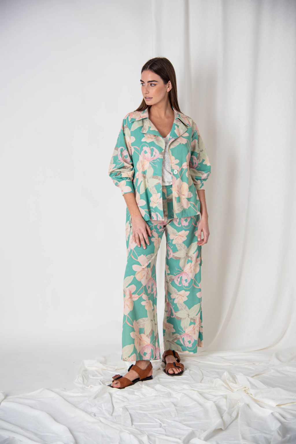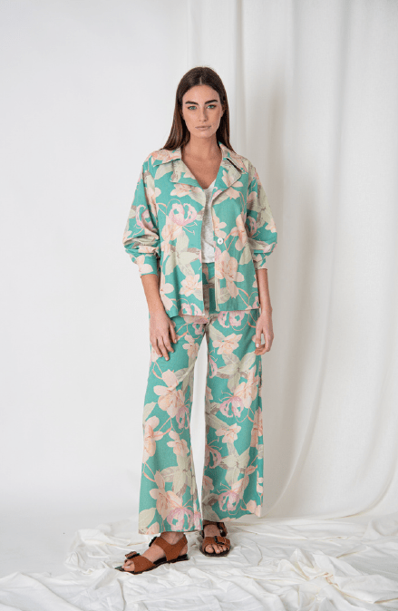 Chaqueta de lino con lazo en la cintura para regular. Con botón de pasta y puño camisero