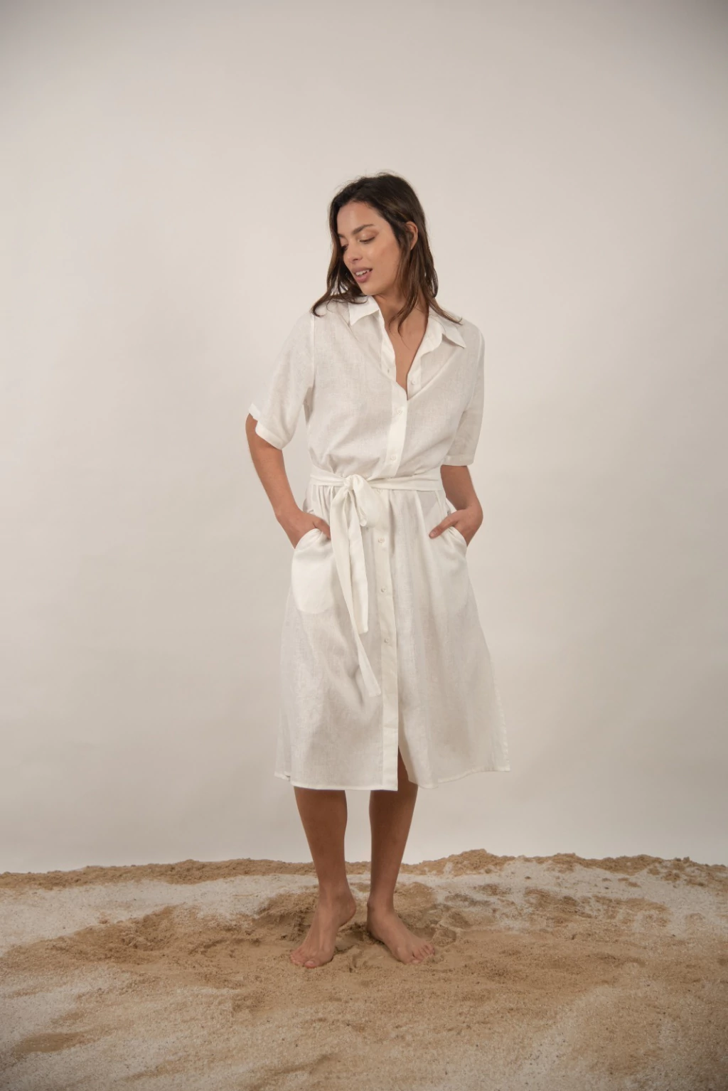 Chemise lino mezcla con cuello clásico italiano, bolsillos laterales y botones de pasta a tono. Posee un lazo desmontable para atar en cintura.