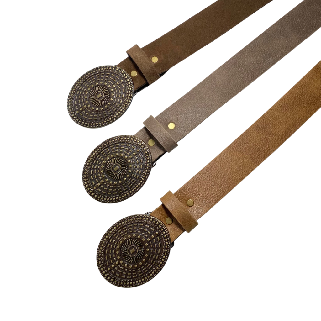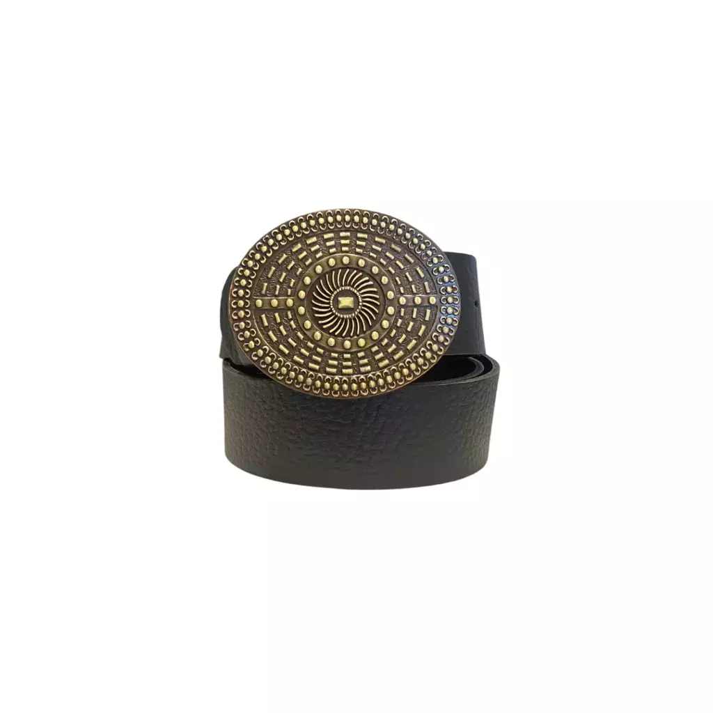 Cinturón texturado con hebilla ovalada metálica texturada en color bronce