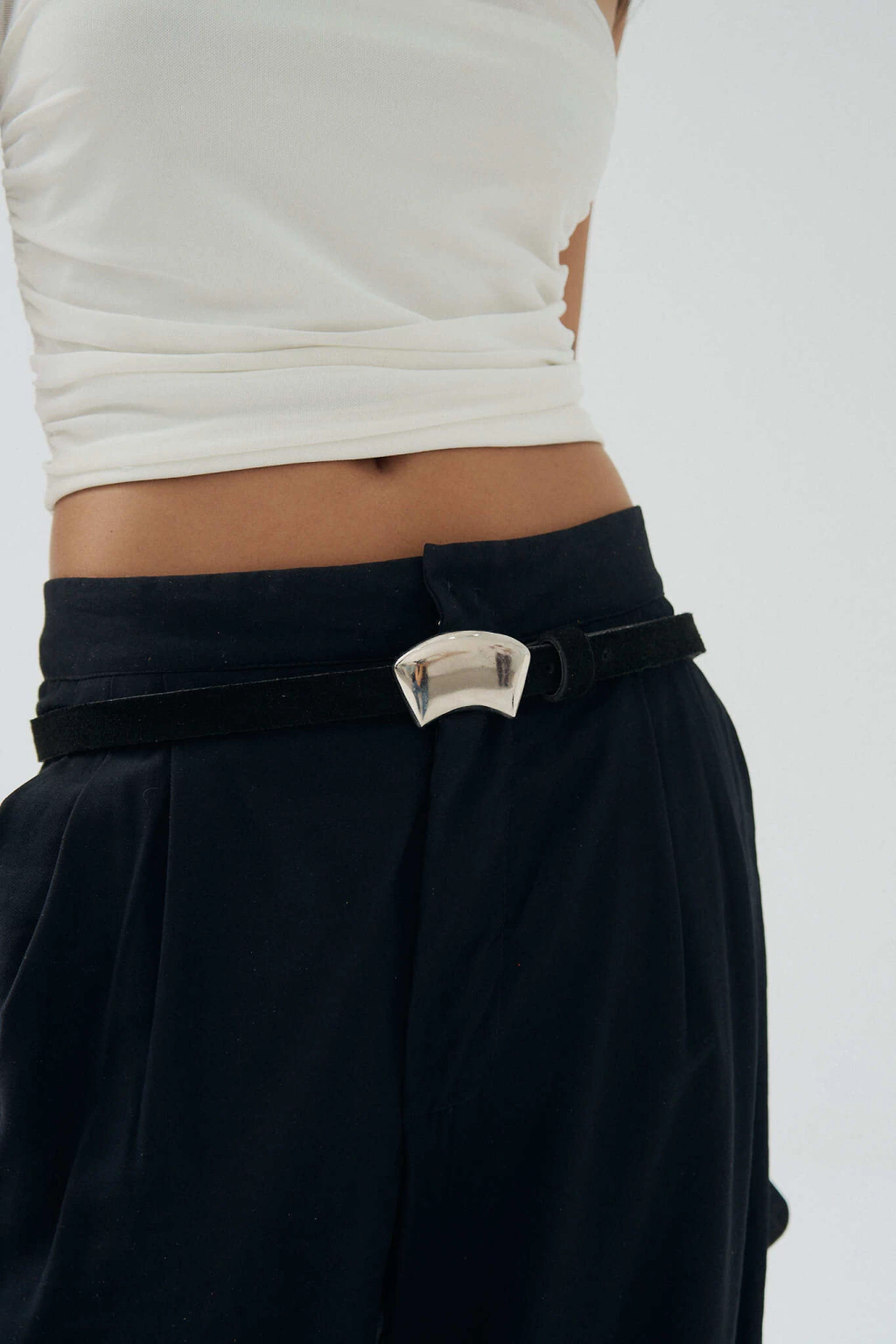 Cinto de cuero 100% gamuzado con hebilla metálica rectangular irregular.
