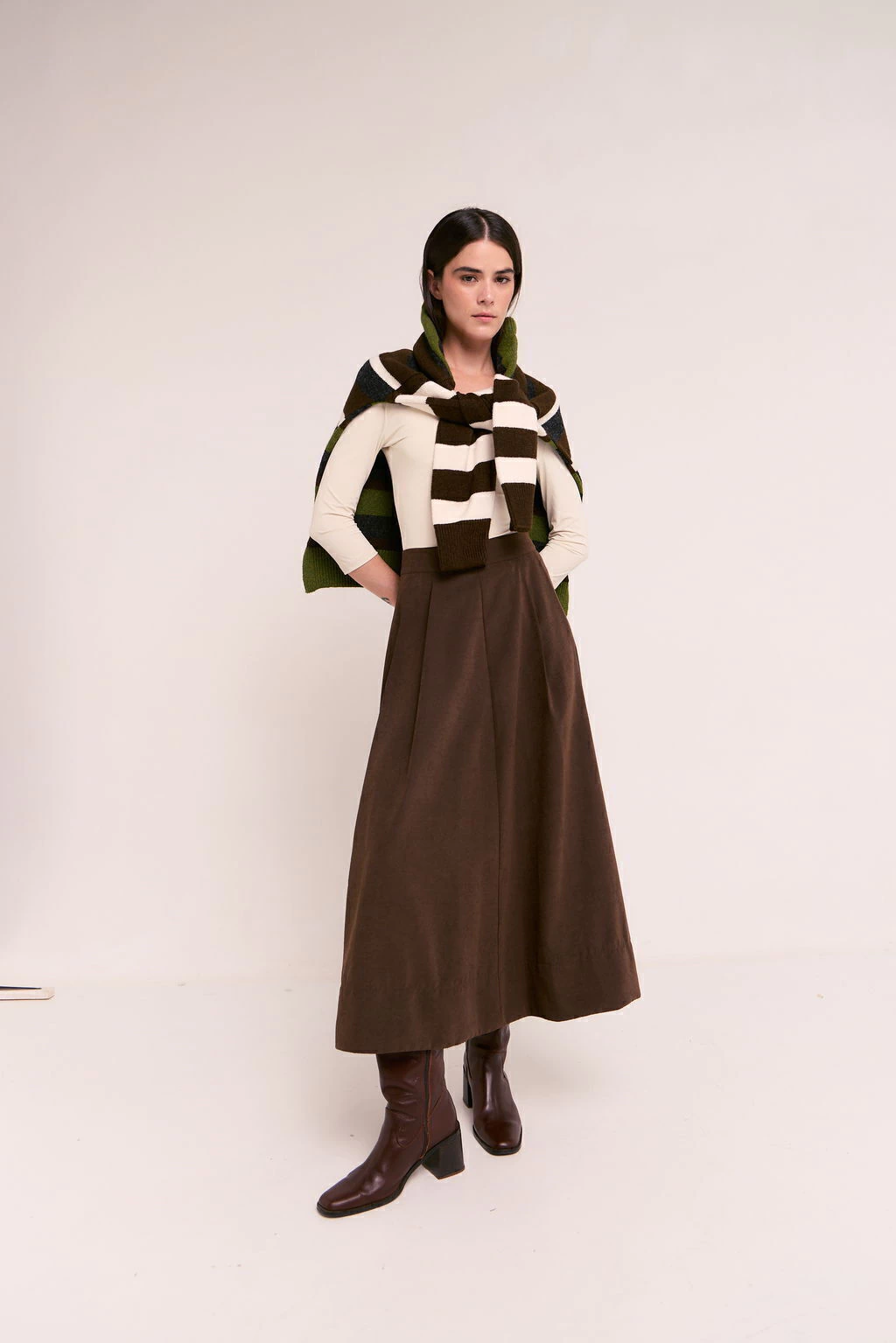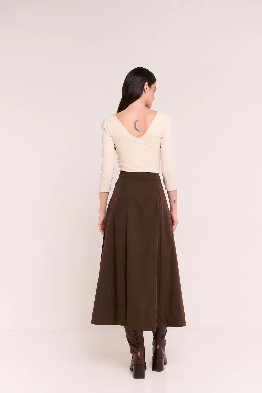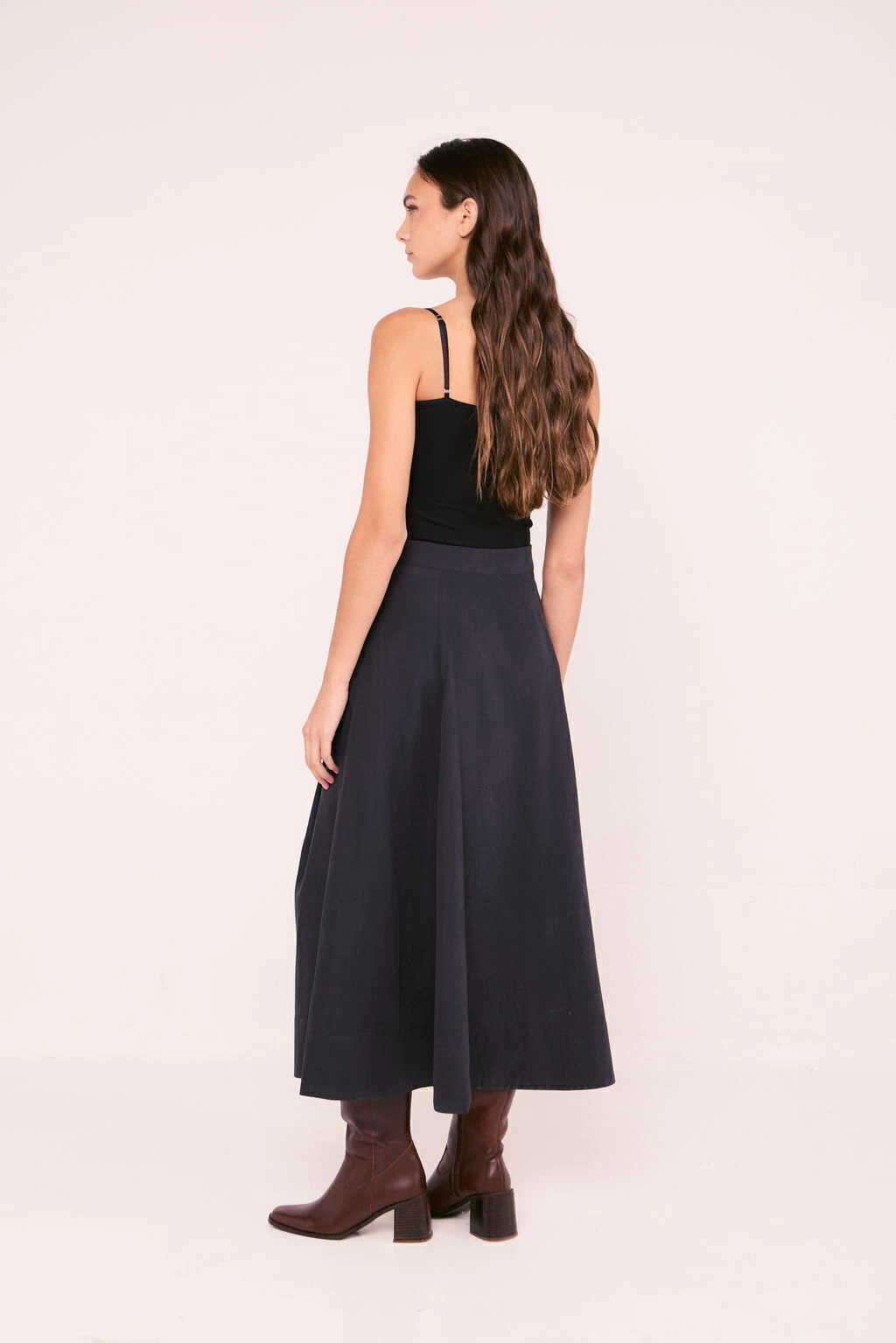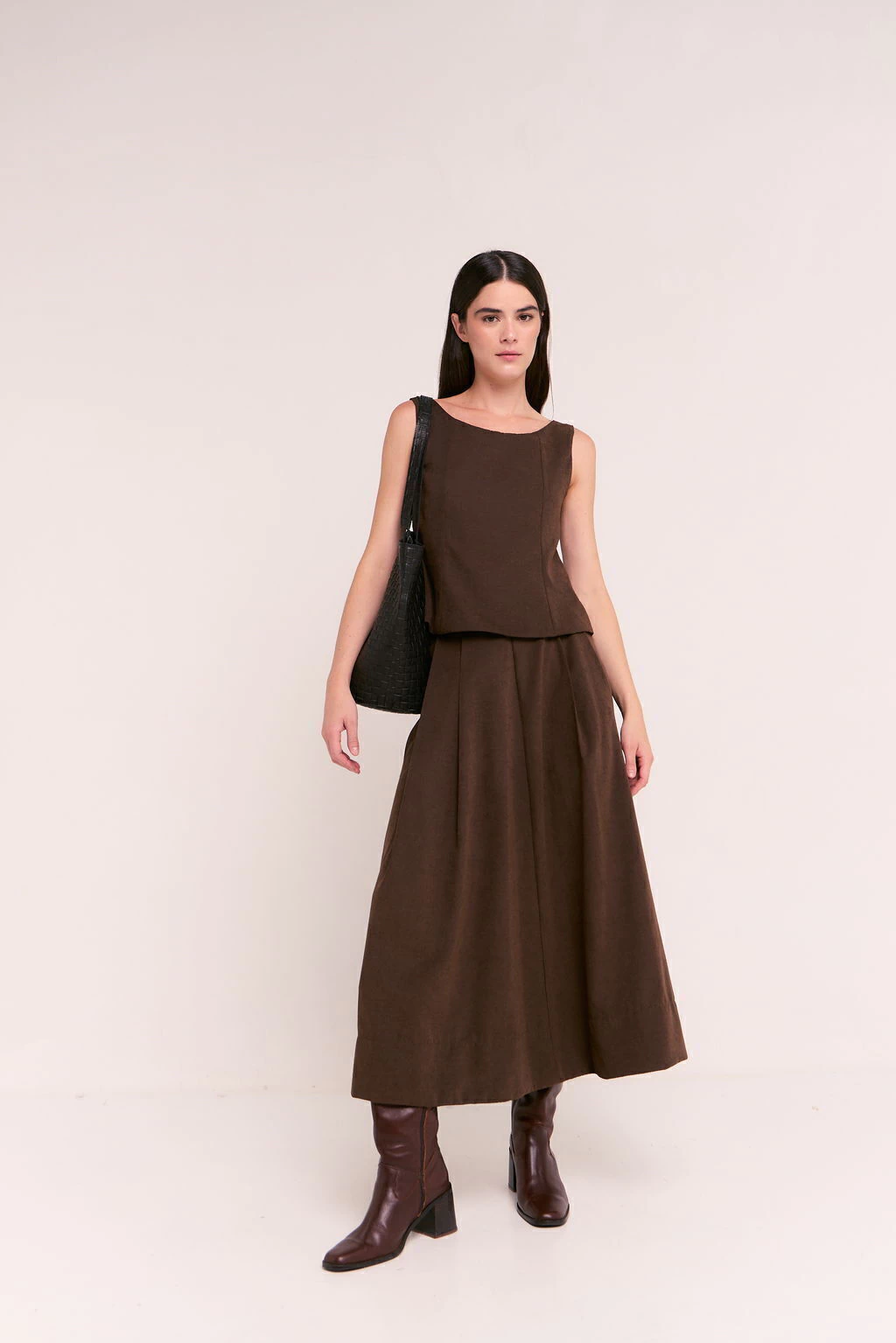 Maxi falda con recortes verticales y pinzas. Tiro medio con pretina, el acceso es mediante un cierre invisible en el lateral. El largo modular de la prenda se extiende hasta la pantorrilla.