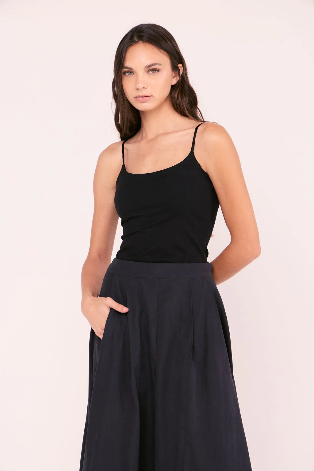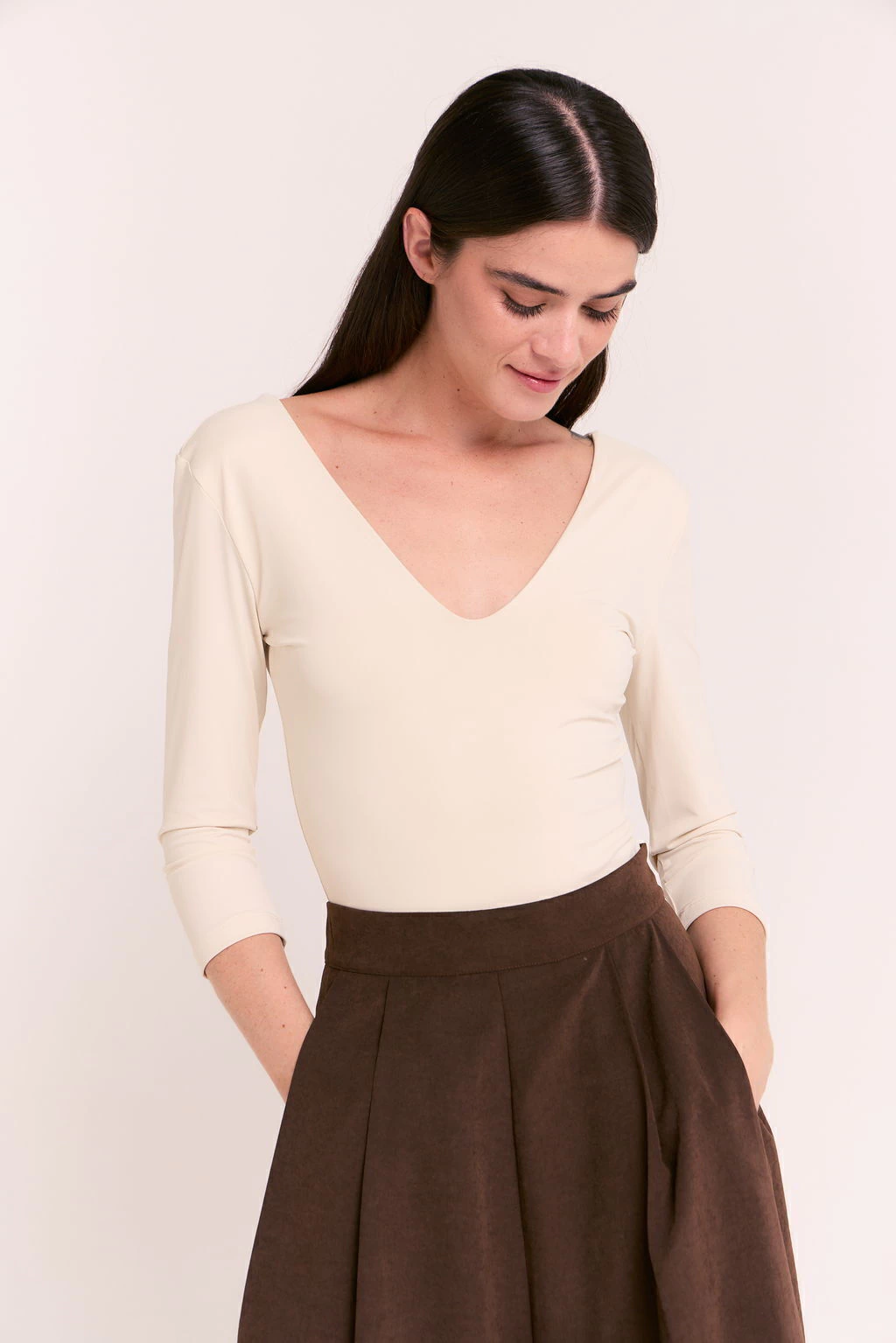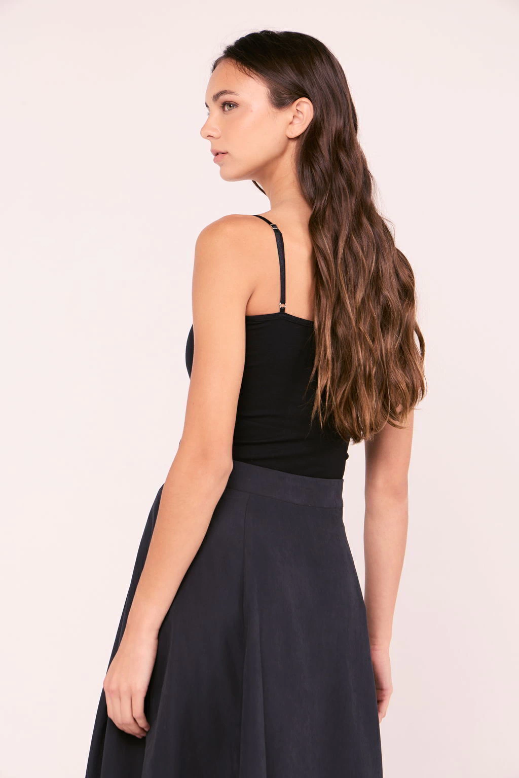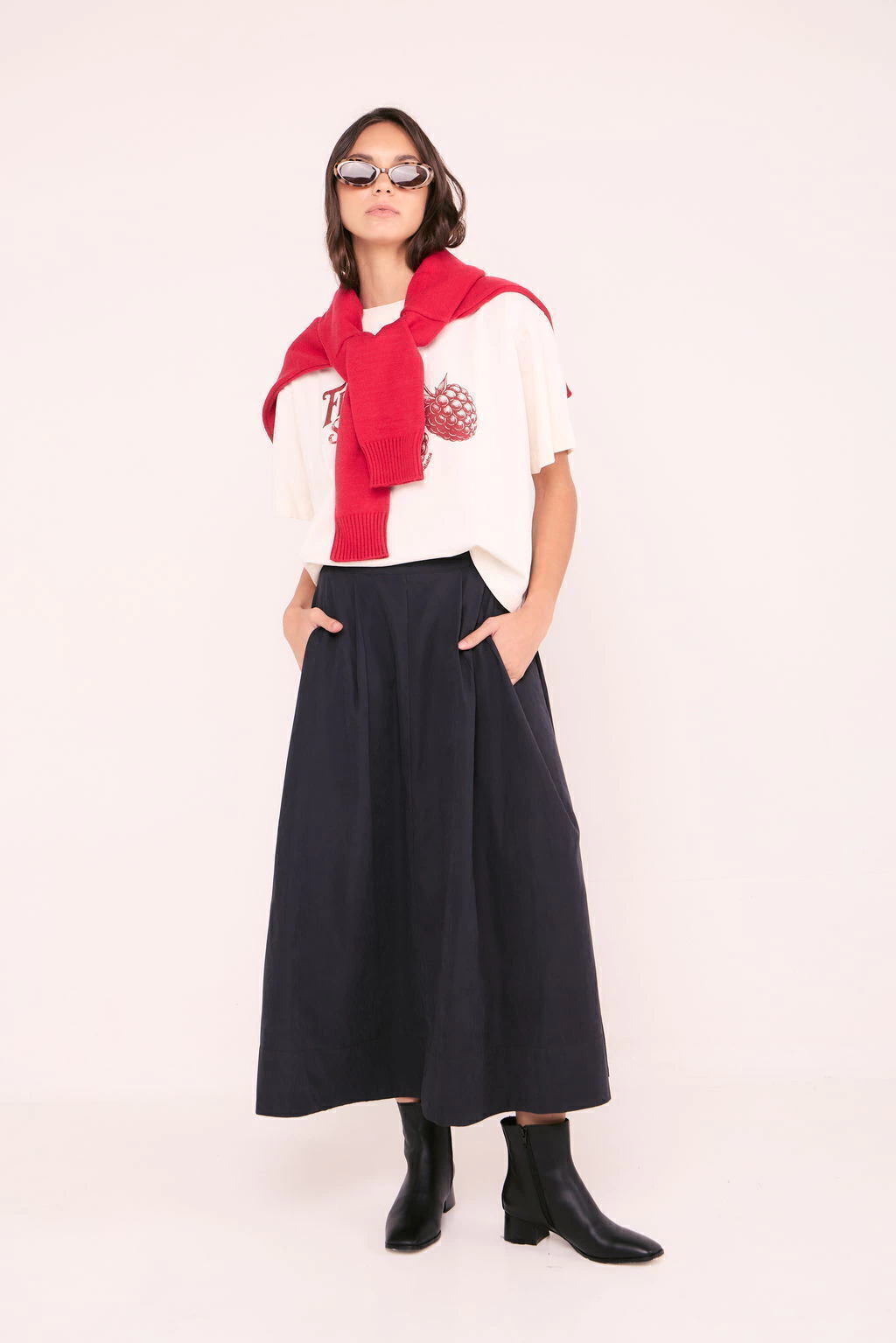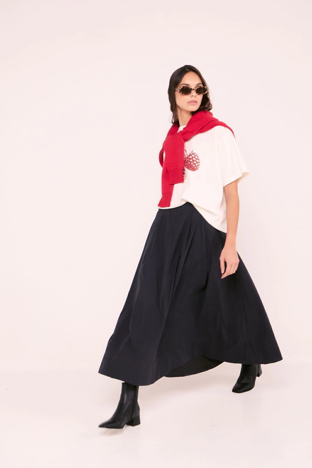 Maxi falda con recortes verticales y pinzas. Tiro medio con pretina, el acceso es mediante un cierre invisible en el lateral. El largo modular de la prenda se extiende hasta la pantorrilla.