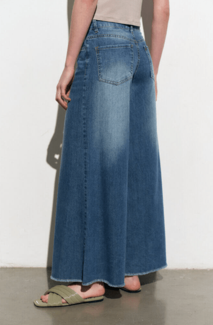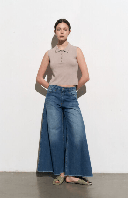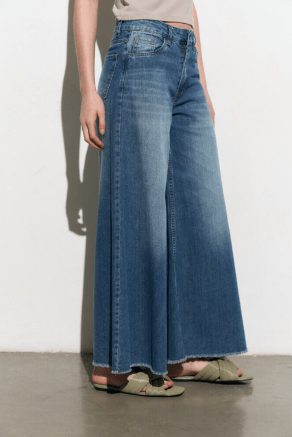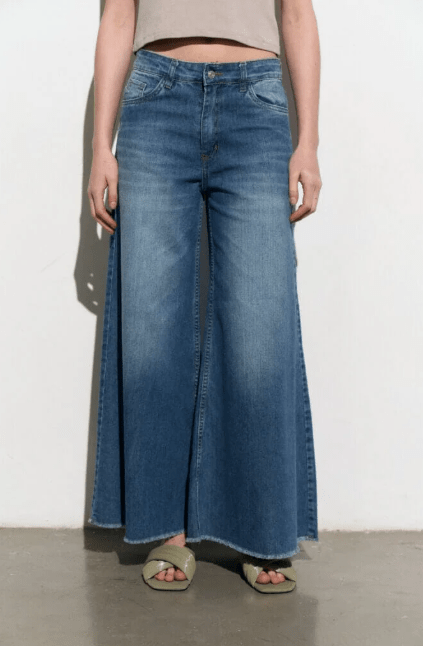 Jean wide lona liviana con rebote gastada localizada, tiro alto y bolsillos traseros