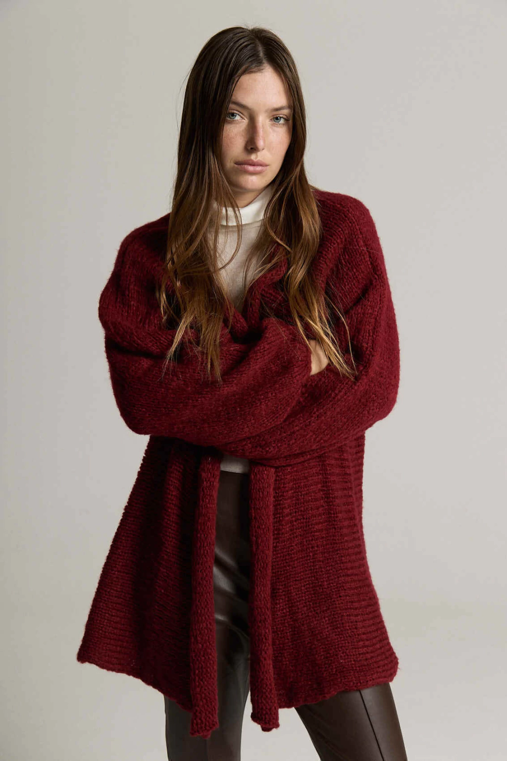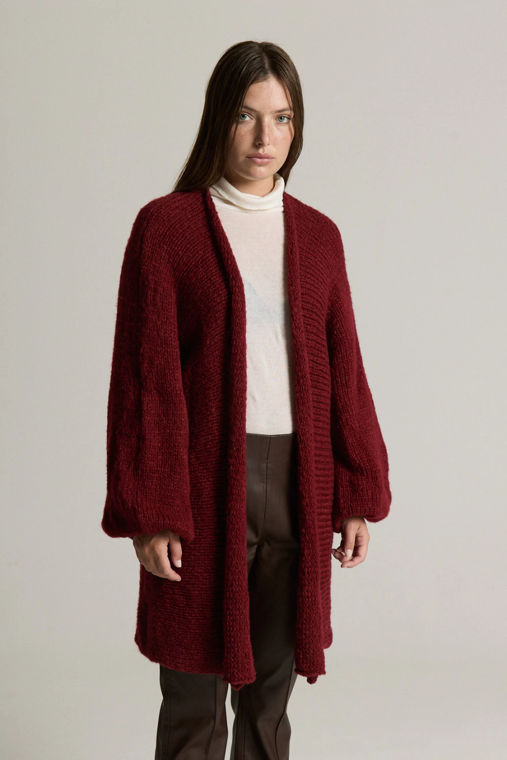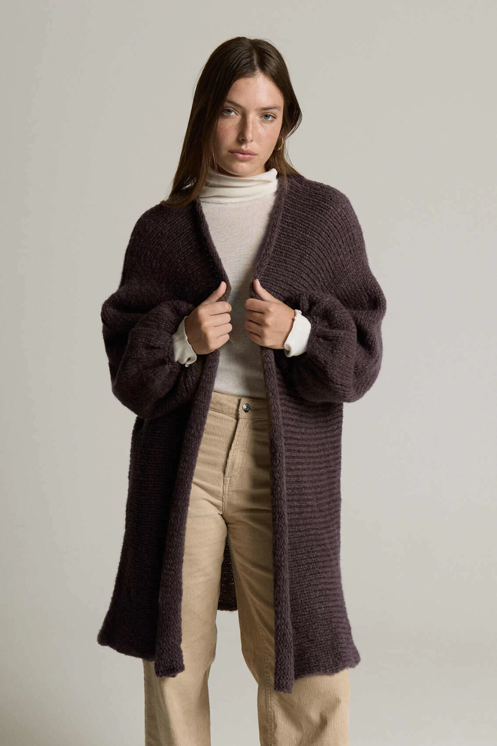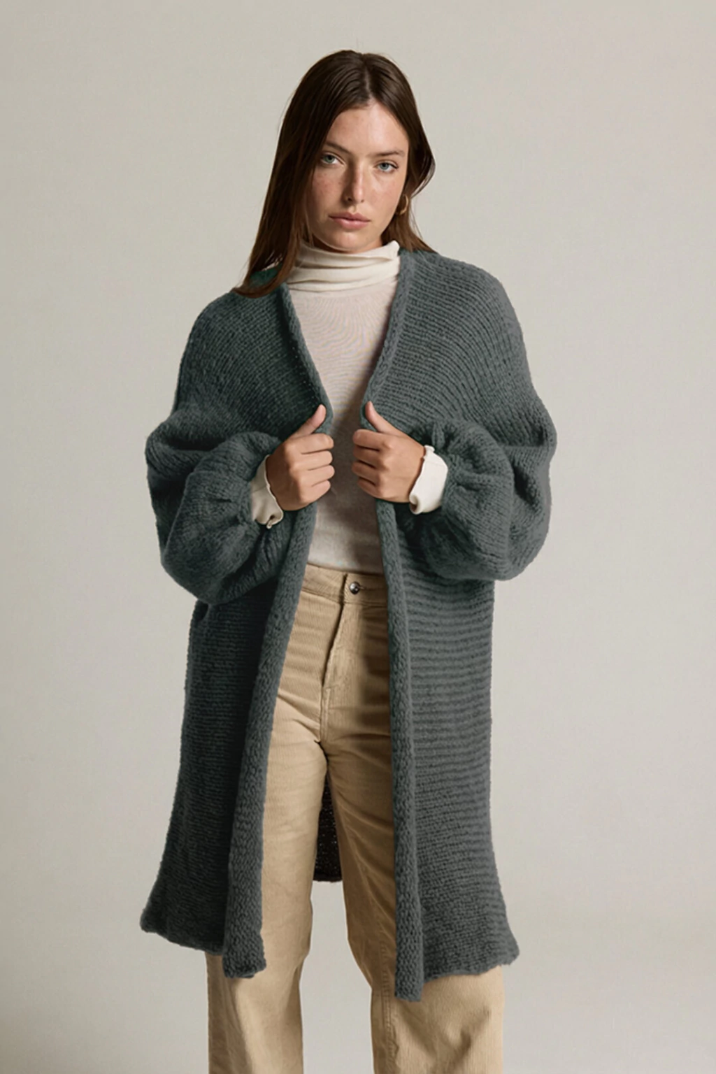 Kimono de mohair de linea suelta con diseño abierto y mangas semiballoon. Tejido en maquina manual familiar en técnica de tejido entero, sin costuras y terminaciones a mano.