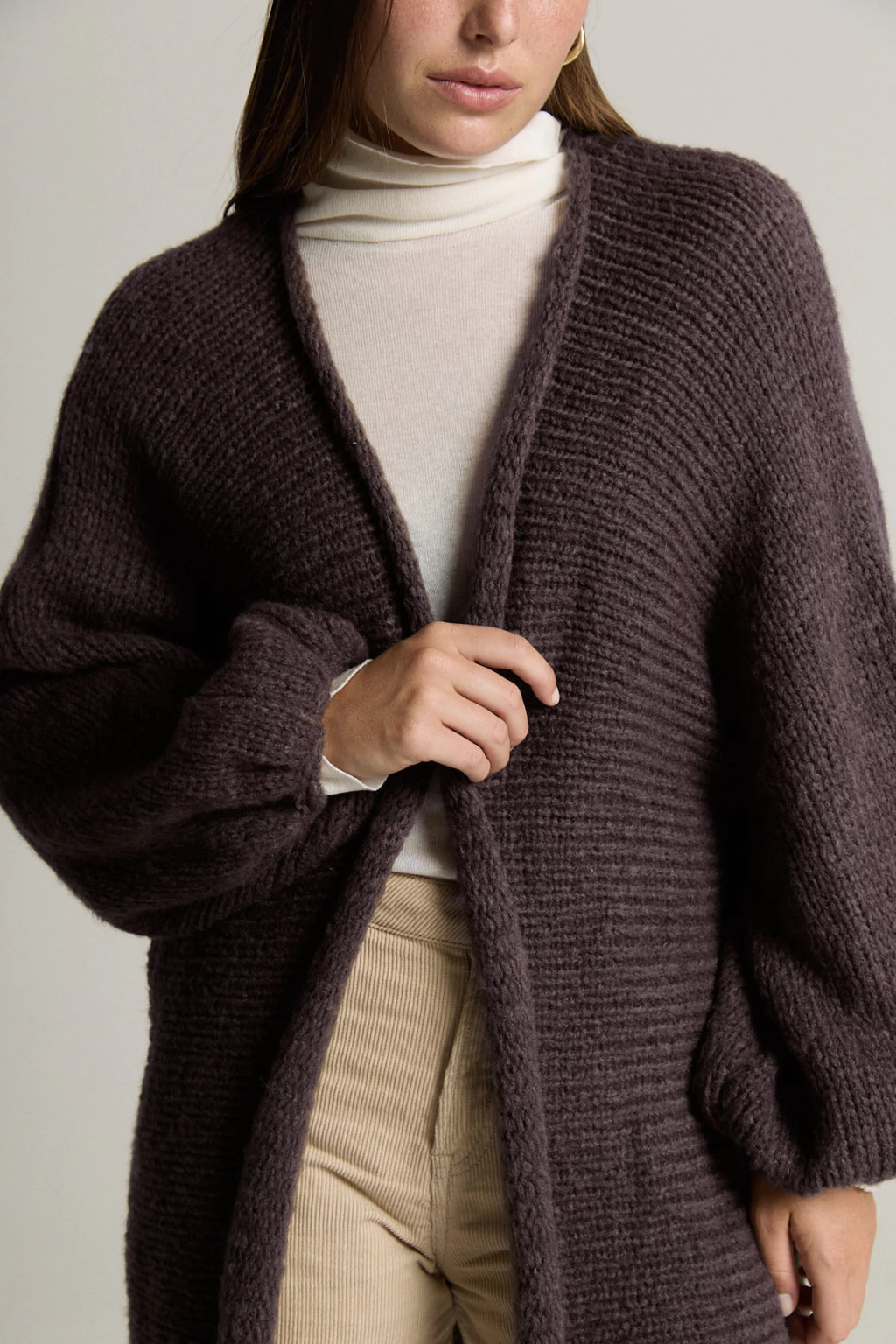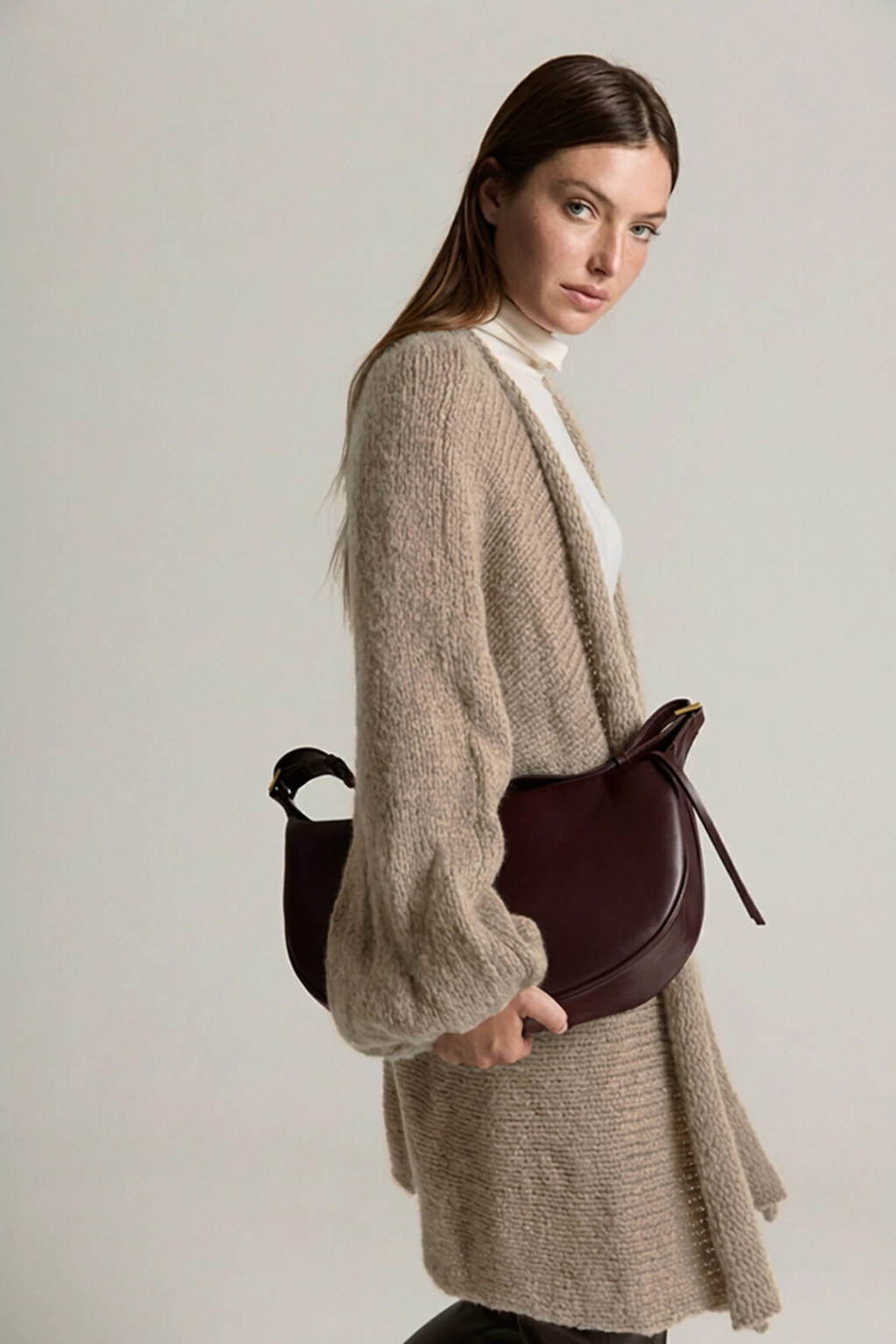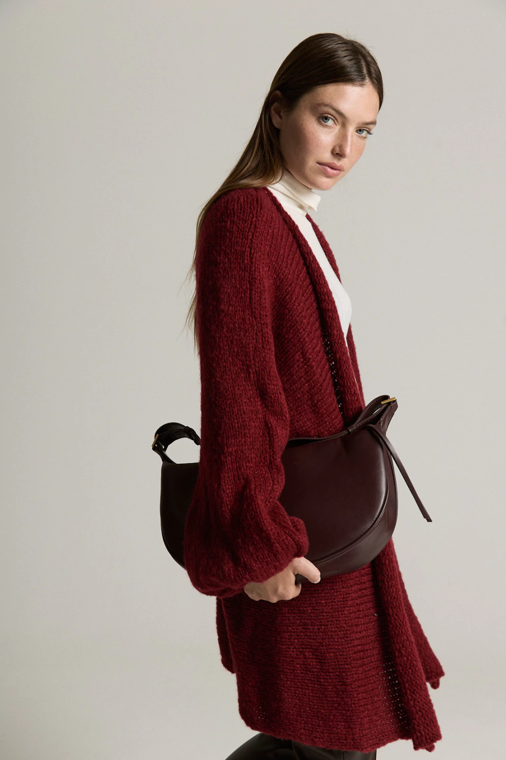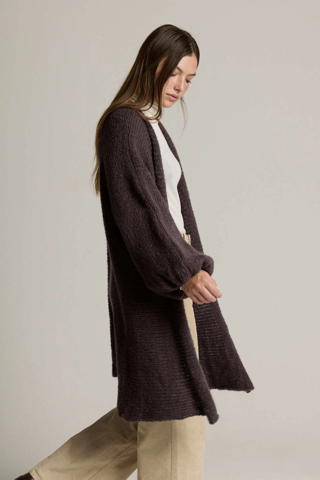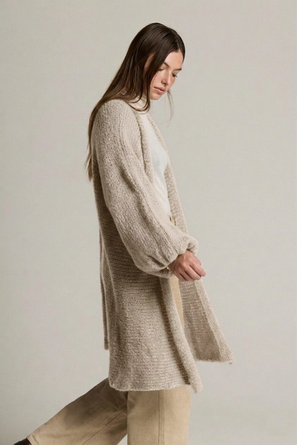 Kimono de mohair de linea suelta con diseño abierto y mangas semiballoon. Tejido en maquina manual familiar en técnica de tejido entero, sin costuras y terminaciones a mano.