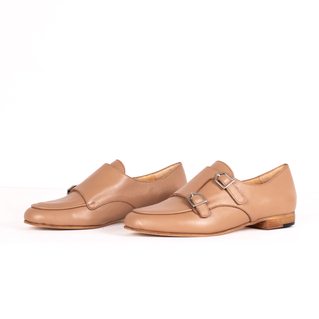 Mocasín confeccionado íntegramente en cuero vacuno color mocca, con forrería en cuero, plantilla acolchada y detalle de hebillas regulables en la capellada.