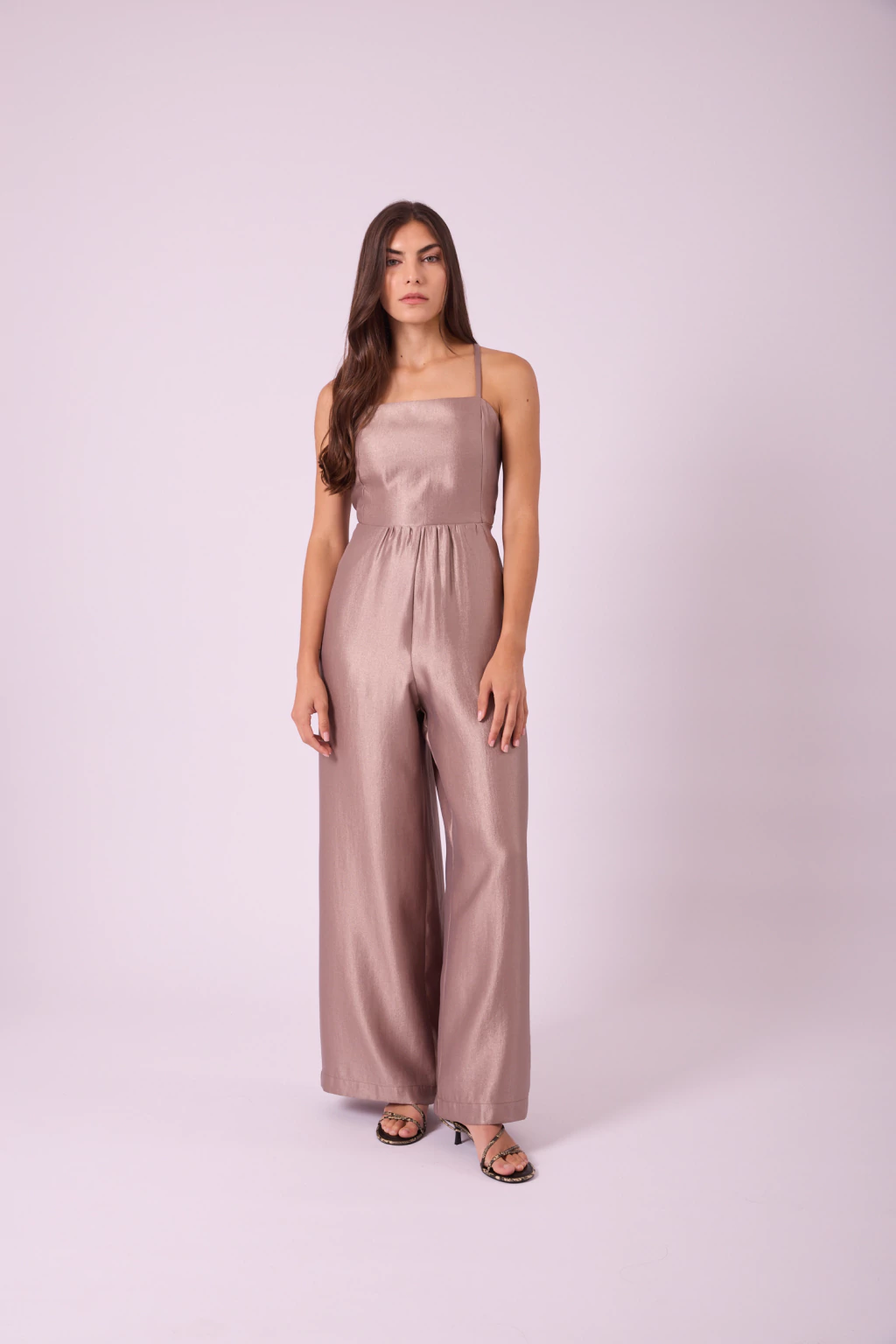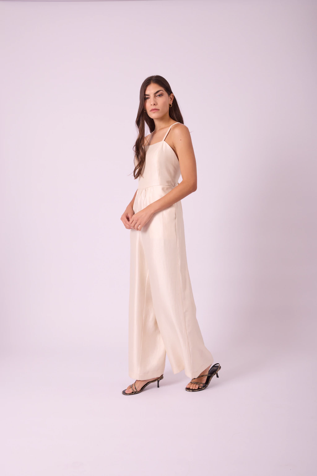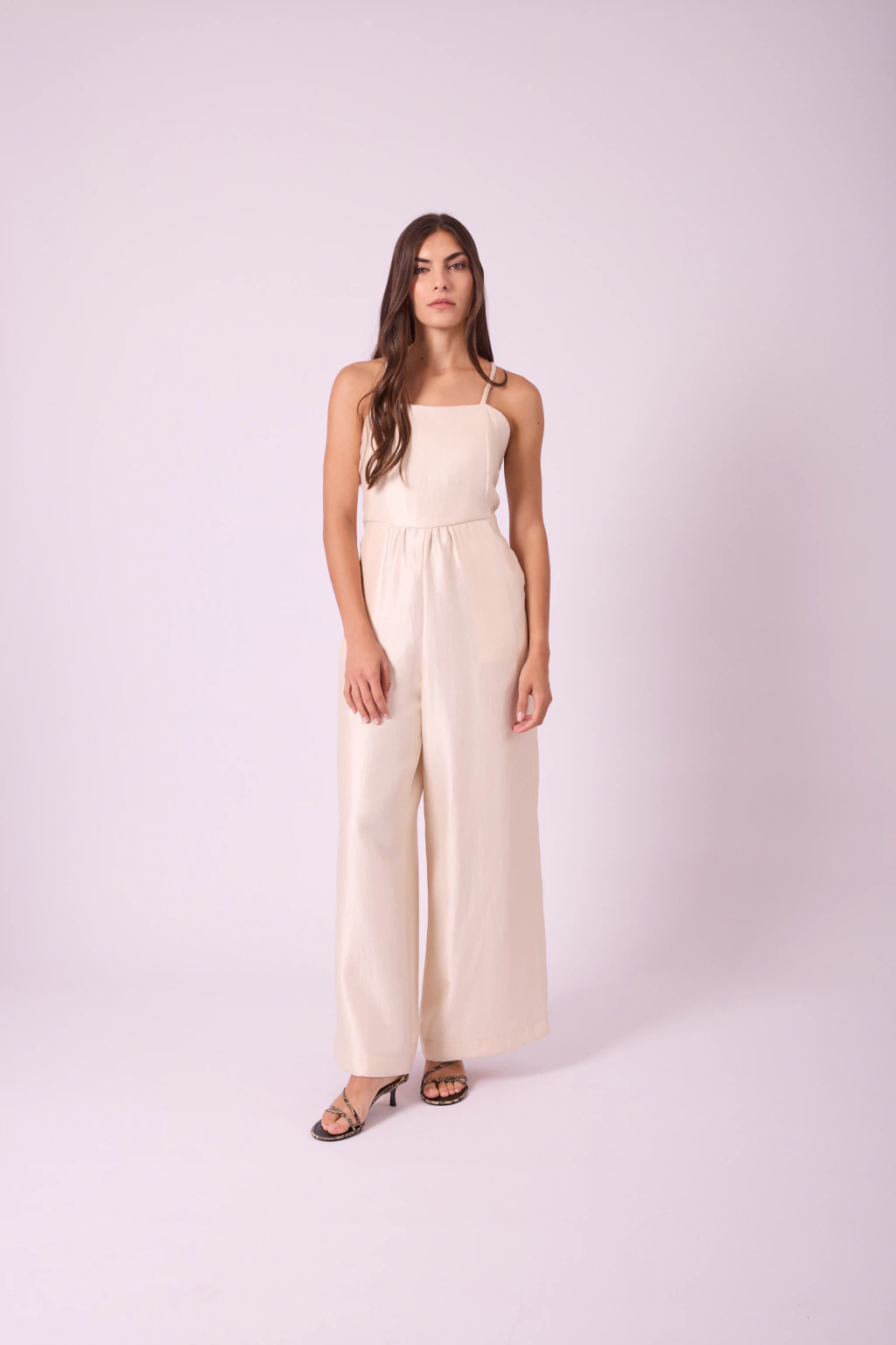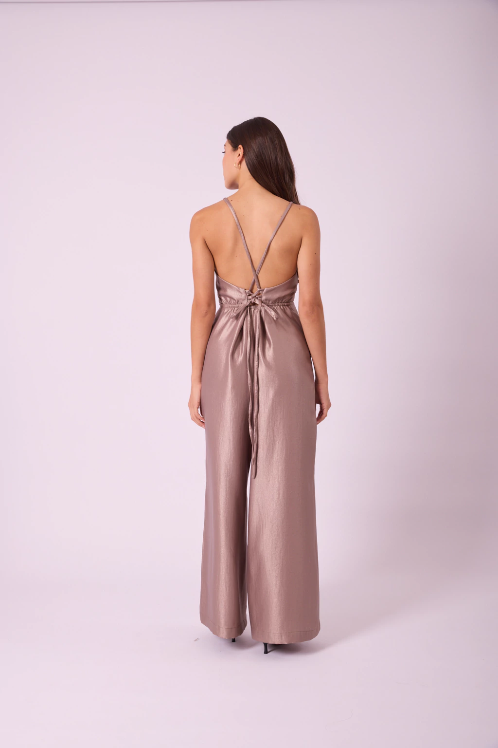 Mono palazzo de sarga satinada con espalda descubierta, tiras finas regulables, escote cuadrado y bolsillos laterales