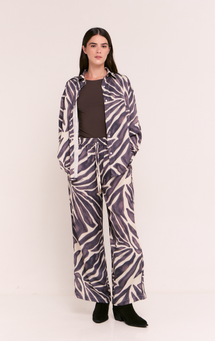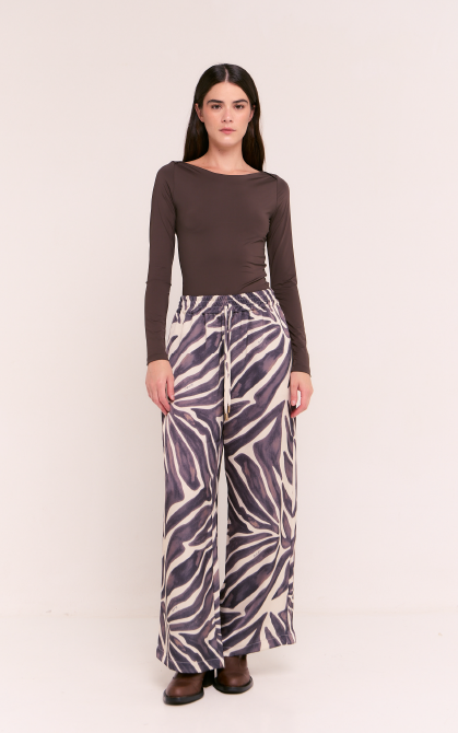 Palazzo de sedita con cintura elástica. Con bolsillos laterales y lazo con detalle de terminaciones en color dorado
