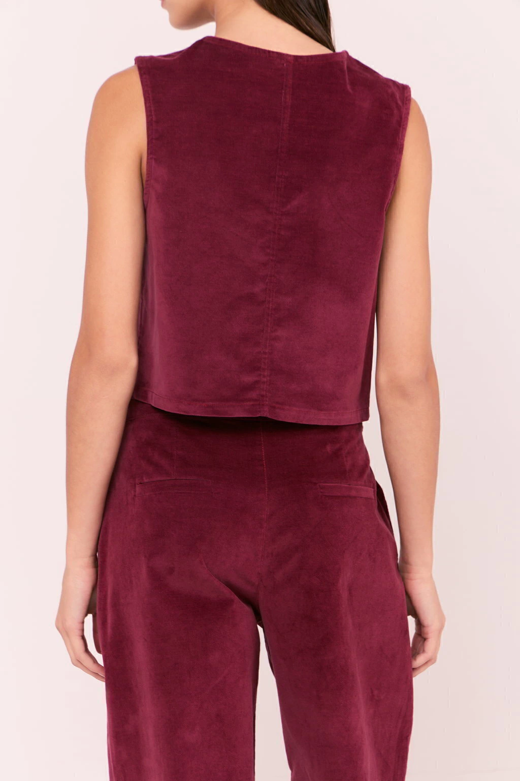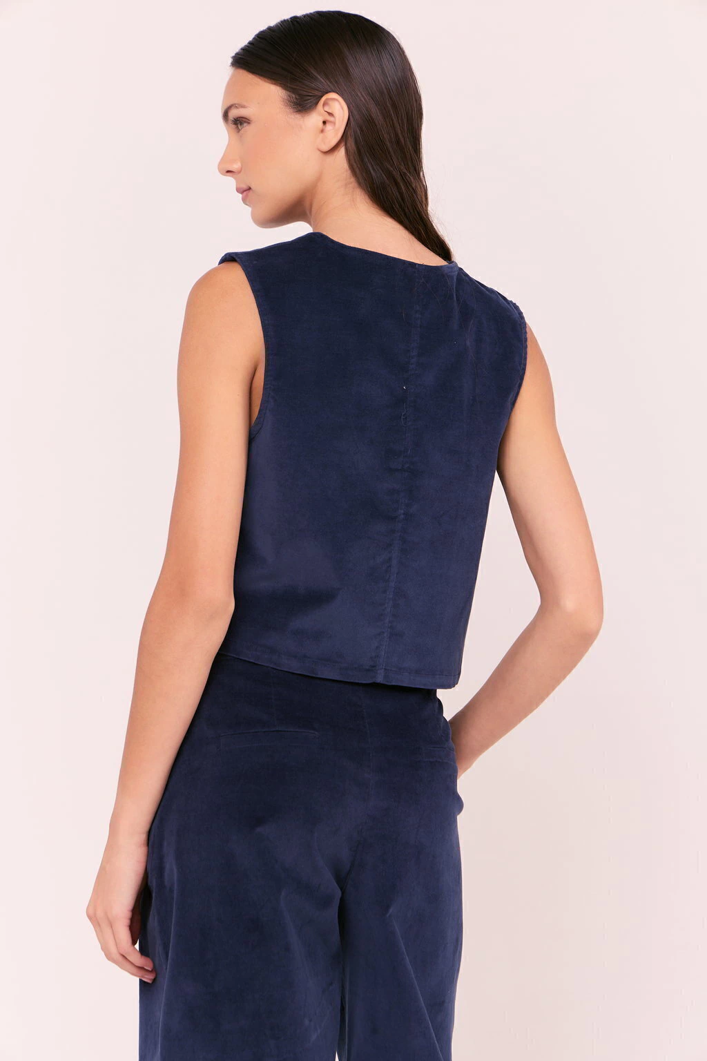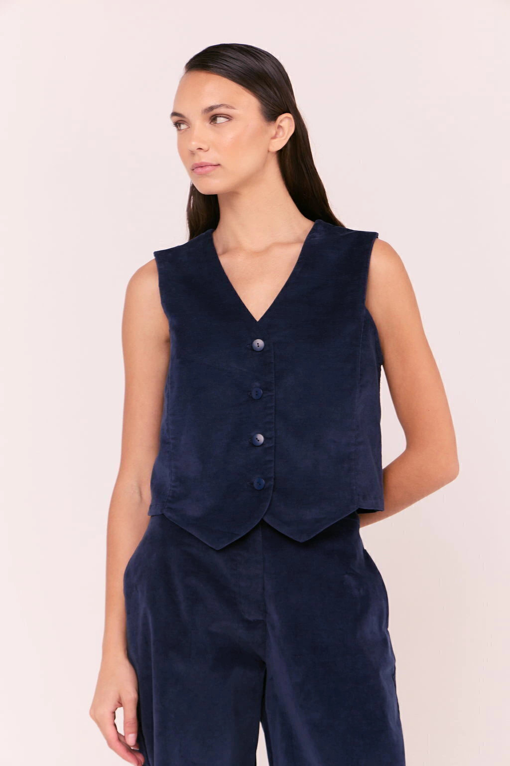 Pantalón wide leg de pana con spandex. Cintura fija con acceso mediante botón metálico a tono y personalizado. Tiene bolsillos laterales y bolsillos ojal traseros falsos
