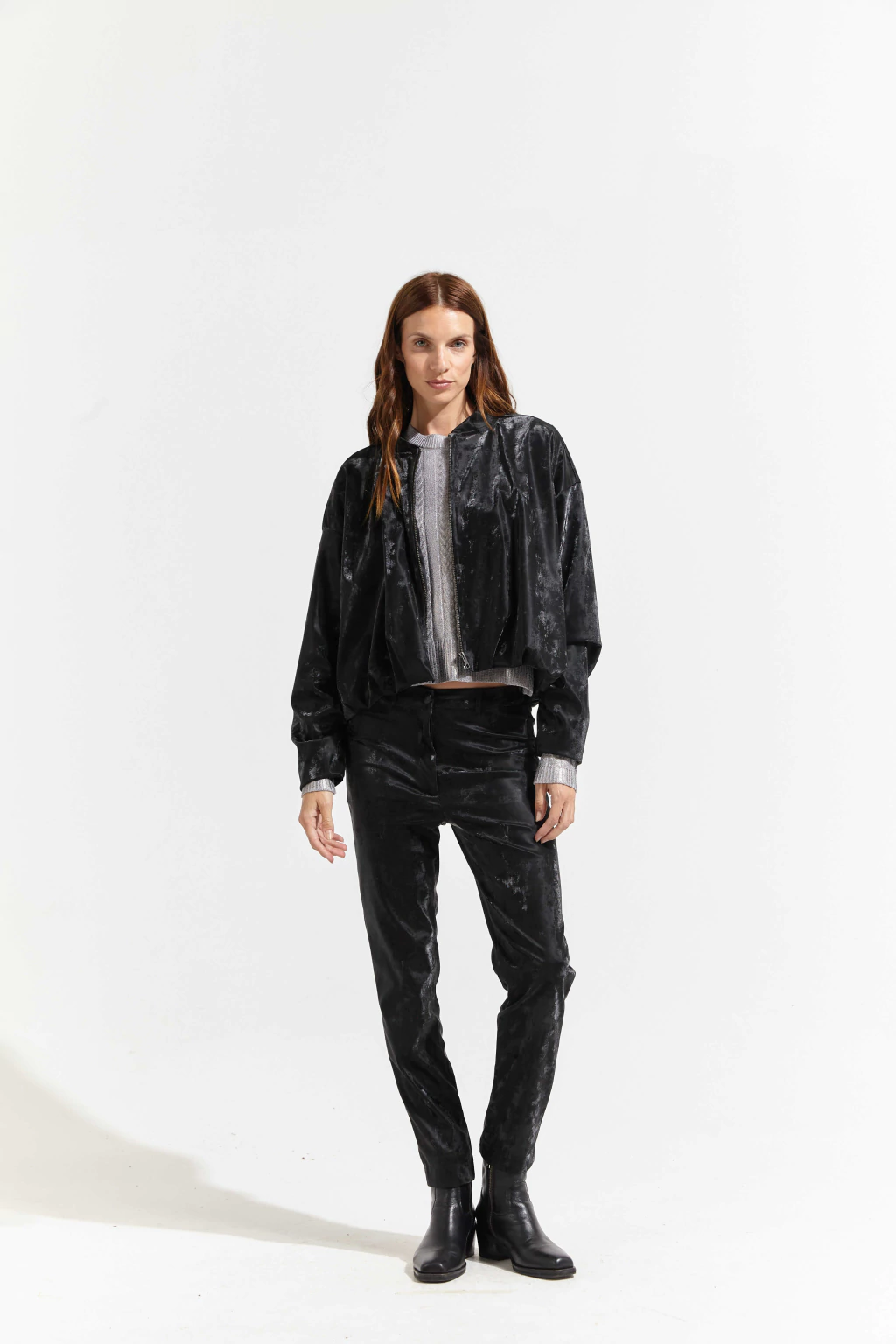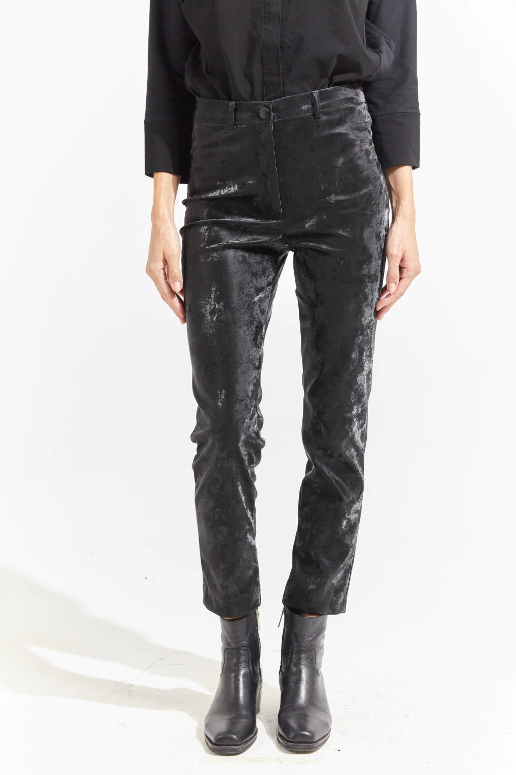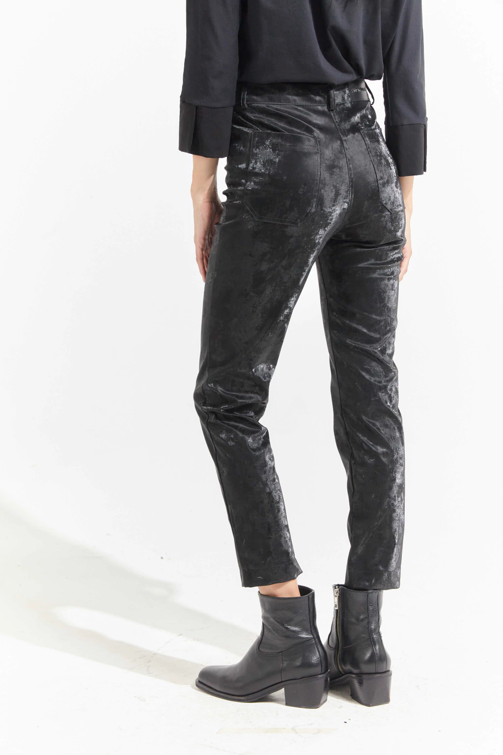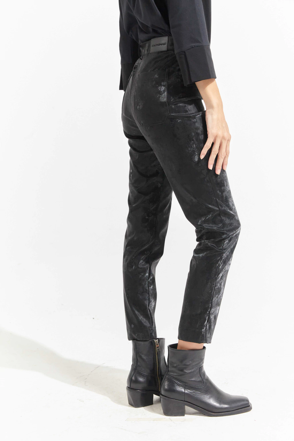 Pantalón confeccionado en un tejido engomado con textura. Tiro alto con bolsillos traseros y delanteros, botón metálico personalizado y pasacinto.