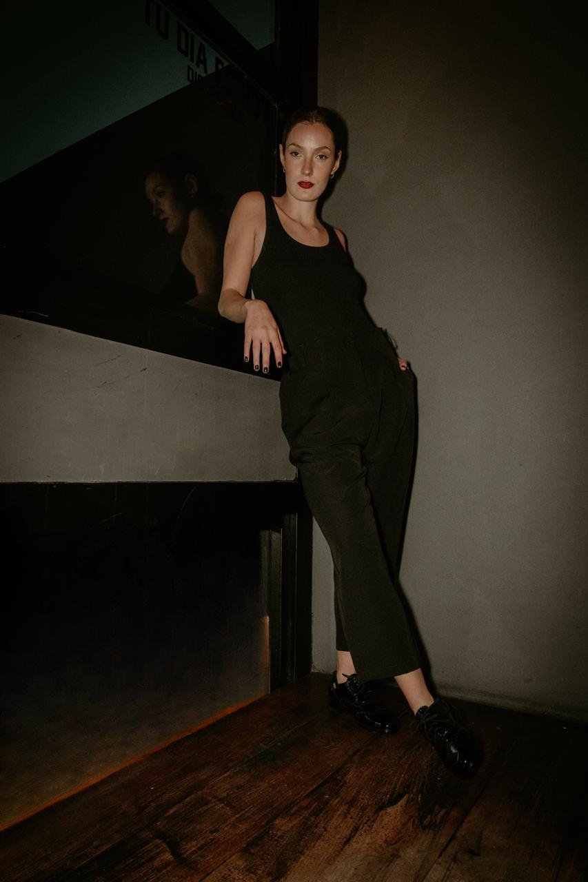 Pantalón sastrero de crepe, con botón a tono, tiro alto, pinzas y bolsillos