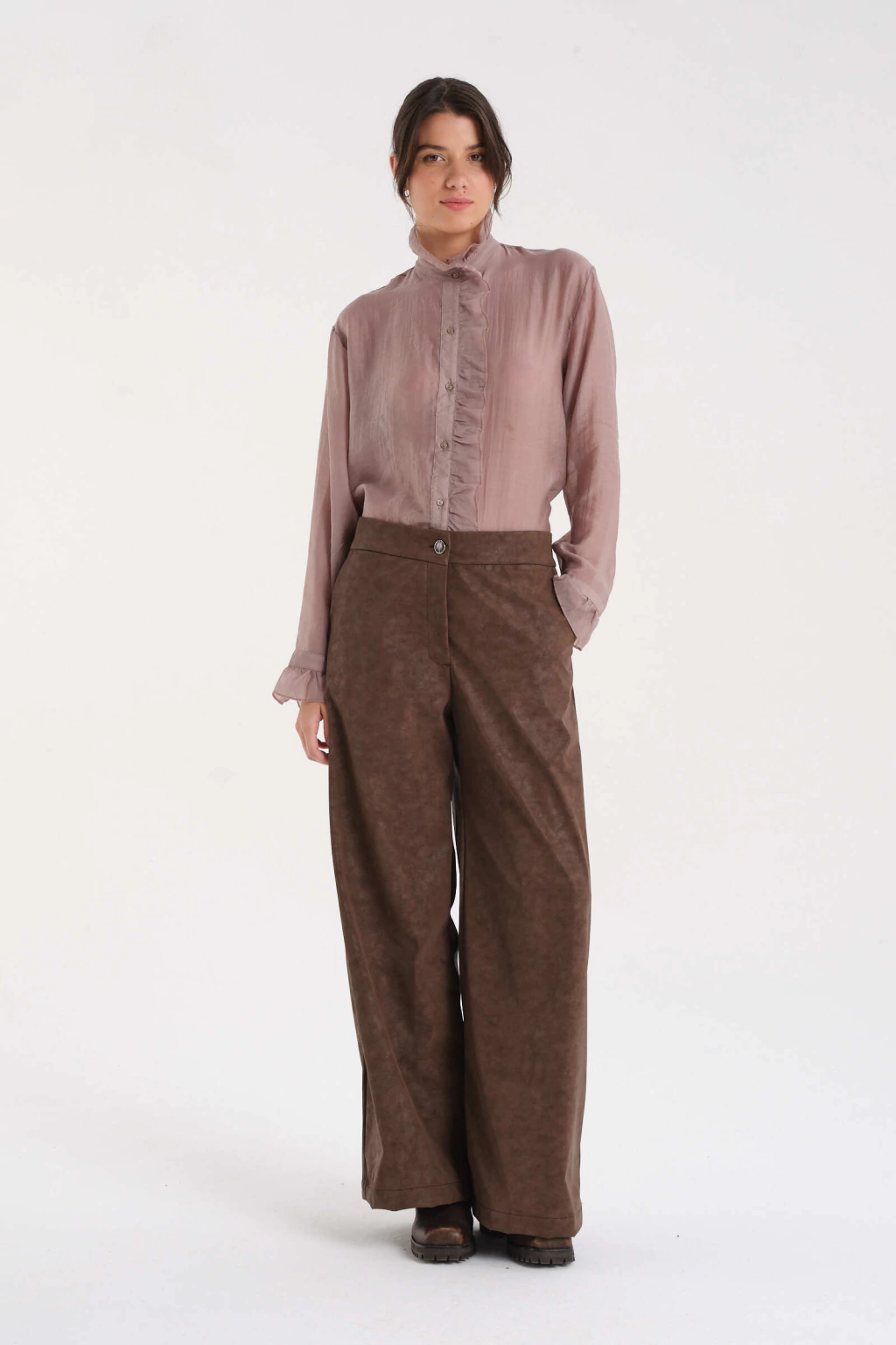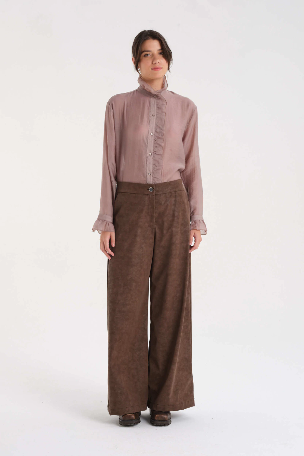 Palazzo confeccionado en tela gamuzada con cintura fija y acceso mediante botón metálico color plata. Bolsillos laterales y falsos bolsillos ojal traseros