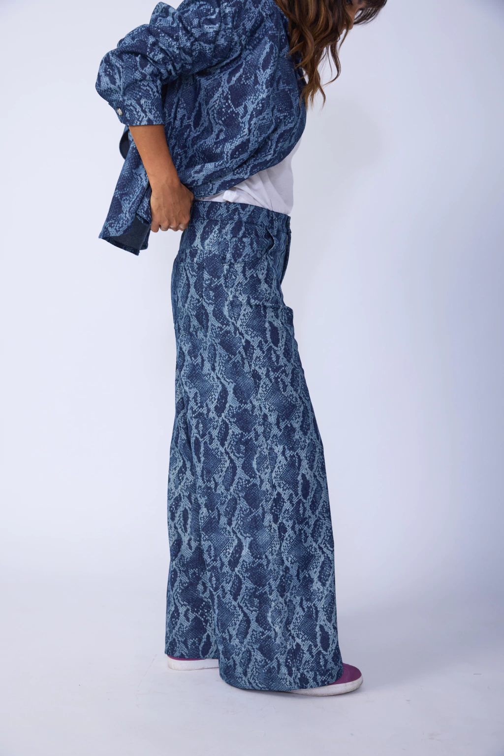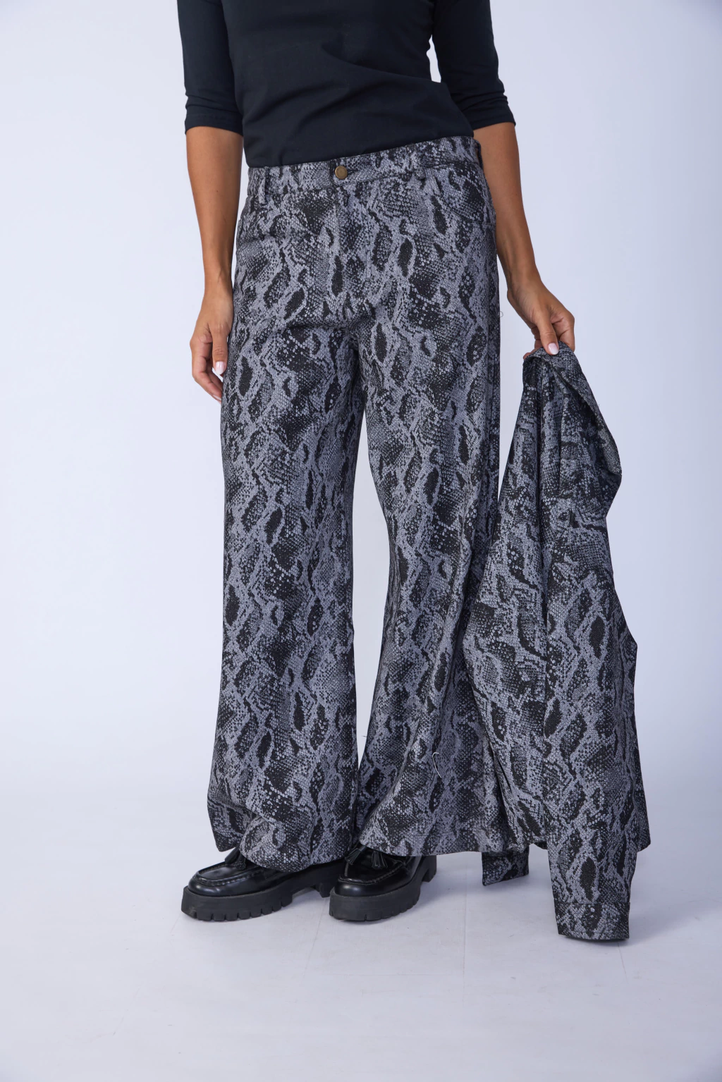 Pantalón wide leg de gabardina estampada con cintura fija con botón metálico color bronce y presillas pasacintos. Bolsillos traseros cuadrados