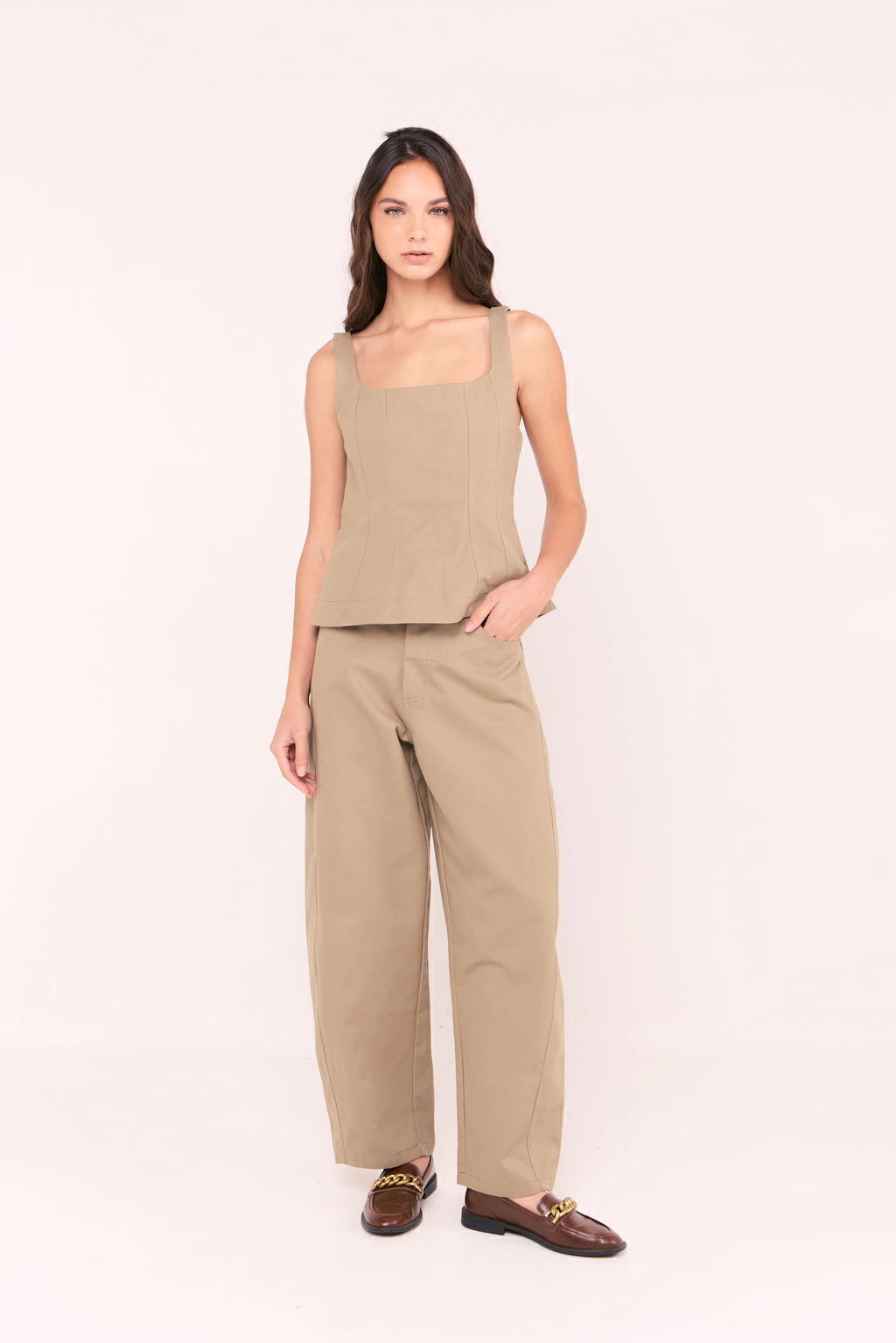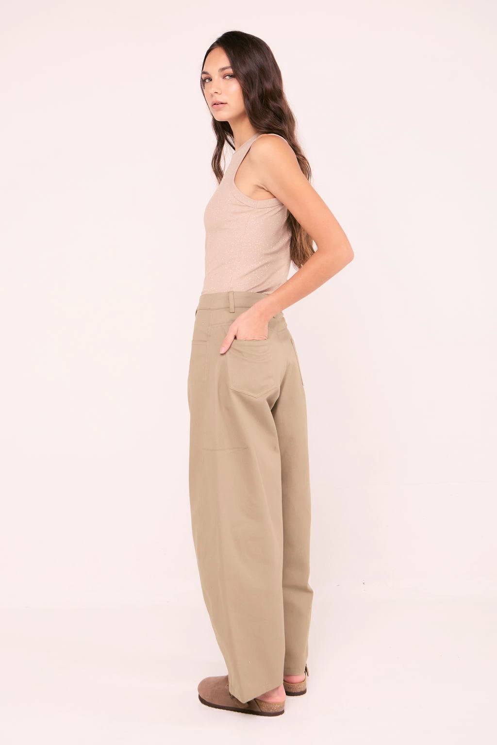 Pantalón tiro medio, de corte balloon con recortes en el lateral  logrando una silueta “barrel”. Detalle de bolsillo plaqué en espalda y bolsillos laterales. El acceso es mediante una cartera con cierre y botón jeanero personalizado. El largo modular de la prenda se extiende por debajo del tobillo aproximadamente.