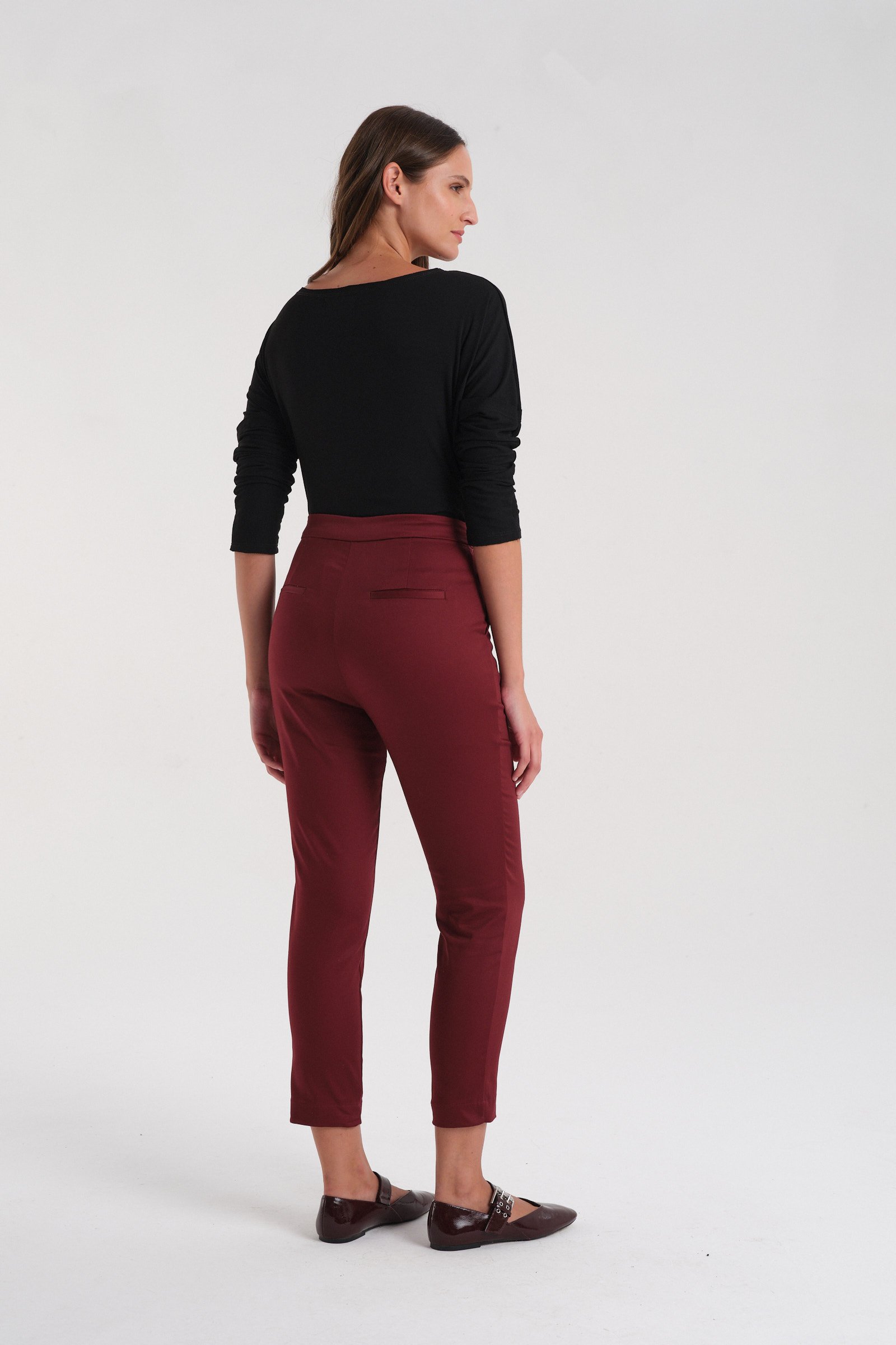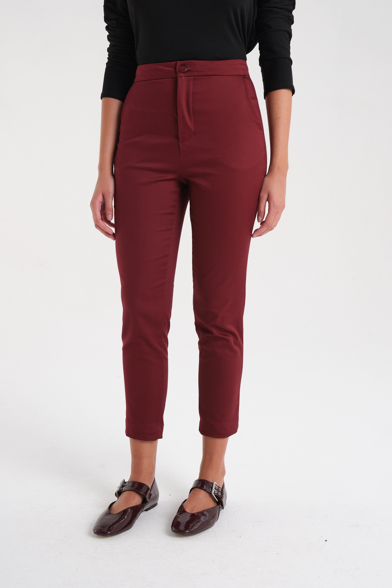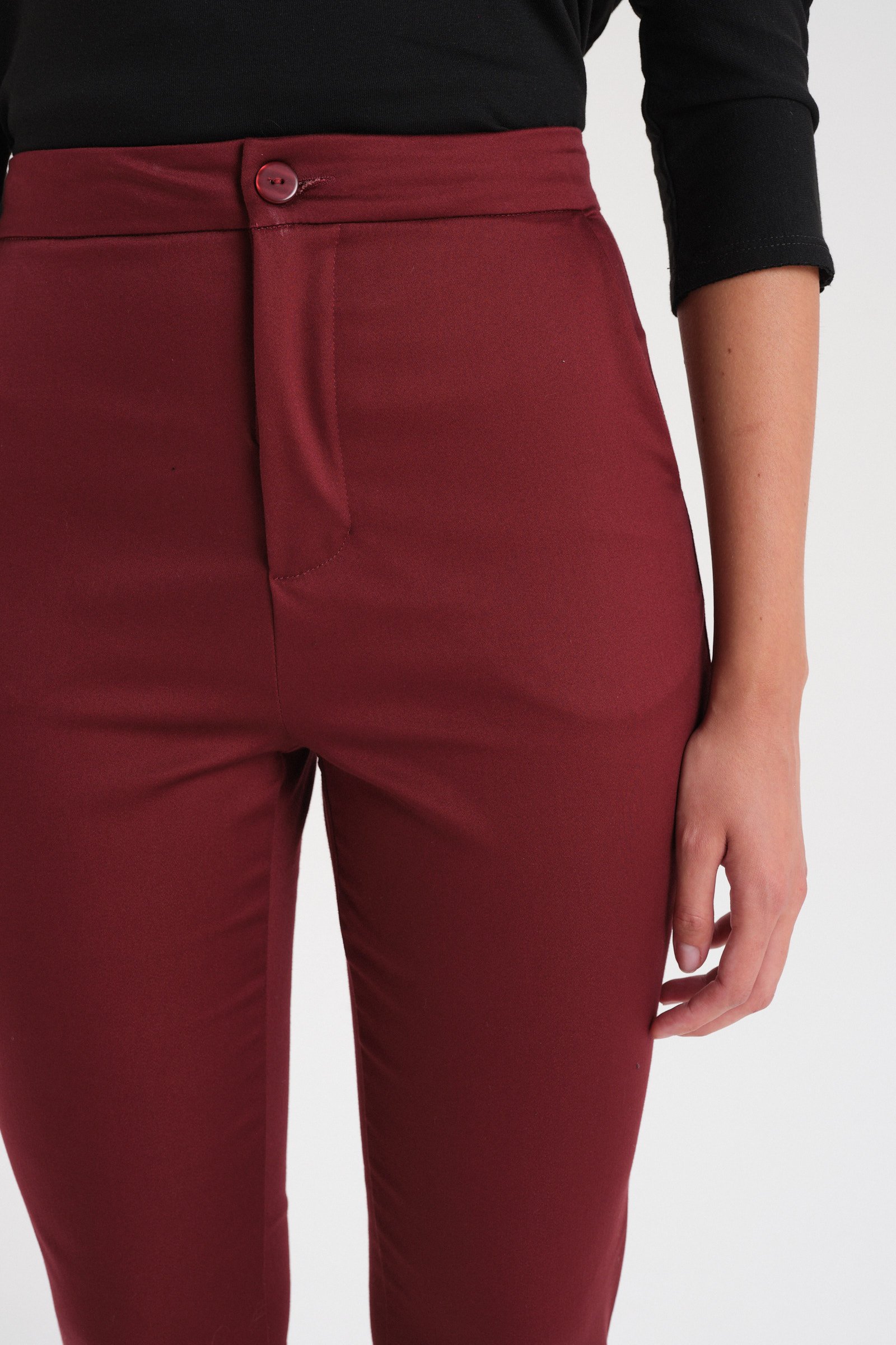 Pantalón sastrero de rayón tiro alto con spandex. Con cintura fija y acceso mediante botón de pasta al tono. Tiene bolsillos laterales y bolsillos traseros tipo ojal