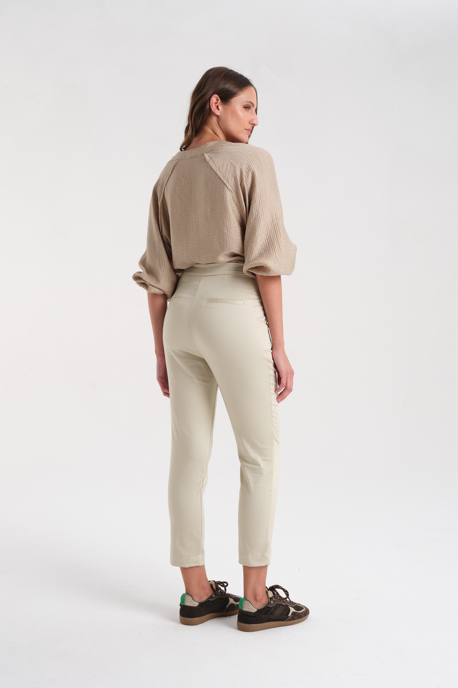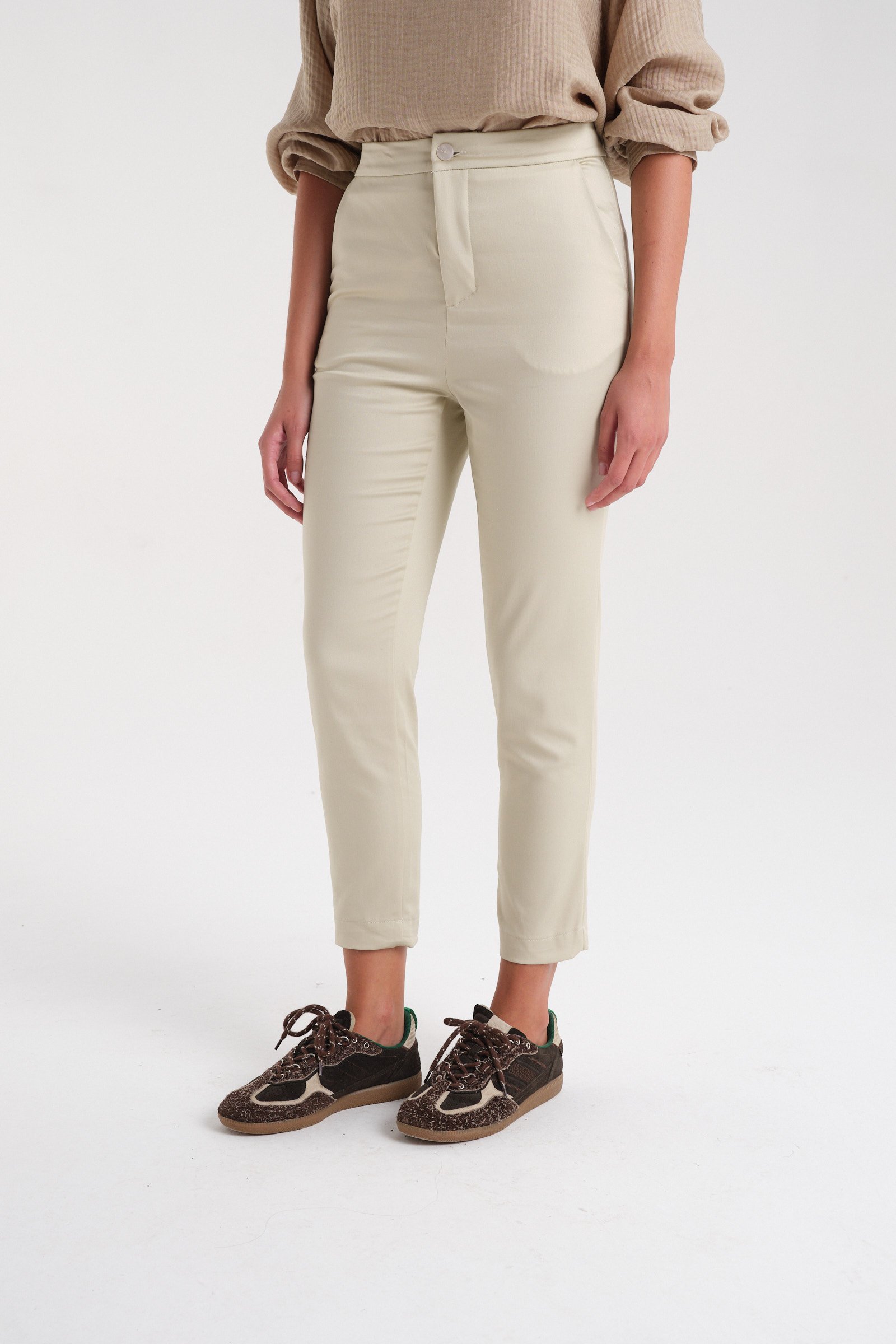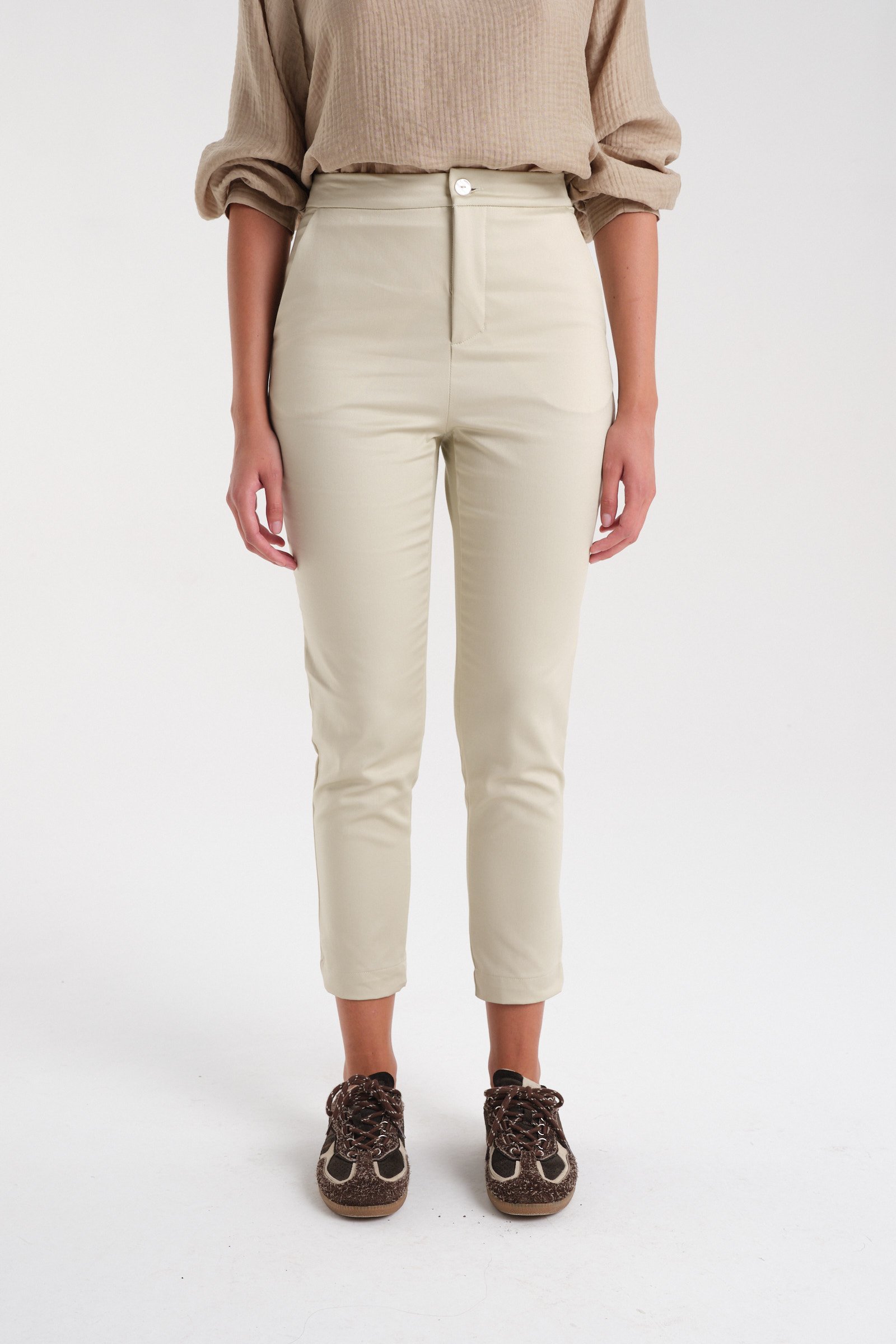 Pantalón sastrero de rayón tiro alto con spandex. Con cintura fija y acceso mediante botón de pasta al tono. Tiene bolsillos laterales y bolsillos traseros tipo ojal