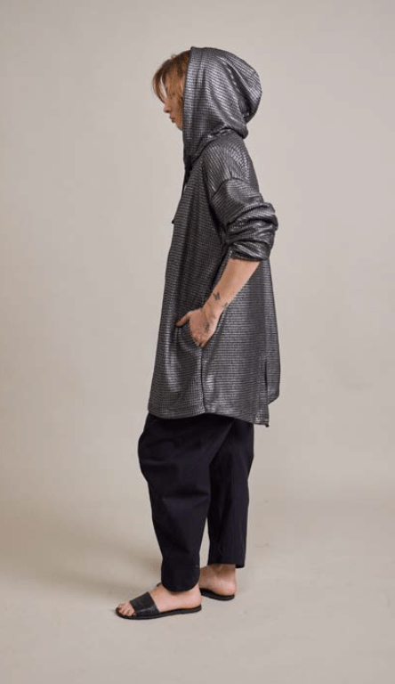 Parka larga de red con foil con capucha con cordón ajustable, cierre frontal y cordón ajustable en el largo trasero