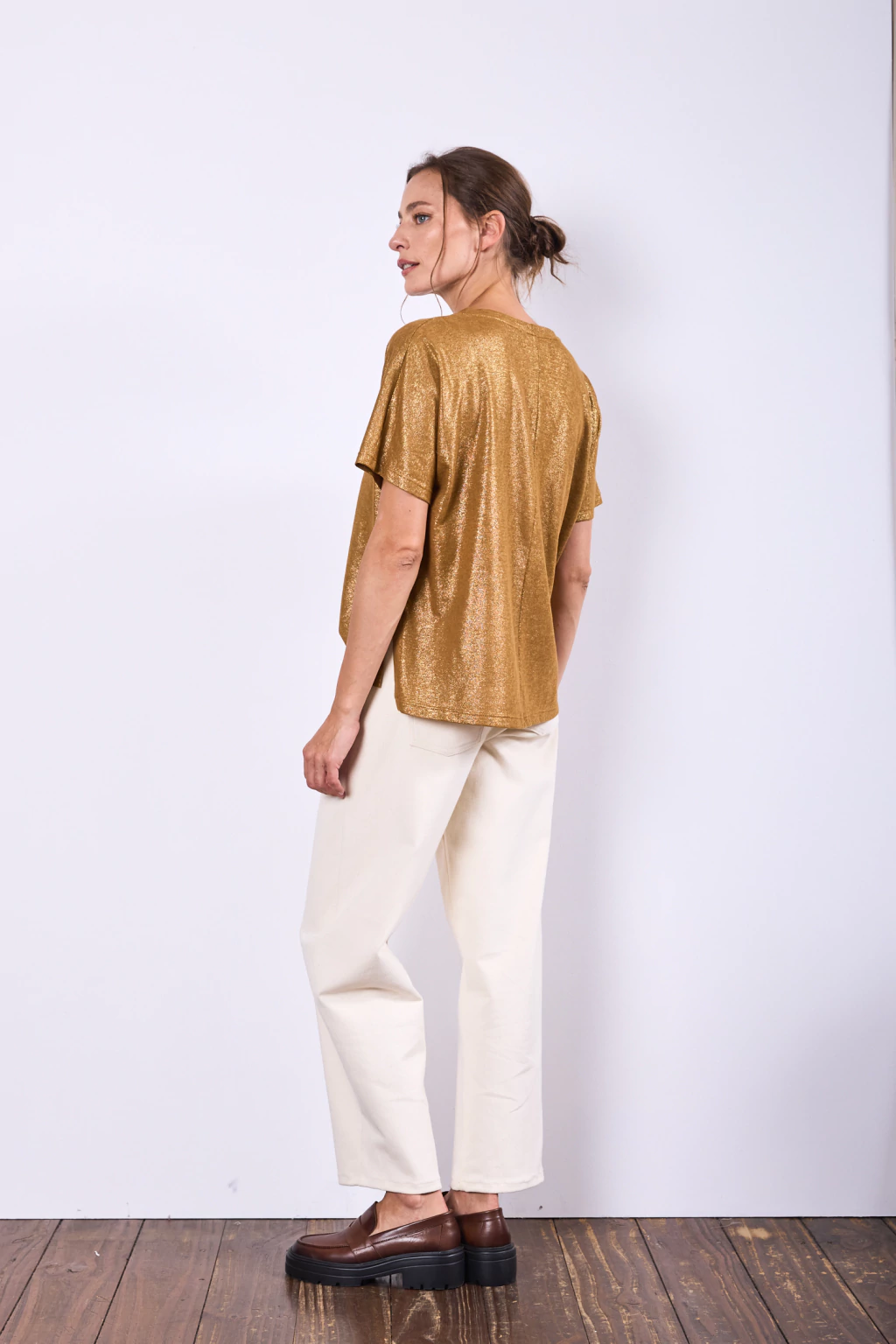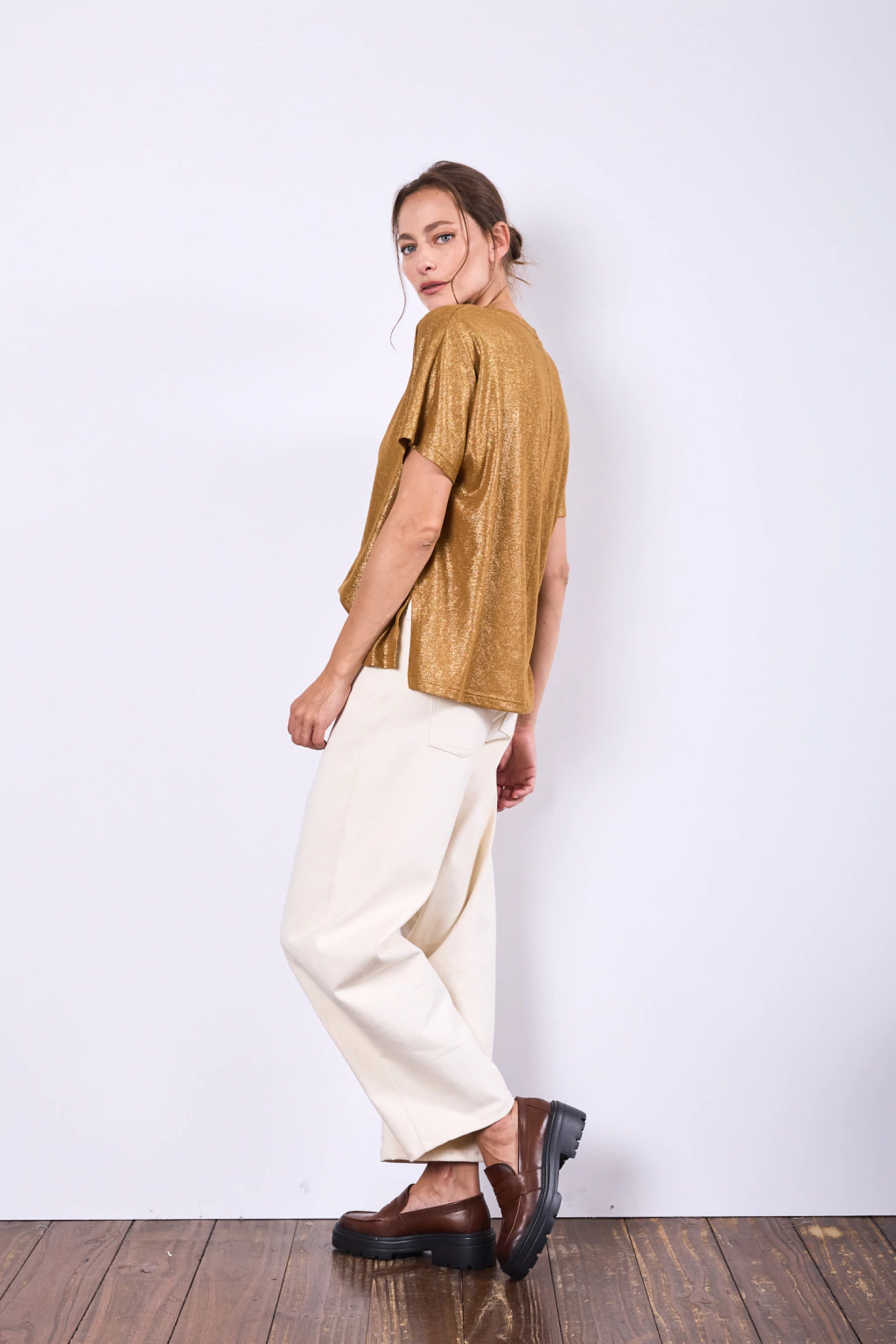 Remera manga corta de flame con foil. Escote redondo y tajos en los laterales.