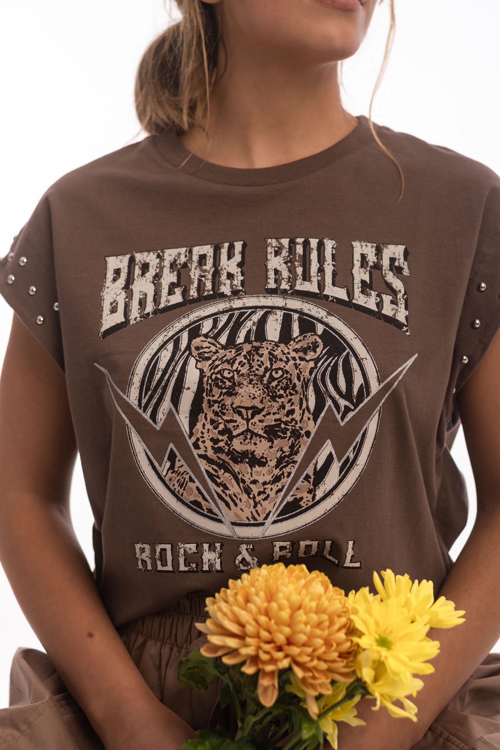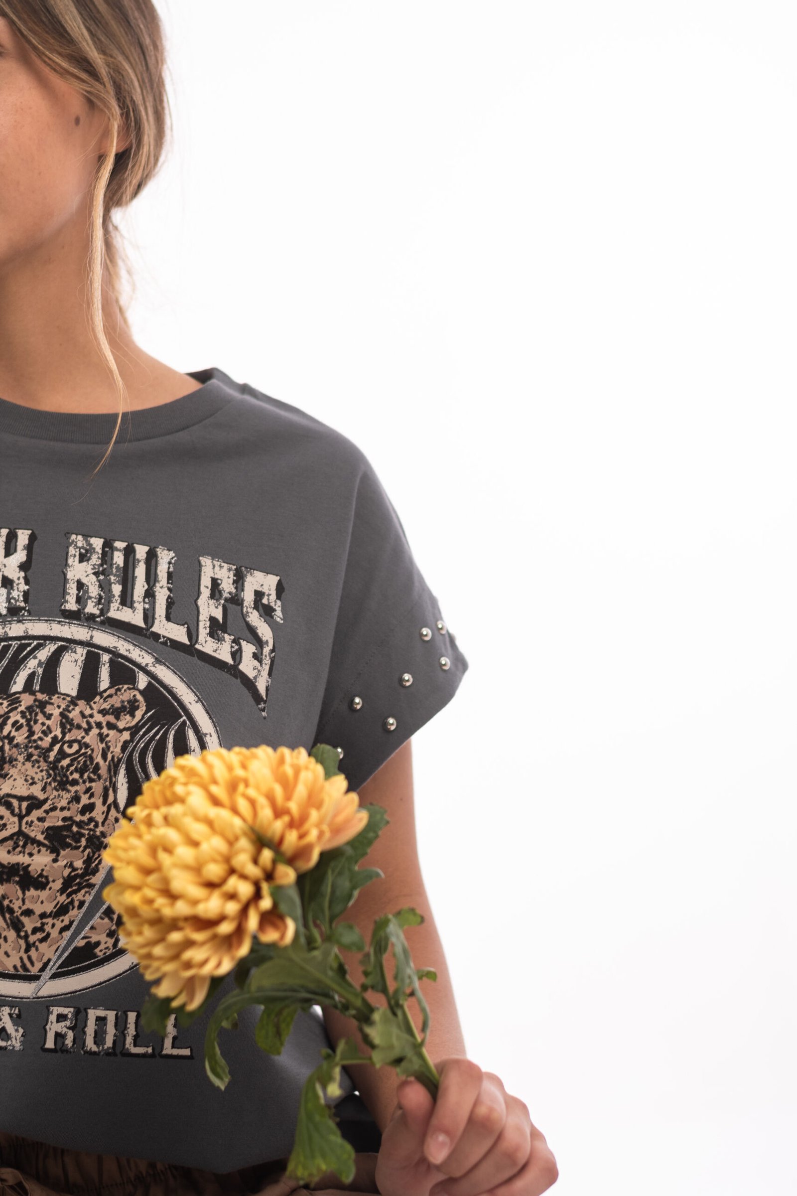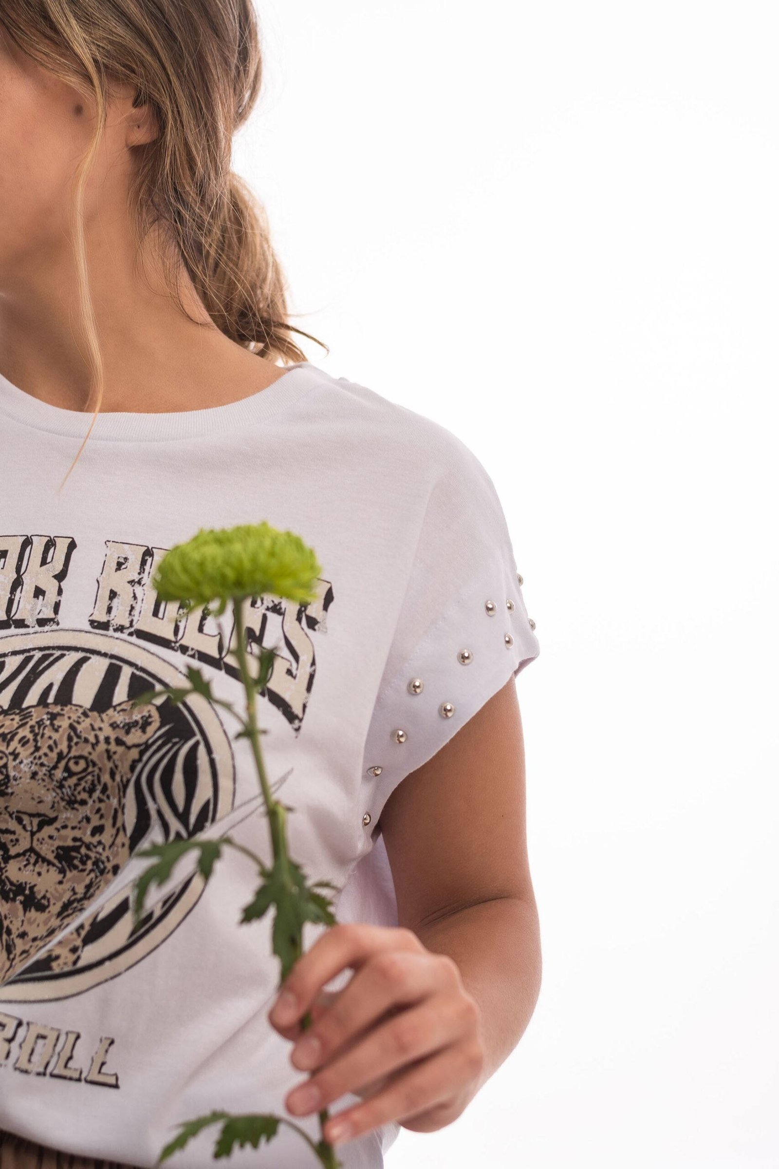 Remera estampada escote redondo con tachas en el borde de manga