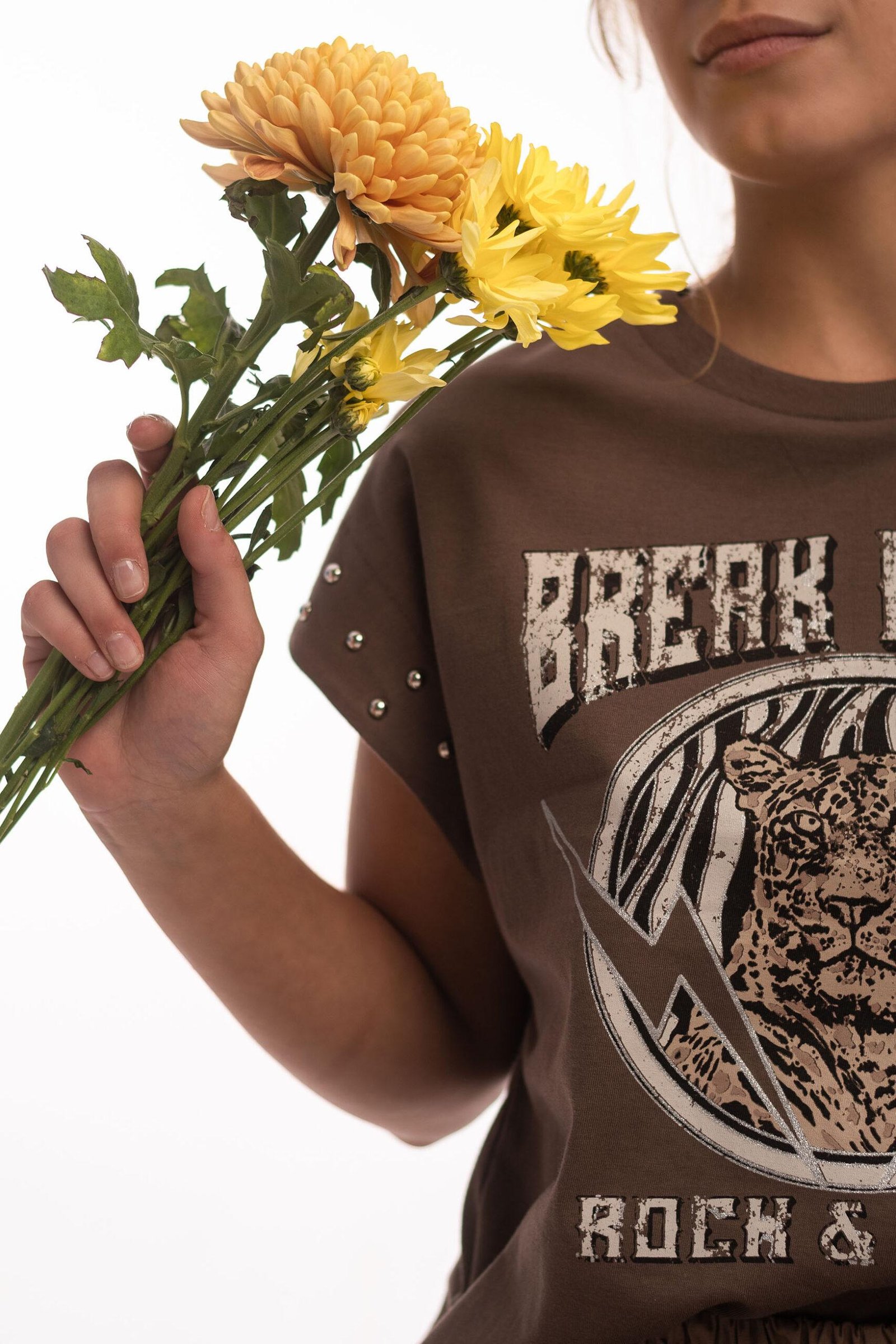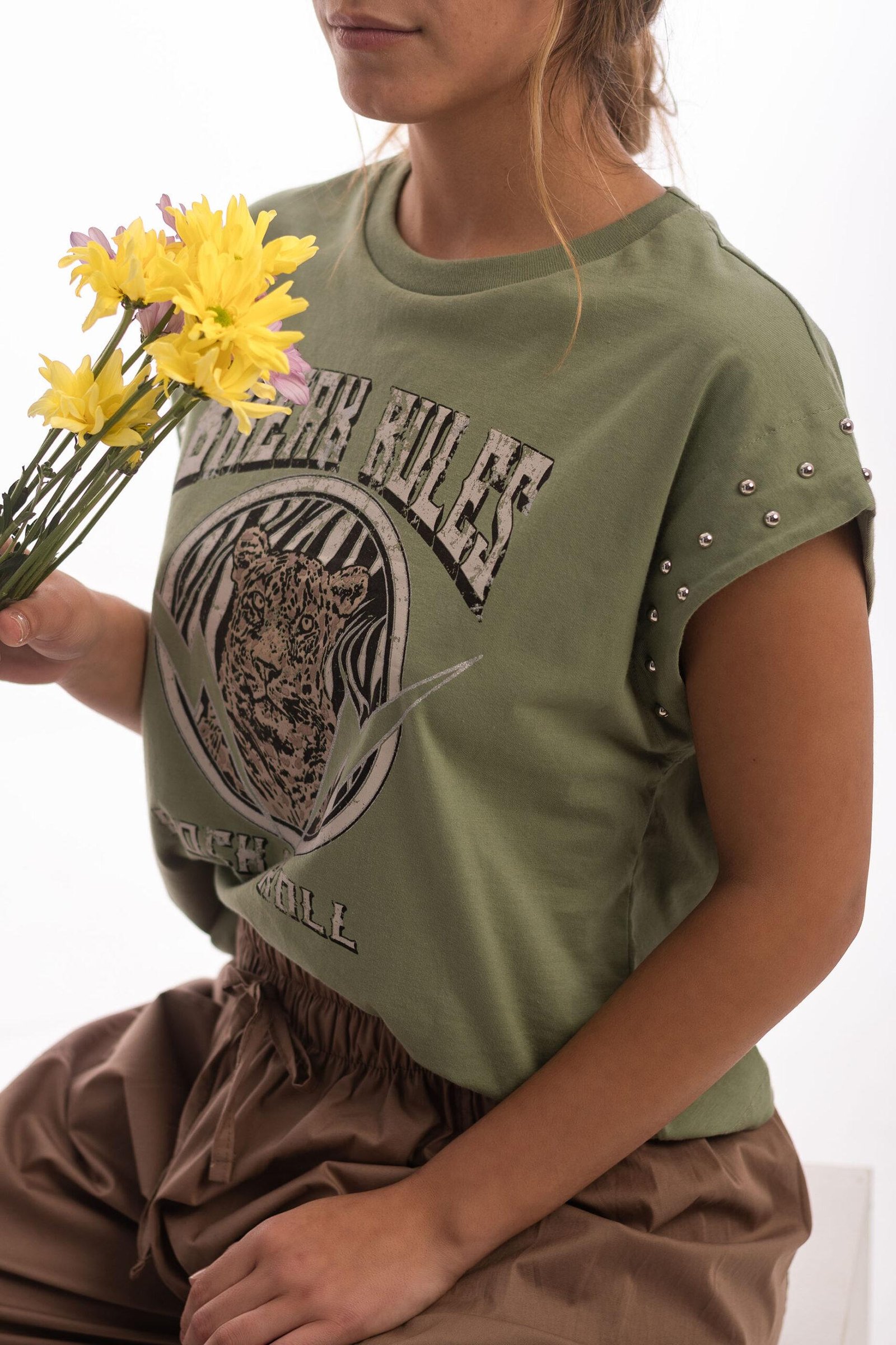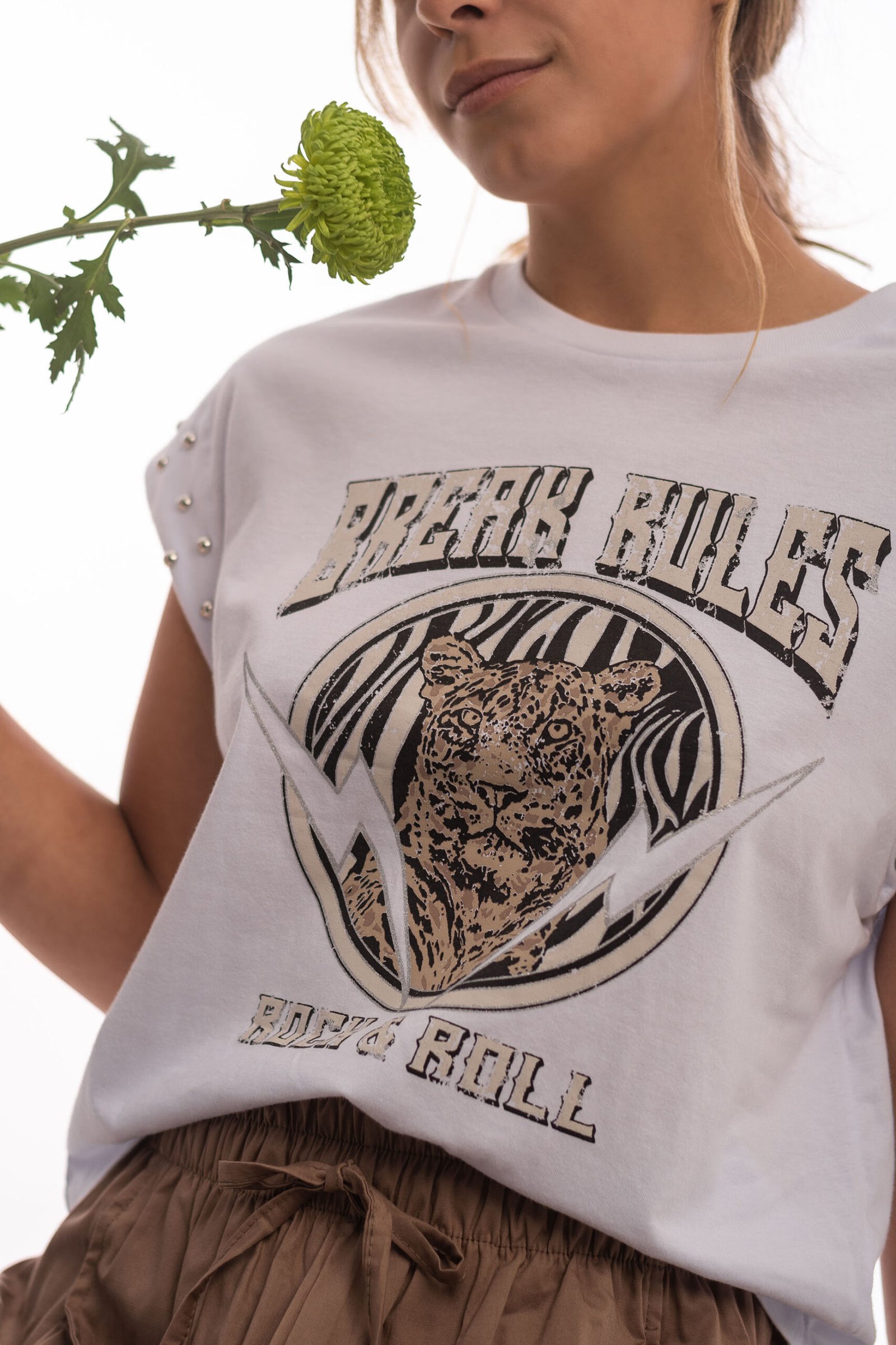 Remera estampada escote redondo con tachas en el borde de manga