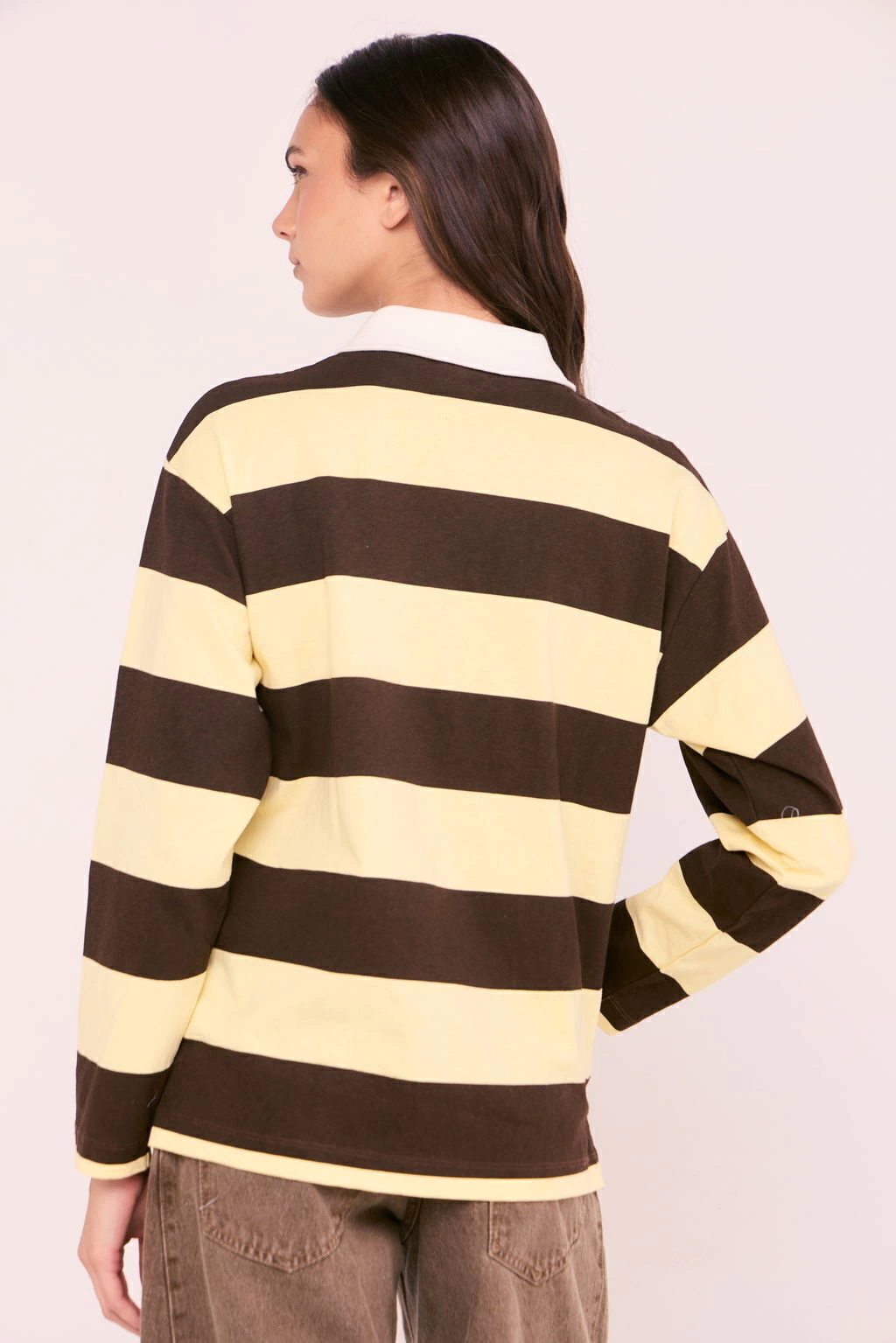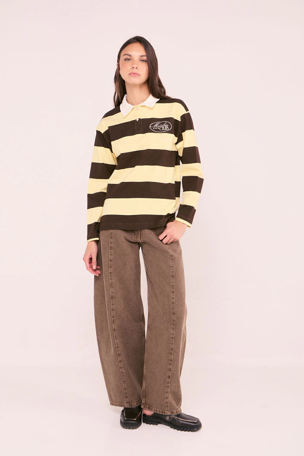Remera mangas largas, tipo polo. De fit regular, recto. Cuello polo de rib, con botones con perlas de diseño. El largo modular de la prenda se extiende por encima de la primera cadera. Posee bordado delantero diseñado exclusivamente por Malabia.