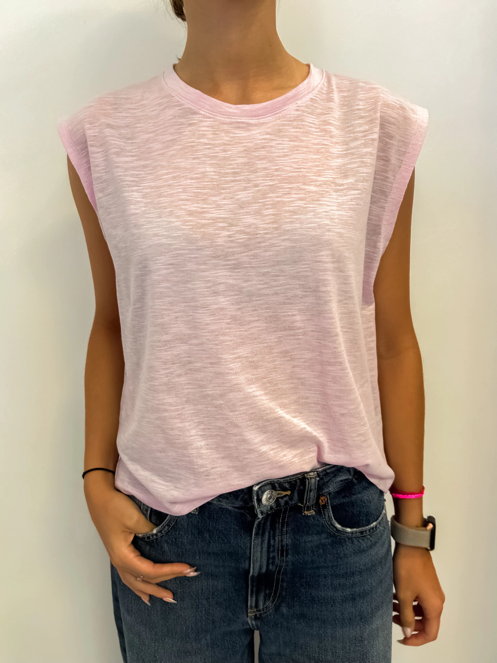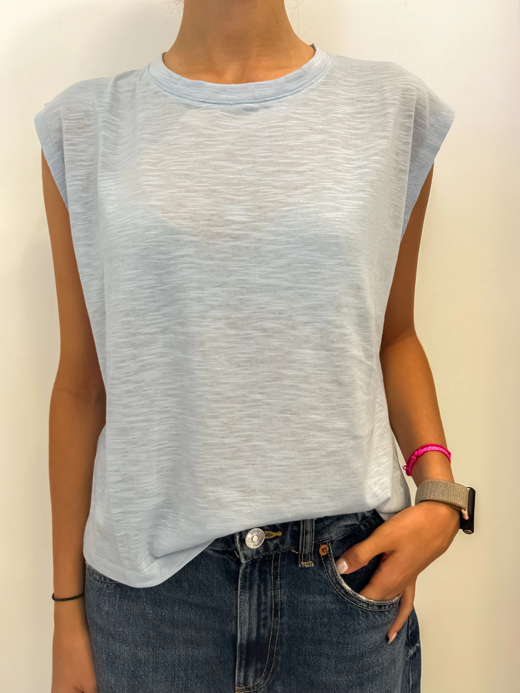 Musculosa over cuello base con manga ancha al hombro. Algodón flamé 100%