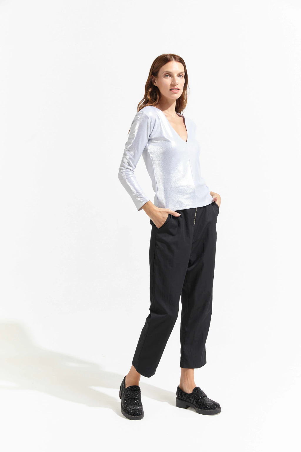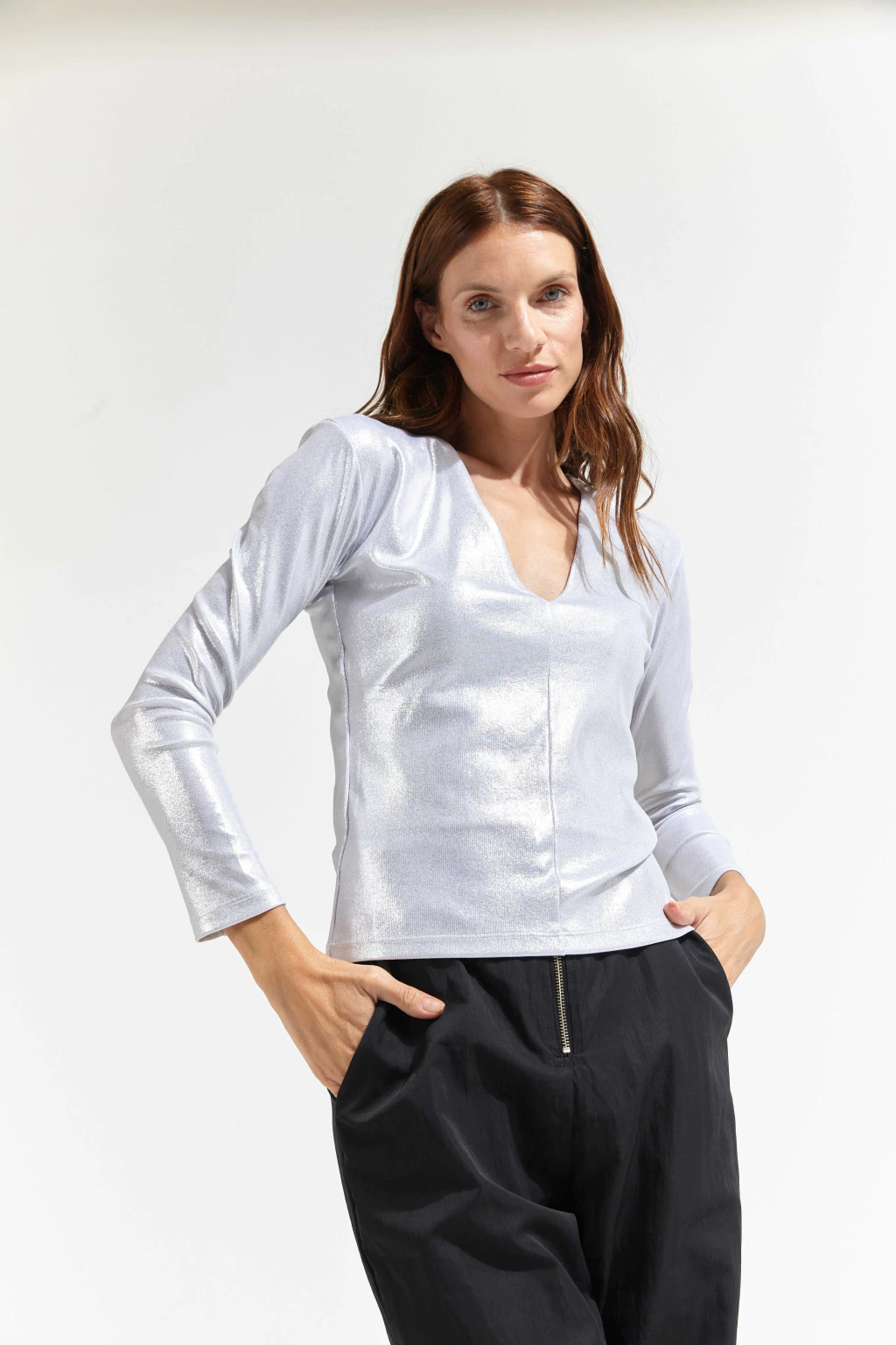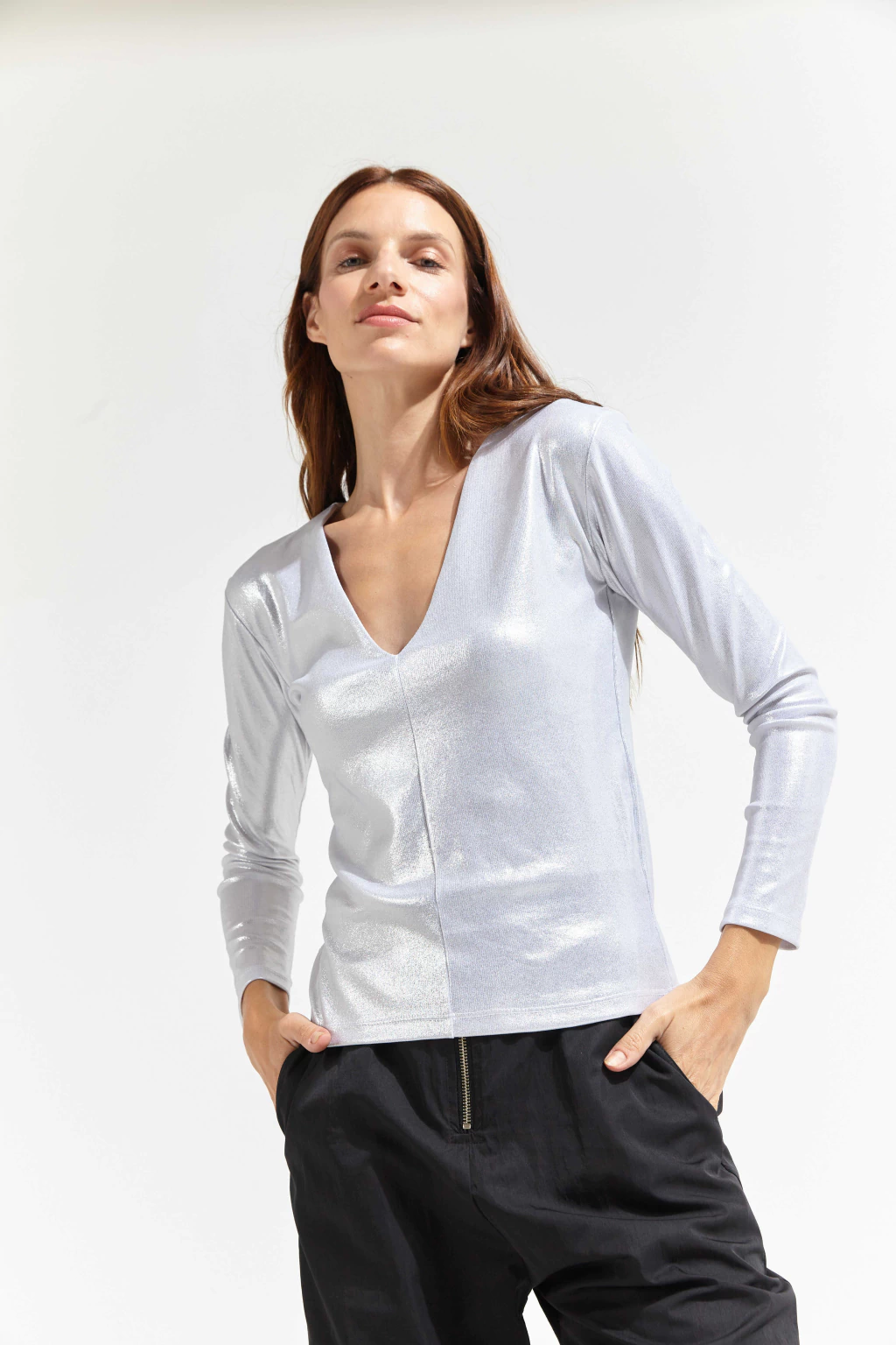 Remera escote en V y manga larga confeccionada en ribb con Foil.