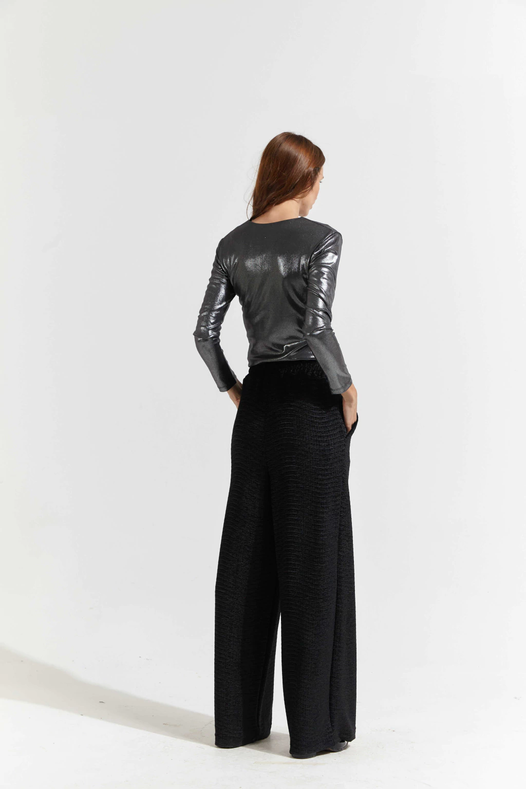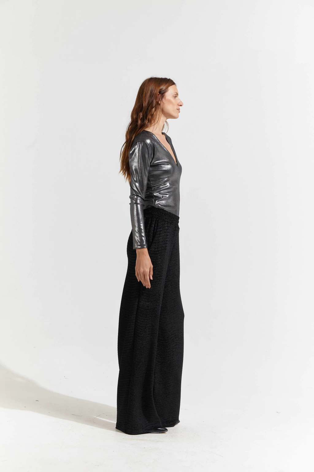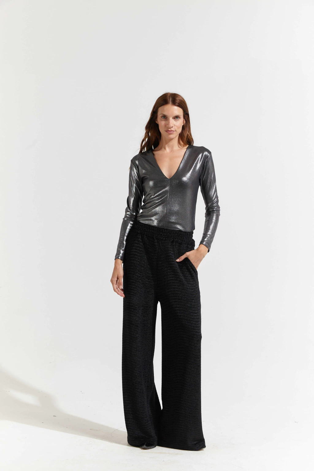 Remera escote en V y manga larga confeccionada en ribb con Foil.