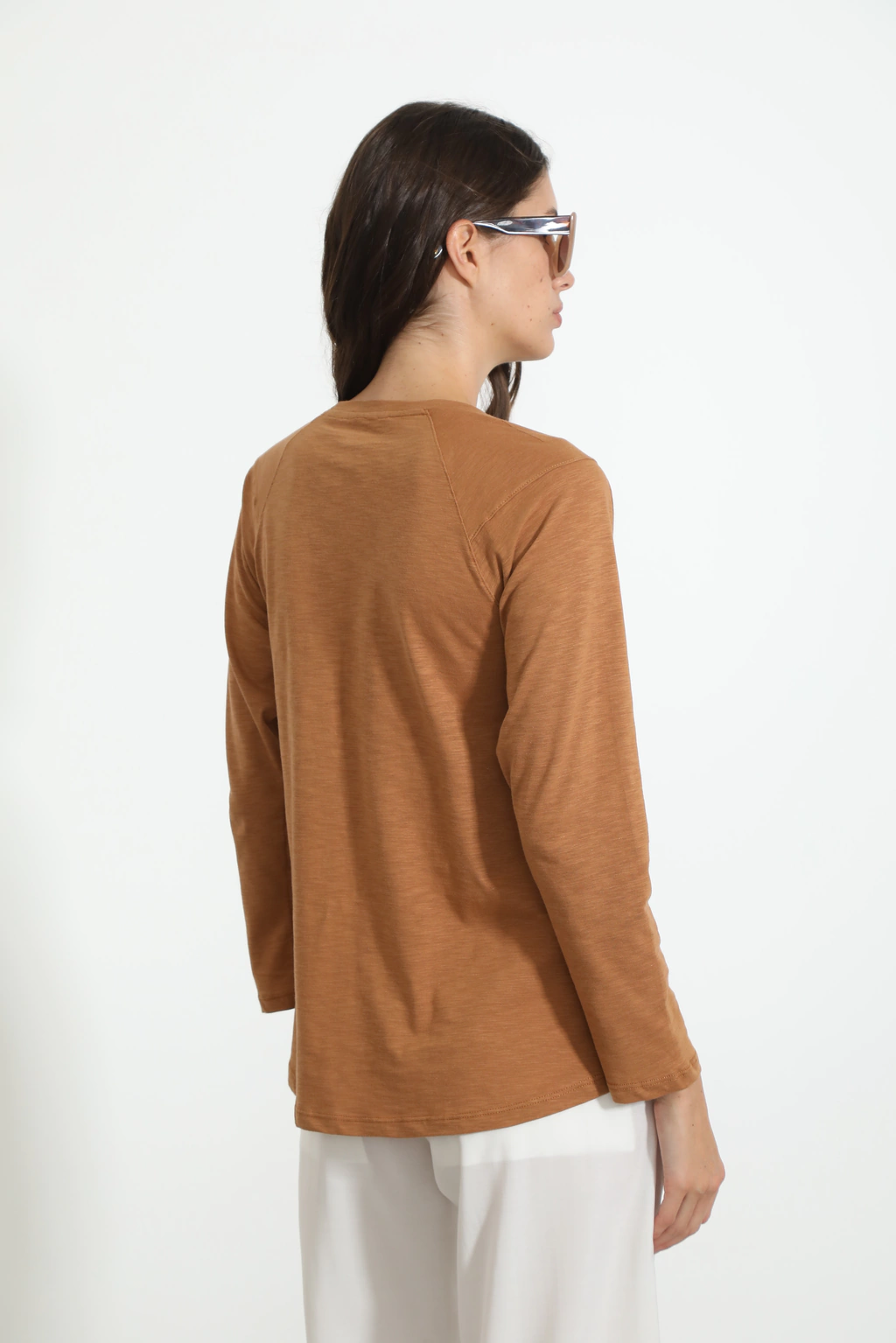 Remera de jersey flame de algodon pima, manga ranglan larga. Proceso de estampa en delantero y estampa de marca en interior de espalda.