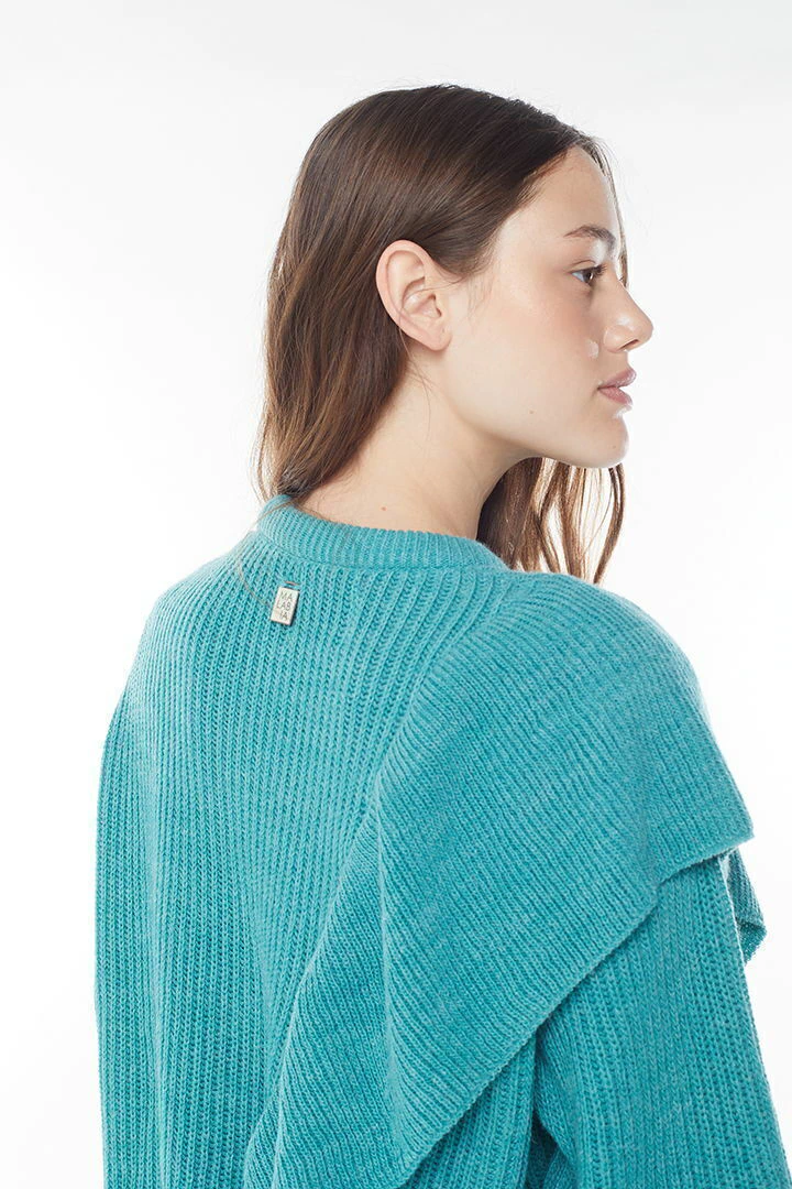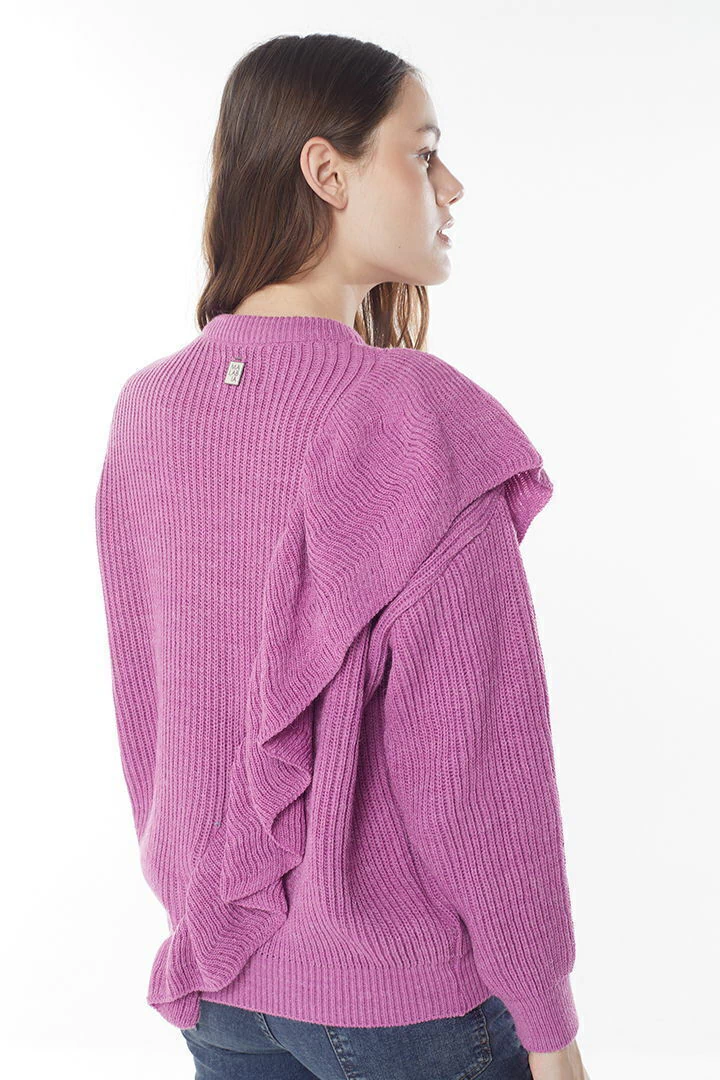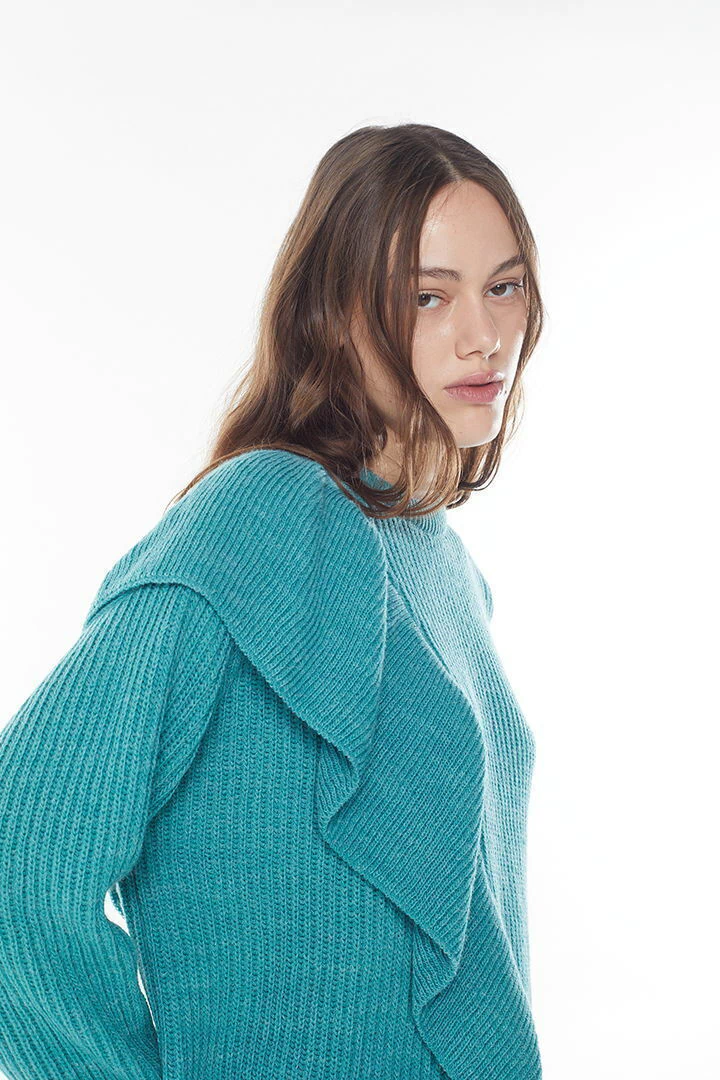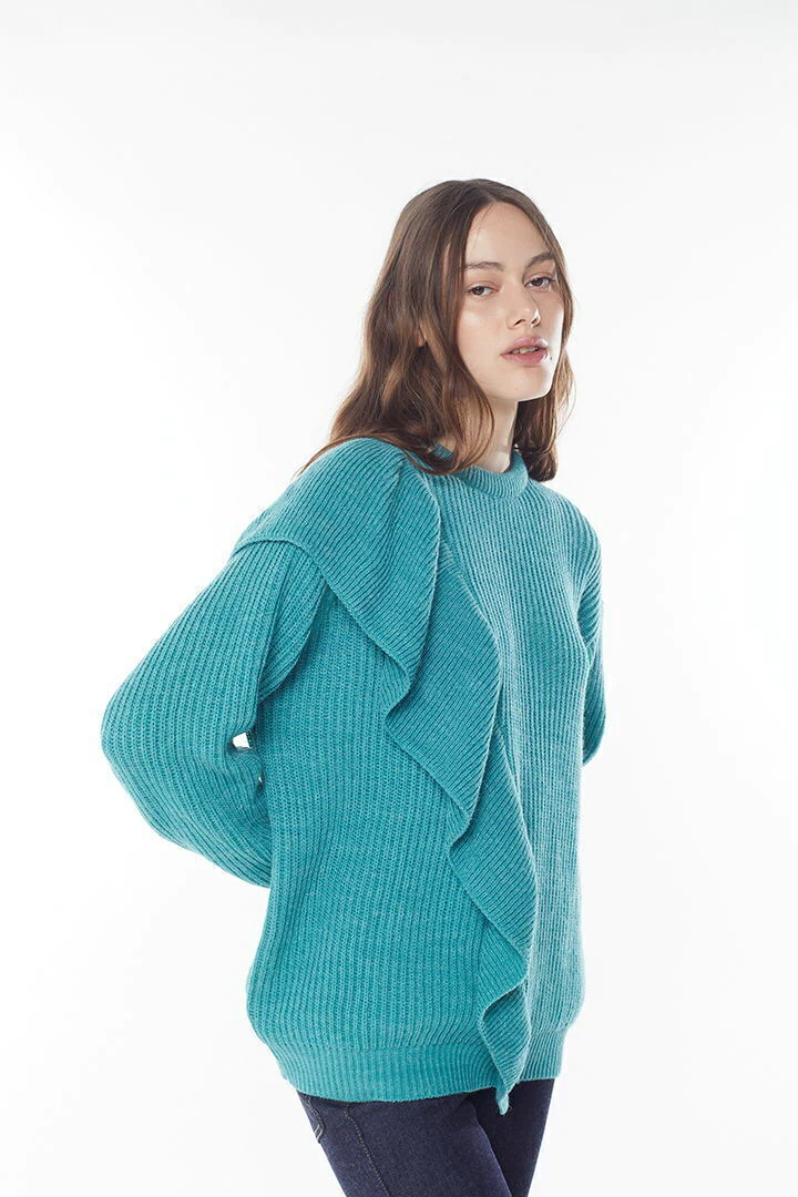 Sweater tejido escote redondo a la base con detalle de volado transversal y costura bajo hombro