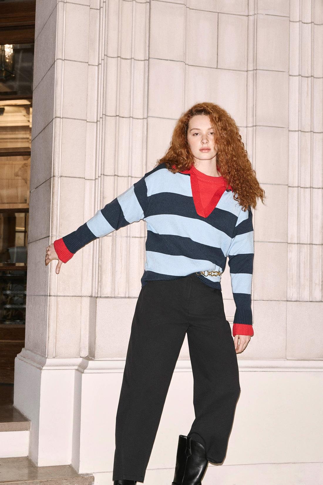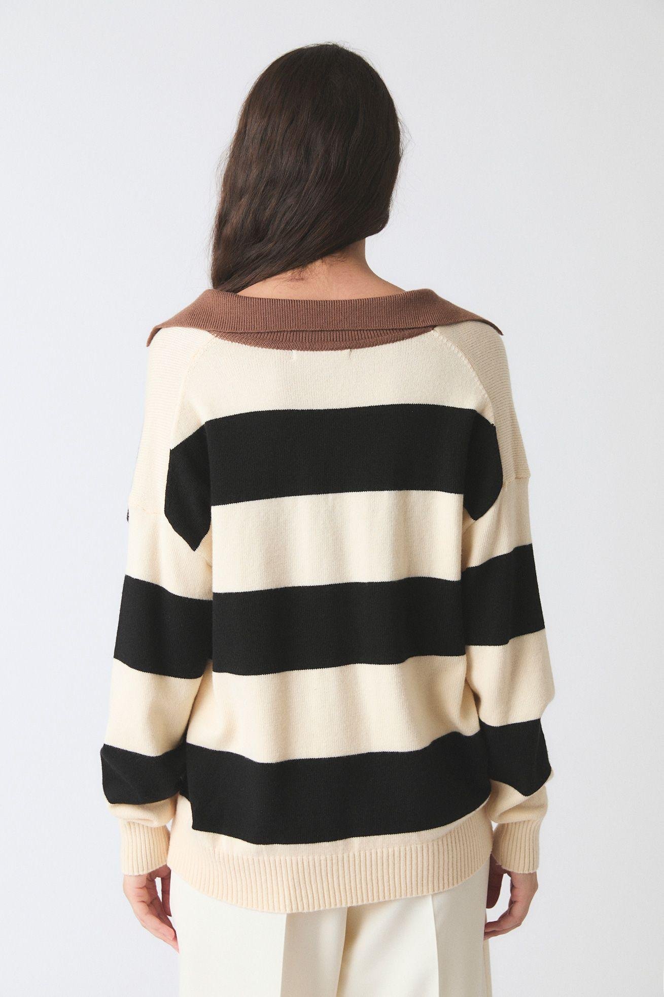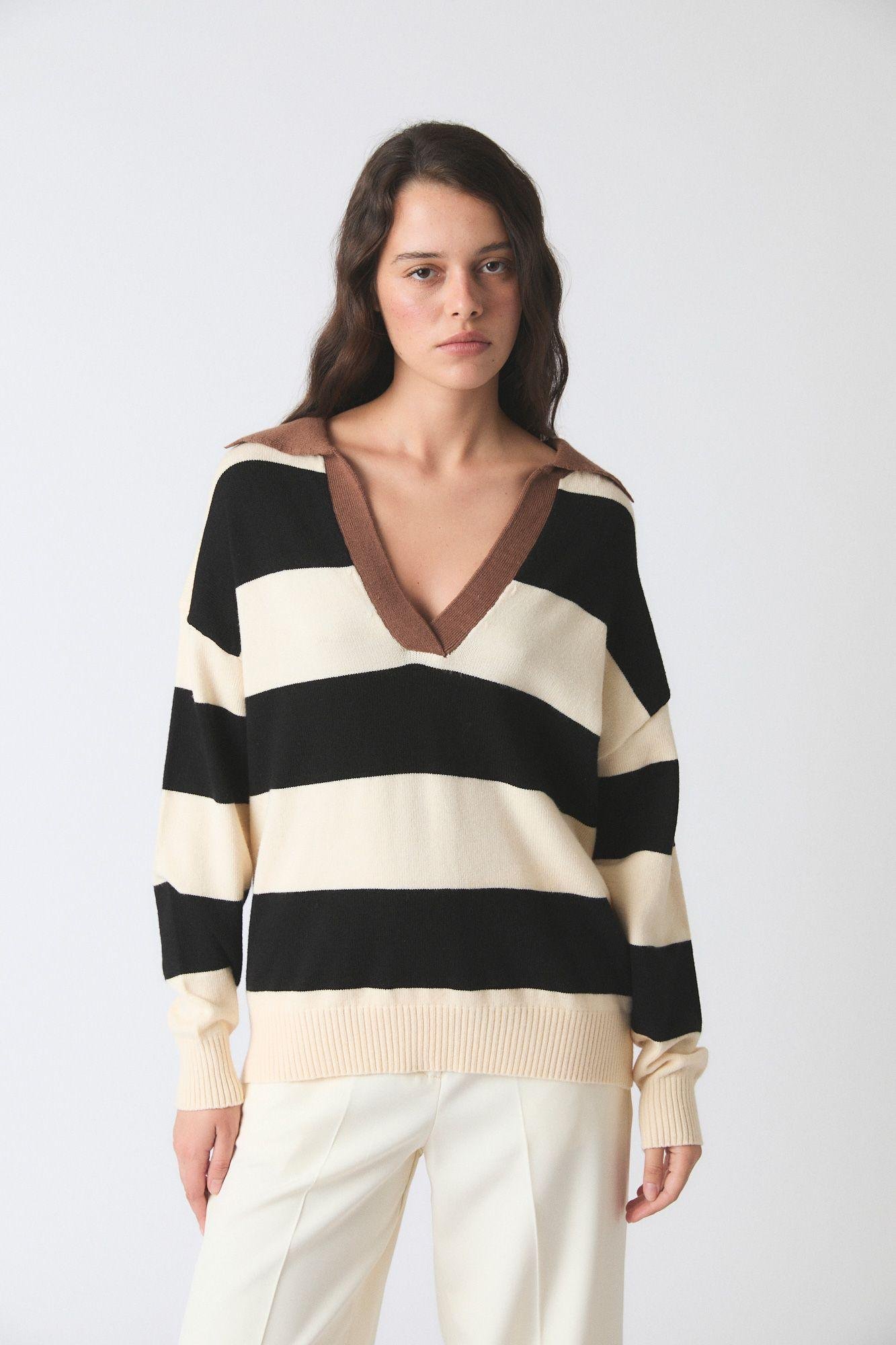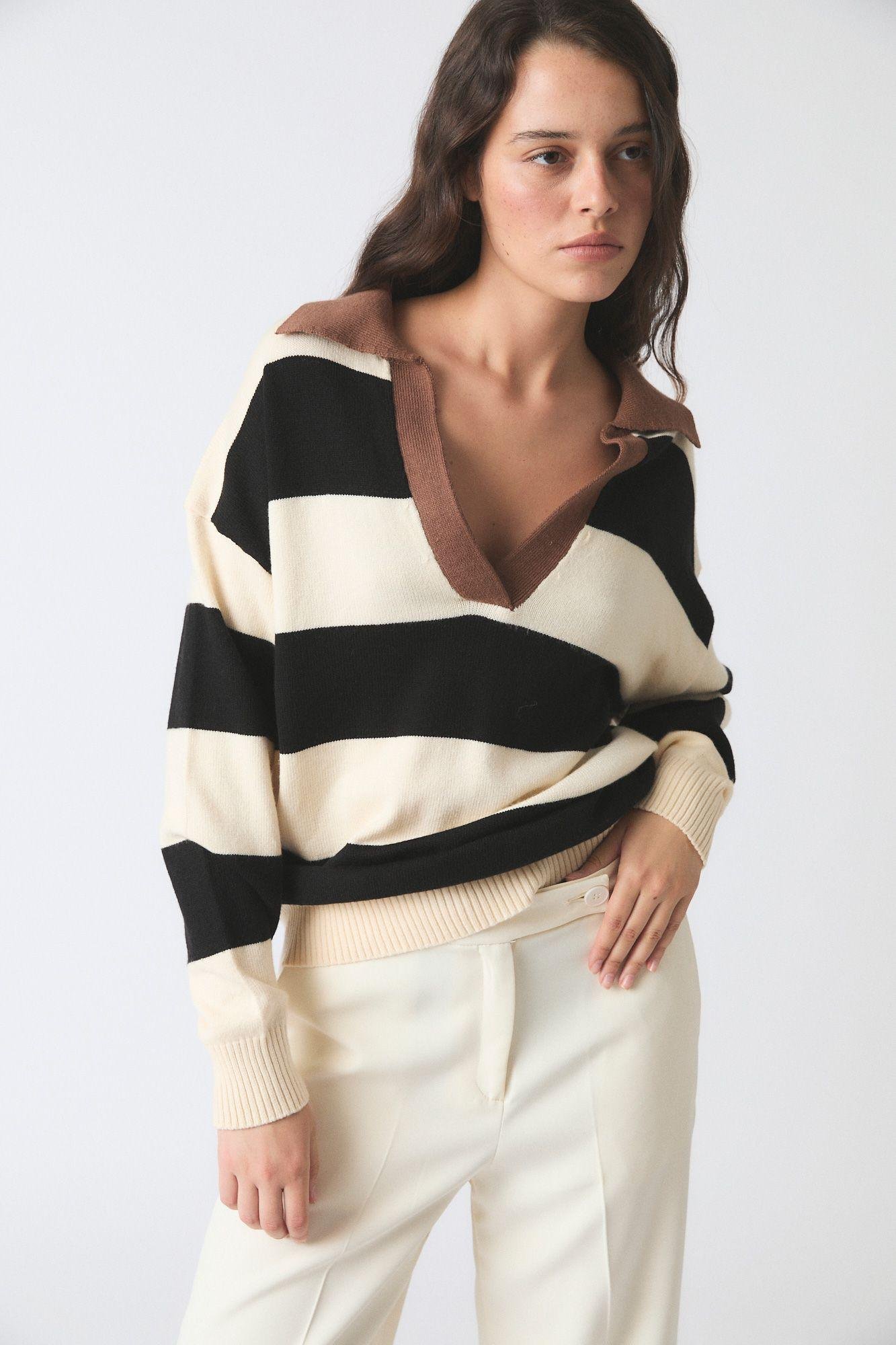 Chomba tejida en hilado de viscosa a rayas. Calce oversize de manga larga con hombros caídos. Escote delantero con cuello tipo polo sin avíos.