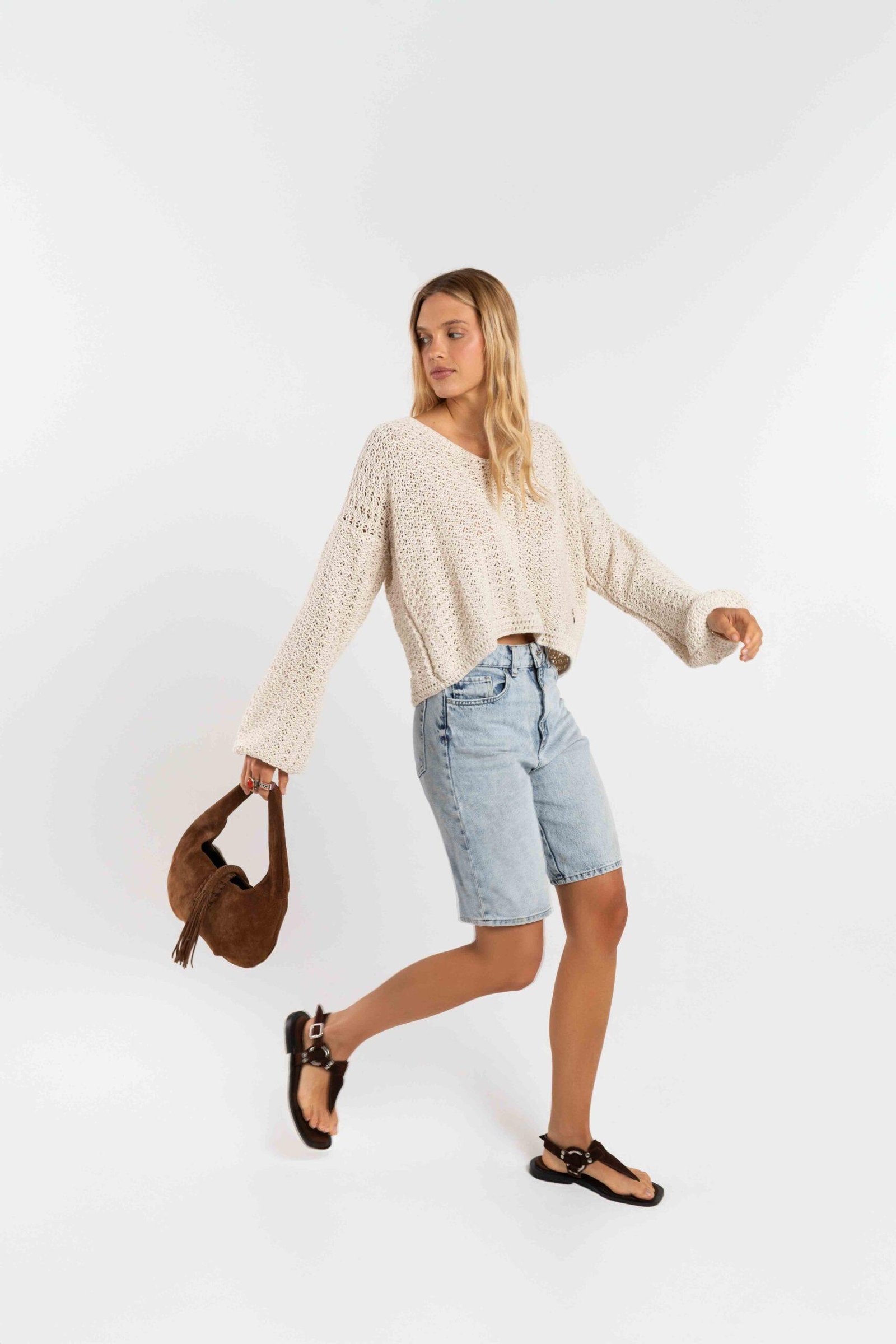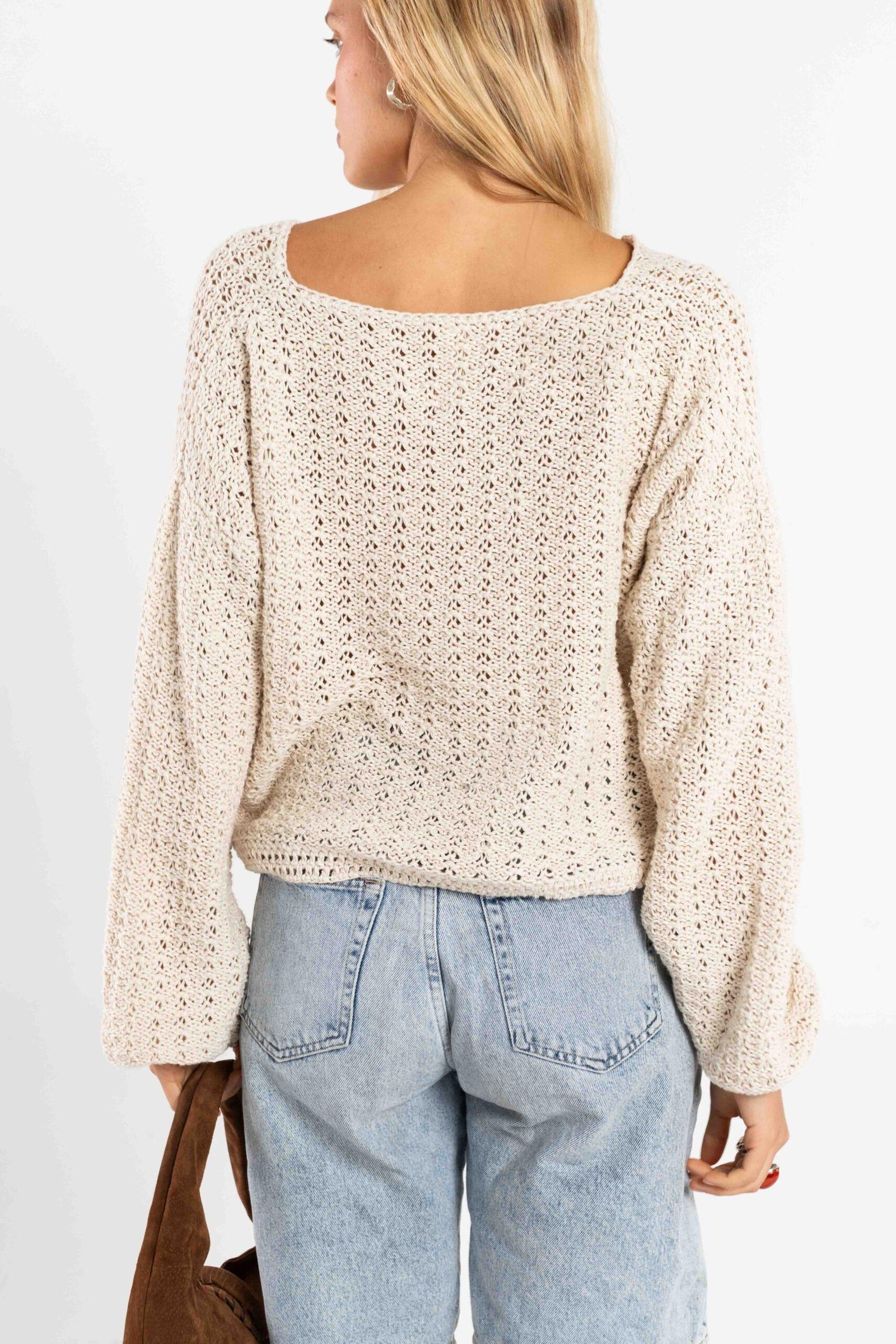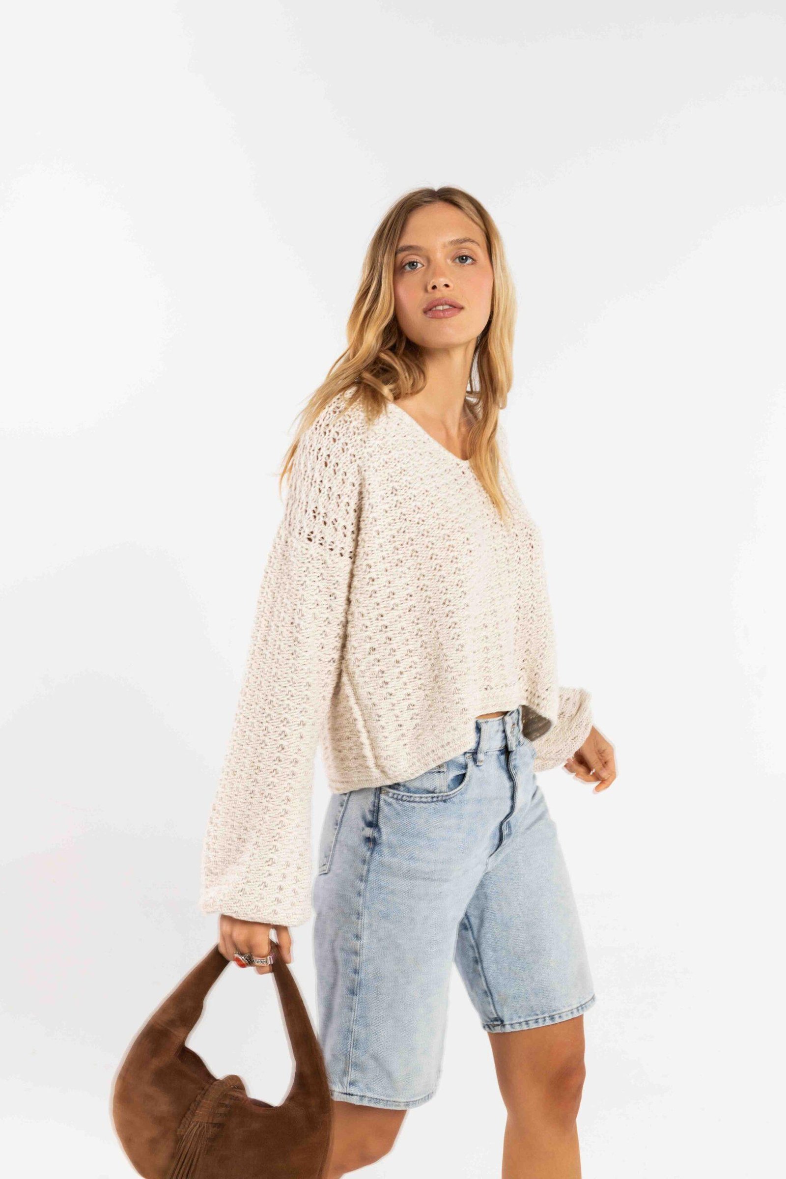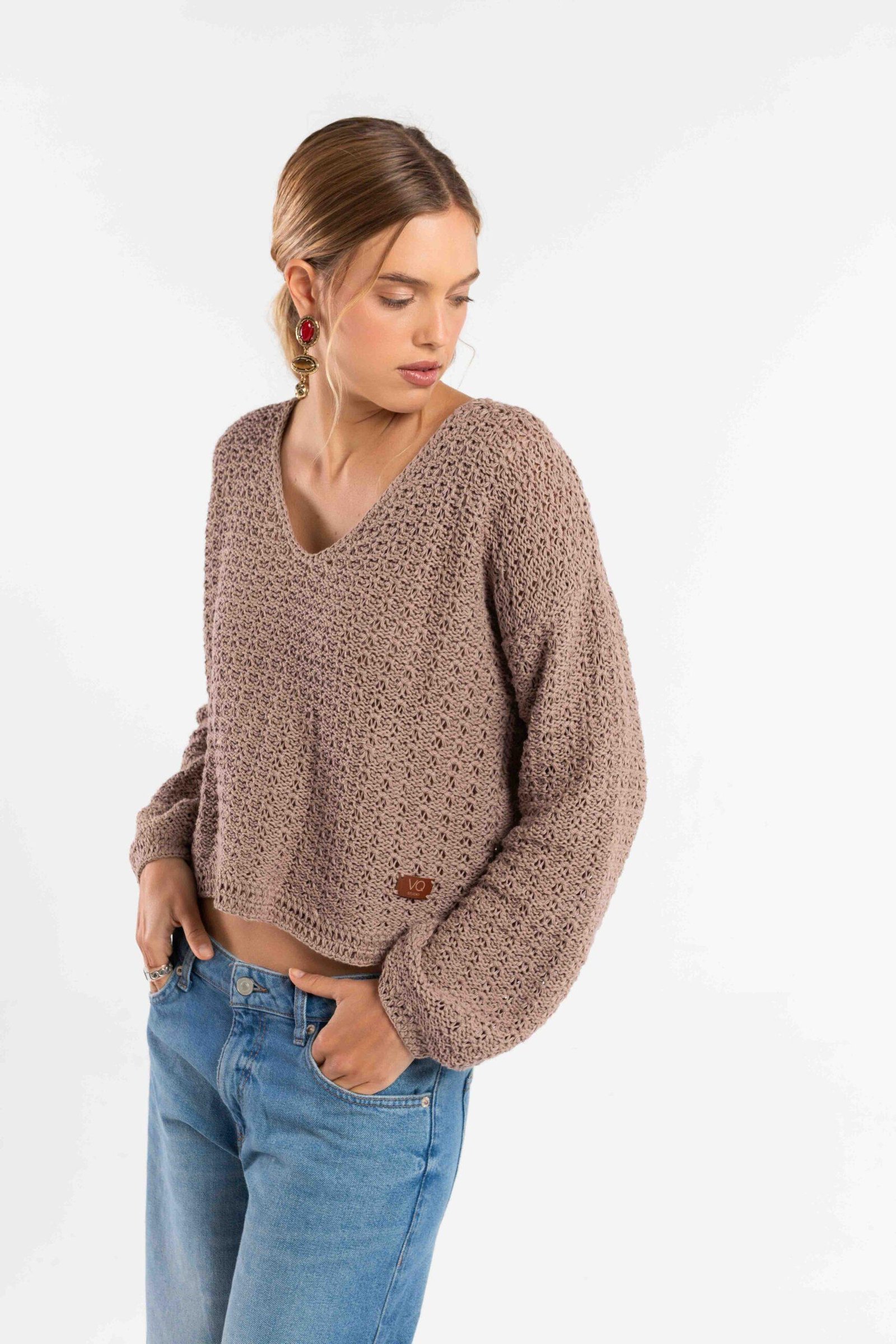 Sweater tejido en punto relieve y crochette varias cadenas con manga semi balloon