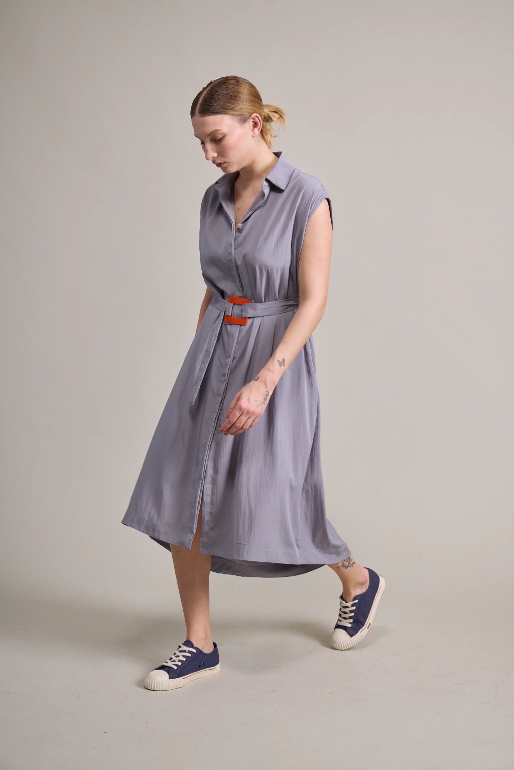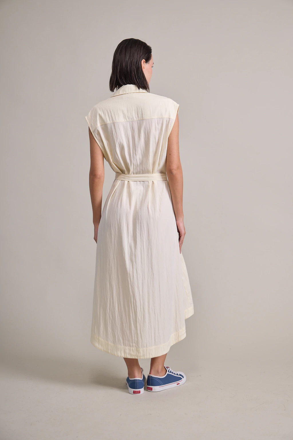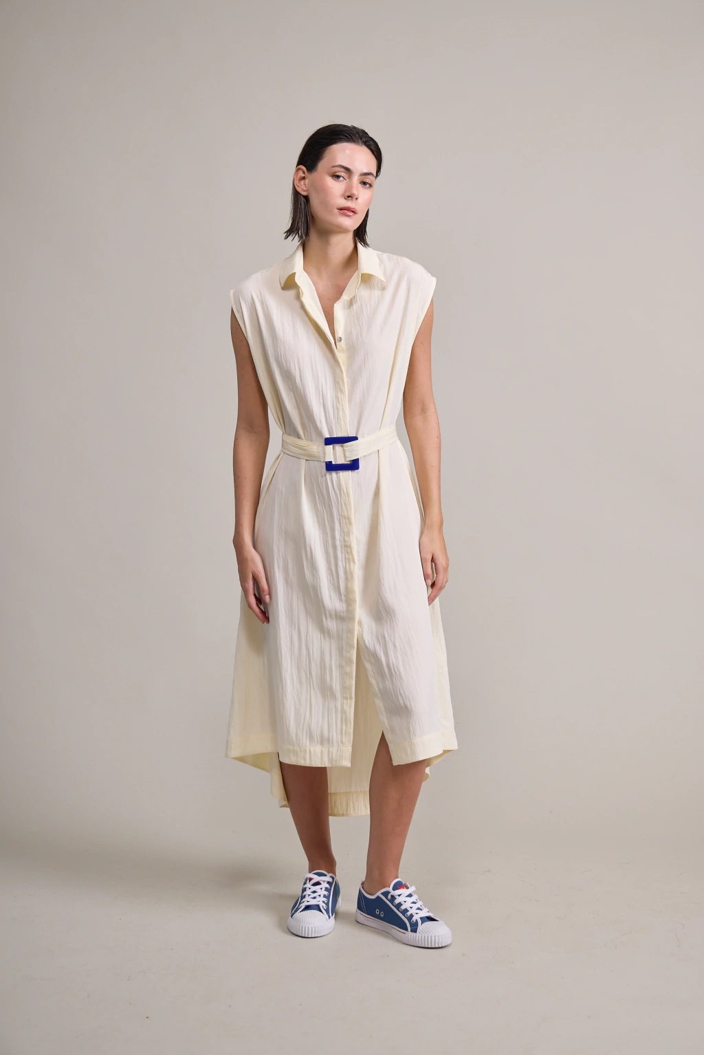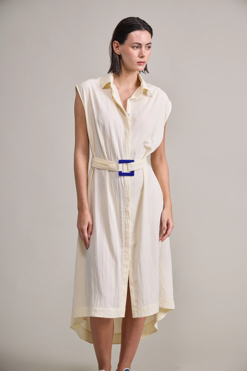 Vestido camisero irregular confeccionado en una viscosa con textura. Con bolsillos laterales y cinturón con hebilla de acrílico.