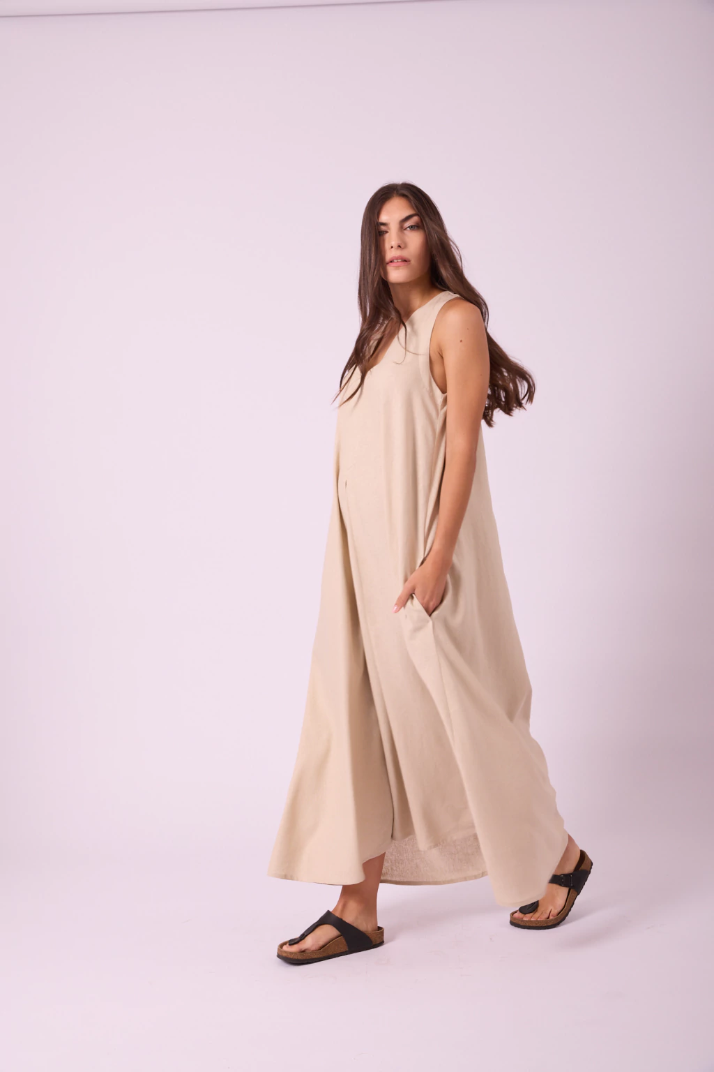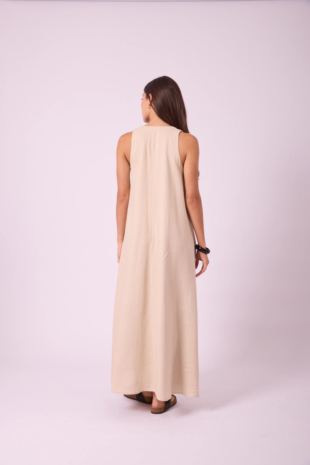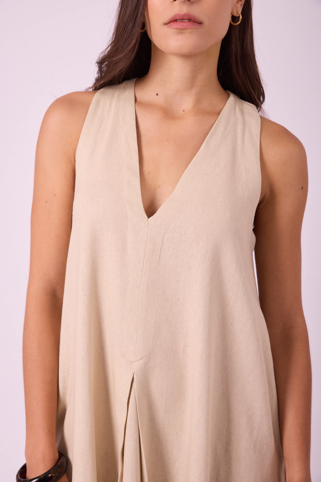 Vestido de lino escote en V con tabla en el frente y bolsillos laterales