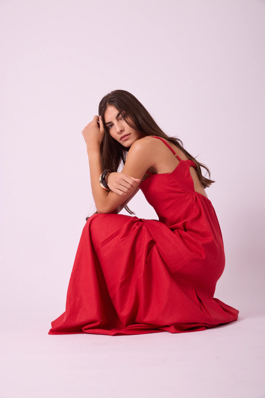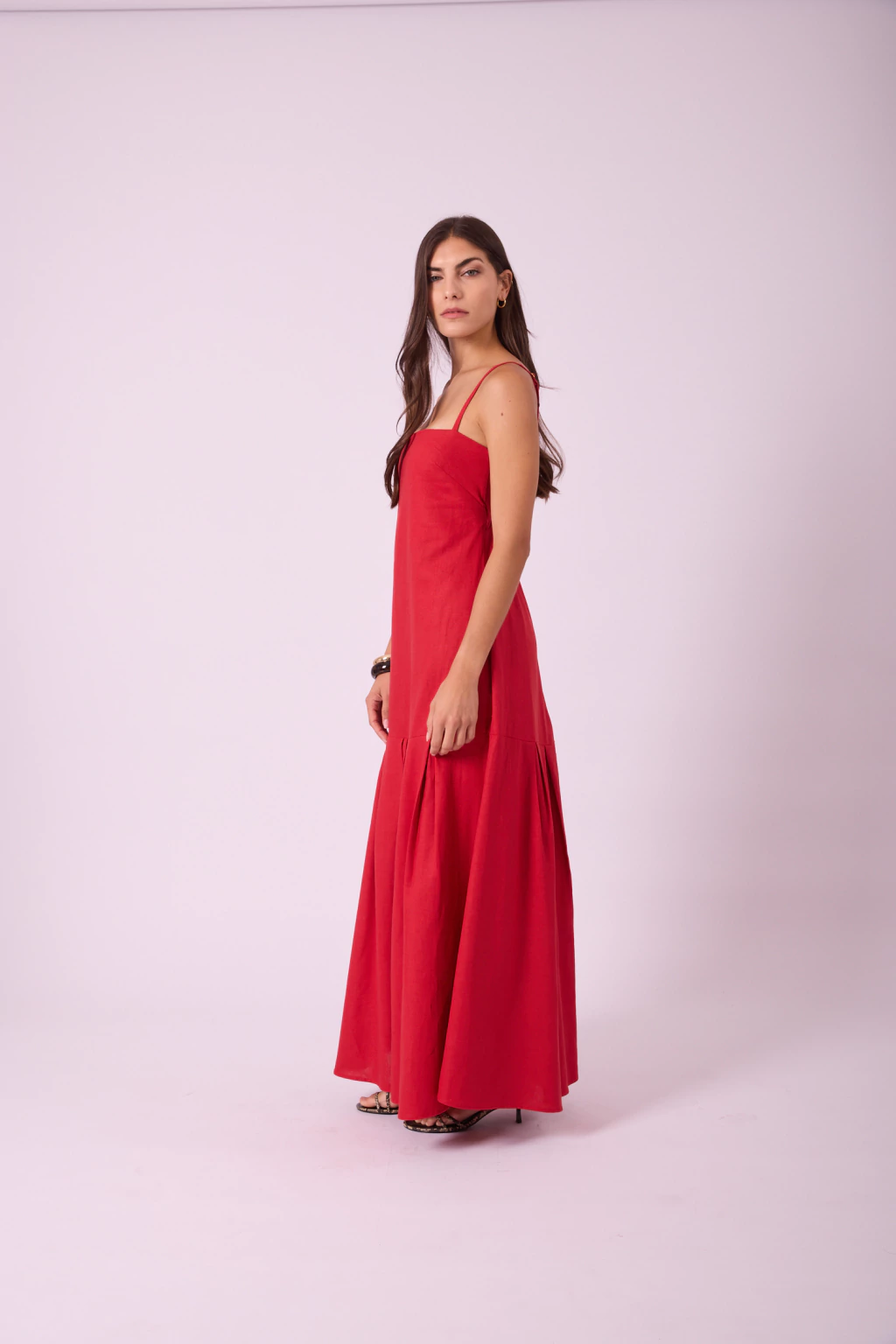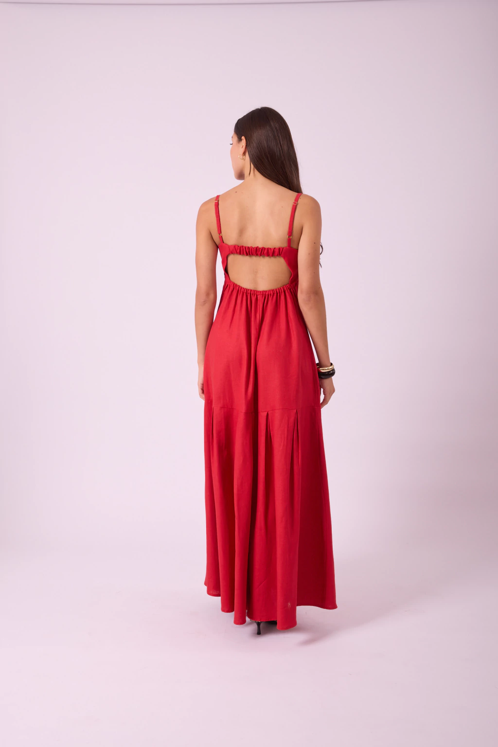 Vestido largo de lino escote cuadrado con tiras finas regulables, escote trasero semi descubierto con elástico que ajusta a mitad de espalda y tablas en largo